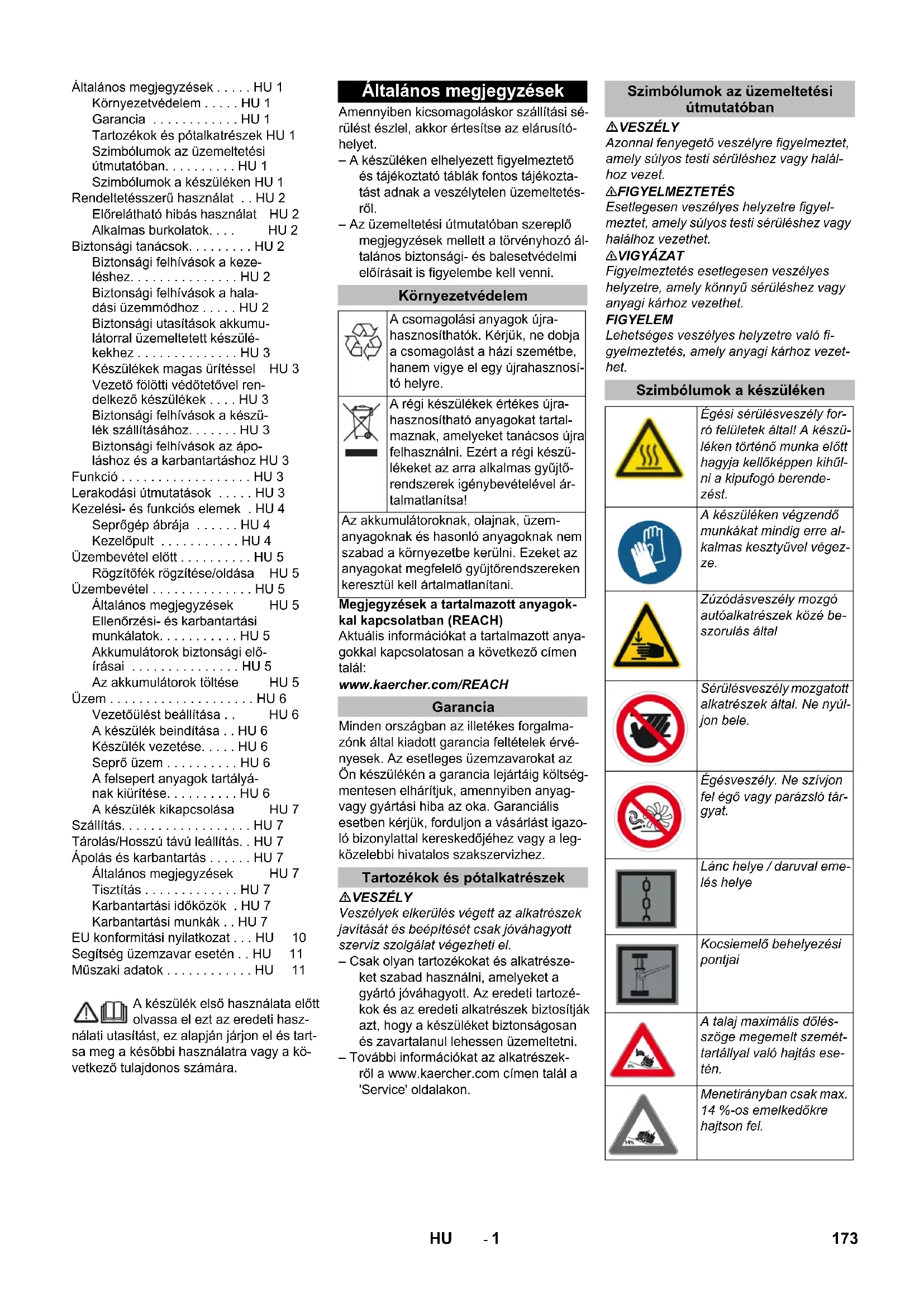 0,1 0,1 Размеры и массы Длина х ширина х высота mm 2082x1250x1450 2082x1250x1450 Радиус поворота вправо mm 1350 1350 Радиус поворота влево mm 1350 1350 Вес (без/с аккумулятором) kg 750/1200 750/1200 Допустимый общий вес kg 1620 1620 Допустимая нагрузка на ось спереди kg 797 797 Допустимая нагрузка на ось сзади kg 823 823 Изготовитель оставляет за собой право внесения технических изменений! 172 RU- 1 A készülék első használata előtt olvassa el ezt az eredeti hasz- nálati utasítást, ez alapján járjon el és tart- sa meg a későbbi használatra vagy a kö- vetkező tulajdonos számára. Amennyiben kicsomagoláskor szállítási sé- rülést észlel, akkor értesítse az elárusító- helyet. – A készüléken elhelyezett figyelmeztető és tájékoztató táblák fontos tájékozta- tást adnak a veszélytelen üzemeltetés- ről. – Az üzemeltetési útmutatóban szereplő megjegyzések mellett a törvényhozó ál- talános biztonsági- és balesetvédelmi előírásait is figyelembe kell venni. Megjegyzések a tartalmazott anyagok- kal kapcsolatban (REACH) Aktuális információkat a tartalmazott anya- gokkal kapcsolatosan a következő címen talál: www.kaercher.com/REACH Minden országban az illetékes forgalma- zónk által kiadott garancia feltételek érvé- nyesek. Az esetleges üzemzavarokat az Ön készülékén a garancia lejártáig költség- mentesen elhárítjuk, amennyiben anyag- vagy gyártási hiba az oka. Garanciális esetben kérjük, forduljon a vásárlást igazo- ló bizonylattal kereskedőjéhez vagy a leg- közelebbi hivatalos szakszervizhez. VESZÉLY Veszélyek elkerülés végett az alkatrészek javítását és beépítését csak jóváhagyott szerviz szolgálat végezheti el. – Csak olyan tartozékokat és alkatrésze- ket szabad használni, amelyeket a gyártó jóváhagyott. Az eredeti tartozé- kok és az eredeti alkatrészek biztosítják azt, hogy a készüléket biztonságosan és zavartalanul lehessen üzemeltetni. – További információkat az alkatrészek- ről a www.kaercher.com címen talál a 'Service' oldalakon. VESZÉLY Azonnal fenyegető veszélyre figyelmeztet, amely súlyos testi sérüléshez vagy halál- hoz vezet. 몇 FIGYELMEZTETÉS Esetlegesen veszélyes helyzetre figyel- meztet, amely súlyos testi sérüléshez vagy halálhoz vezethet. 몇 VIGYÁZAT Figyelmeztetés esetlegesen veszélyes helyzetre, amely könnyű sérüléshez vagy anyagi kárhoz vezethet. FIGYELEM Lehetséges veszélyes helyzetre való fi- gyelmeztetés, amely anyagi kárhoz vezet- het. Általános megjegyzések . . . . . HU 1 Környezetvédelem . . . . . HU 1 Garancia . . . . . . . . . . . . HU 1 Tartozékok és pótalkatrészek HU 1 Szimbólumok az üzemeltetési útmutatóban. . . . . . . . . . HU 1 Szimbólumok a készüléken HU 1 Rendeltetésszerű használat . . HU 2 Előrelátható hibás használat HU 2 Alkalmas burkolatok. . . . HU 2 Biztonsági tanácsok. . . . . . . . . HU 2 Biztonsági felhívások a keze- léshez. . . . . . . . . . . . . . . HU 2 Biztonsági felhívások a hala- dási üzemmódhoz . . . . . HU 2 Biztonsági utasítások akkumu- látorral üzemeltetett készülé- kekhez . . . . . . . . . . . . . . HU 3 Készülékek magas ürítéssel HU 3 Vezető fölötti védőtetővel ren- delkező készülékek . . . . HU 3 Biztonsági felhívások a készü- lék szállításához. . . . . . . HU 3 Biztonsági felhívások az ápo- láshoz és a karbantartáshoz HU 3 Funkció . . . . . . . . . . . . . . . . . . HU 3 Lerakodási útmutatások . . . . . HU 3 Kezelési- és funkciós elemek . HU 4 Seprőgép ábrája . . . . . . HU 4 Kezelőpult . . . . . . . . . . . HU 4 Üzembevétel előtt . . . . . . . . . . HU 5 Rögzítőfék rögzítése/oldása HU 5 Üzembevétel . . . . . . . . . . . . . . HU 5 Általános megjegyzések HU 5 Ellenőrzési- és karbantartási munkálatok. . . . . . . . . . . HU 5 Akkumulátorok biztonsági elő- írásai . . . . . . . . . . . . . . . HU 5 Az akkumulátorok töltése HU 5 Üzem . . . . . . . . . . . . . . . . . . . . HU 6 Vezetőülést beállítása . . HU 6 A készülék beindítása . . HU 6 Készülék vezetése. . . . . HU 6 Seprő üzem . . . . . . . . . . HU 6 A felsepert anyagok tartályá- nak kiürítése. . . . . . . . . . HU 6 A készülék kikapcsolása HU 7 Szállítás. . . . . . . . . . . . . . . . . . HU 7 Tárolás/Hosszú távú leállítás. . HU 7 Ápolás és karbantartás . . . . . . HU 7 Általános megjegyzések HU 7 Tisztítás . . . . . . . . . . . . . HU 7 Karbantartási időközök . HU 7 Karbantartási munkák . . HU 7 EU konformitási nyilatkozat . . . HU 10 Segítség üzemzavar esetén . . HU 11 Műszaki adatok . . . . . . . . . . . . HU 11 Általános megjegyzések Környezetvédelem A csomagolási anyagok újra- hasznosíthatók. Kérjük, ne dobja a csomagolást a házi szemétbe, hanem vigye el egy újrahasznosí- tó helyre. A régi készülékek értékes újra- hasznosítható anyagokat tartal- maznak, amelyeket tanácsos újra felhasználni. Ezért a régi készü- lékeket az arra alkalmas gyűjtő- rendszerek igénybevételével ár- talmatlanítsa! Az akkumulátoroknak, olajnak, üzem- anyagoknak és hasonló anyagoknak nem szabad a környezetbe kerülni. Ezeket az anyagokat megfelelő gyűjtőrendszereken keresztül kell ártalmatlanítani. Garancia Tartozékok és pótalkatrészek Szimbólumok az üzemeltetési útmutatóban Szimbólumok a készüléken Égési sérülésveszély for- ró felületek által! A készü- léken történő munka előtt hagyja kellőképpen kihűl- ni a kipufogó berende- zést. A készüléken végzendő munkákat mindig erre al- kalmas kesztyűvel végez- ze. Zúzódásveszély mozgó autóa