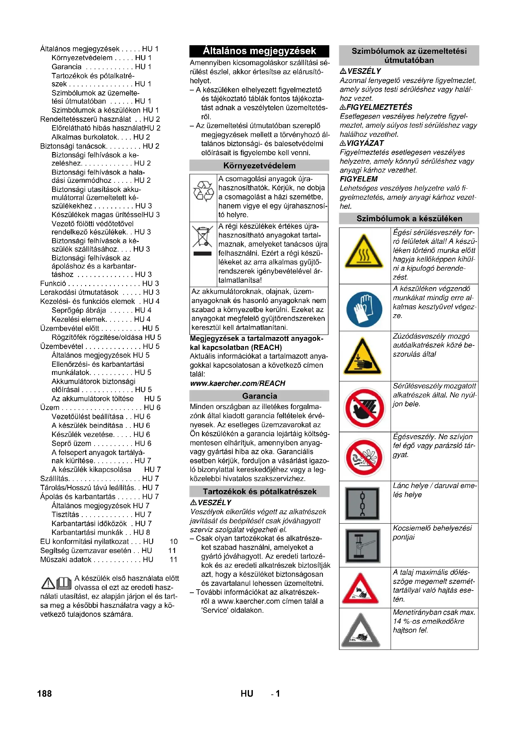 0,1 0,1 Размеры и массы Длина х ширина х высота mm 1847 x 1065 x 1388 1847 x 1065 x 1388 Радиус поворота вправо mm 2470 2470 Радиус поворота влево mm 2470 2470 Вес (без/с аккумулятором) kg 560/860 560/860 Допустимый общий вес kg 1224 1224 Допустимая нагрузка на ось спереди kg 734 734 Допустимая нагрузка на ось сзади kg 490 490 Изготовитель оставляет за собой право внесения технических изменений! 187RU- 1 A készülék első használata előtt olvassa el ezt az eredeti hasz- nálati utasítást, ez alapján járjon el és tart- sa meg a későbbi használatra vagy a kö- vetkező tulajdonos számára. Amennyiben kicsomagoláskor szállítási sé- rülést észlel, akkor értesítse az elárusító- helyet. – A készüléken elhelyezett figyelmeztető és tájékoztató táblák fontos tájékozta- tást adnak a veszélytelen üzemeltetés- ről. – Az üzemeltetési útmutatóban szereplő megjegyzések mellett a törvényhozó ál- talános biztonsági- és balesetvédelmi előírásait is figyelembe kell venni. Megjegyzések a tartalmazott anyagok- kal kapcsolatban (REACH) Aktuális információkat a tartalmazott anya- gokkal kapcsolatosan a következő címen talál: www.kaercher.com/REACH Minden országban az illetékes forgalma- zónk által kiadott garancia feltételek érvé- nyesek. Az esetleges üzemzavarokat az Ön készülékén a garancia lejártáig költség- mentesen elhárítjuk, amennyiben anyag- vagy gyártási hiba az oka. Garanciális esetben kérjük, forduljon a vásárlást igazo- ló bizonylattal kereskedőjéhez vagy a leg- közelebbi hivatalos szakszervizhez. VESZÉLY Veszélyek elkerülés végett az alkatrészek javítását és beépítését csak jóváhagyott szerviz szolgálat végezheti el. – Csak olyan tartozékokat és alkatrésze- ket szabad használni, amelyeket a gyártó jóváhagyott. Az eredeti tartozé- kok és az eredeti alkatrészek biztosítják azt, hogy a készüléket biztonságosan és zavartalanul lehessen üzemeltetni. – További információkat az alkatrészek- ről a www.kaercher.com címen talál a 'Service' oldalakon. VESZÉLY Azonnal fenyegető veszélyre figyelmeztet, amely súlyos testi sérüléshez vagy halál- hoz vezet. 몇 FIGYELMEZTETÉS Esetlegesen veszélyes helyzetre figyel- meztet, amely súlyos testi sérüléshez vagy halálhoz vezethet. 몇 VIGYÁZAT Figyelmeztetés esetlegesen veszélyes helyzetre, amely könnyű sérüléshez vagy anyagi kárhoz vezethet. FIGYELEM Lehetséges veszélyes helyzetre való fi- gyelmeztetés, amely anyagi kárhoz vezet- het. Általános megjegyzések . . . . . HU 1 Környezetvédelem . . . . . HU 1 Garancia . . . . . . . . . . . . HU 1 Tartozékok és pótalkatré- szek . . . . . . . . . . . . . . . . HU 1 Szimbólumok az üzemelte- tési útmutatóban . . . . . . HU 1 Szimbólumok a készüléken HU 1 Rendeltetésszerű használat . . HU 2 Előrelátható hibás használatHU 2 Alkalmas burkolatok. . . . HU 2 Biztonsági tanácsok. . . . . . . . . HU 2 Biztonsági felhívások a ke- zeléshez. . . . . . . . . . . . . HU 2 Biztonsági felhívások a hala- dási üzemmódhoz . . . . . HU 2 Biztonsági utasítások akku- mulátorral üzemeltetett ké- szülékekhez . . . . . . . . . . HU 3 Készülékek magas ürítésselHU 3 Vezető fölötti védőtetővel rendelkező készülékek. . HU 3 Biztonsági felhívások a ké- szülék szállításához. . . . HU 3 Biztonsági felhívások az ápoláshoz és a karbantar- táshoz . . . . . . . . . . . . . . HU 3 Funkció . . . . . . . . . . . . . . . . . . HU 3 Lerakodási útmutatások . . . . . HU 3 Kezelési- és funkciós elemek . HU 4 Seprőgép ábrája . . . . . . HU 4 Kezelési elemek. . . . . . . HU 4 Üzembevétel előtt . . . . . . . . . . HU 5 Rögzítőfék rögzítése/oldása HU 5 Üzembev étel . . . . . . . . . . . . . . HU 5 Általános megjegyzések HU 5 Ellenőrzési- és karbantartási munkálatok. . . . . . . . . . . HU 5 Akkumulátorok biztonsági előírásai . . . . . . . . . . . . . HU 5 Az akkumulátorok töltése HU 5 Üzem . . . . . . . . . . . . . . . . . . . . HU 6 Vezetőülést beállítása . . HU 6 A készülék beindítása . . HU 6 Készülék vezetése. . . . . HU 6 Seprő üzem . . . . . . . . . . HU 6 A felsepert anyagok tartályá- nak kiürítése. . . . . . . . . . HU 7 A készülék kikapcsolása HU 7 Szállítás. . . . . . . . . . . . . . . . . . HU 7 Tárolás/Hosszú távú leállítás. . HU 7 Ápolás és karbantartás . . . . . . HU 7 Általános megjegyzések HU 7 Tisztítás . . . . . . . . . . . . . HU 7 Karbantartási időközök . HU 7 Karbantartási munkák . . HU 8 EU konformitási nyilatkozat . . . HU 10 Segítség üzemzavar esetén . . HU 11 Műszaki adatok . . . . . . . . . . . . HU 11 Általános megjegyzések Környezetvédelem A csomagolási anyagok újra- hasznosíthatók. Kérjük, ne dobja a csomagolást a házi szemétbe, hanem vigye el egy újrahasznosí- tó helyre. A régi készülékek értékes újra- hasznosítható anyagokat tartal- maznak, amelyeket tanácsos újra felhasználni. Ezért a régi készü- lékeket az arra alkalmas gyűjtő- rendszerek igénybevételével ár- talmatlanítsa! Az akkumulátoroknak, olajnak, üzem- anyagoknak és hasonló anyagoknak nem szabad a környezetbe kerülni. Ezeket az anyagokat megfelelő gyűjtőrendszereken keresztül kell ártalmatlanítani. Garancia Tartozékok és pótalkatrészek Szimbólumok az üzemeltetési útmutatóban Szimbólumok a készüléken Égési sérülésveszély for- ró felületek által! A készü- léken történő munka előtt hagyja kellőképpen kihűl- ni a kipufogó berende- zést. A készüléken végzendő munkákat mindig erre al- kalmas kesztyűvel végez- ze. Zúzó