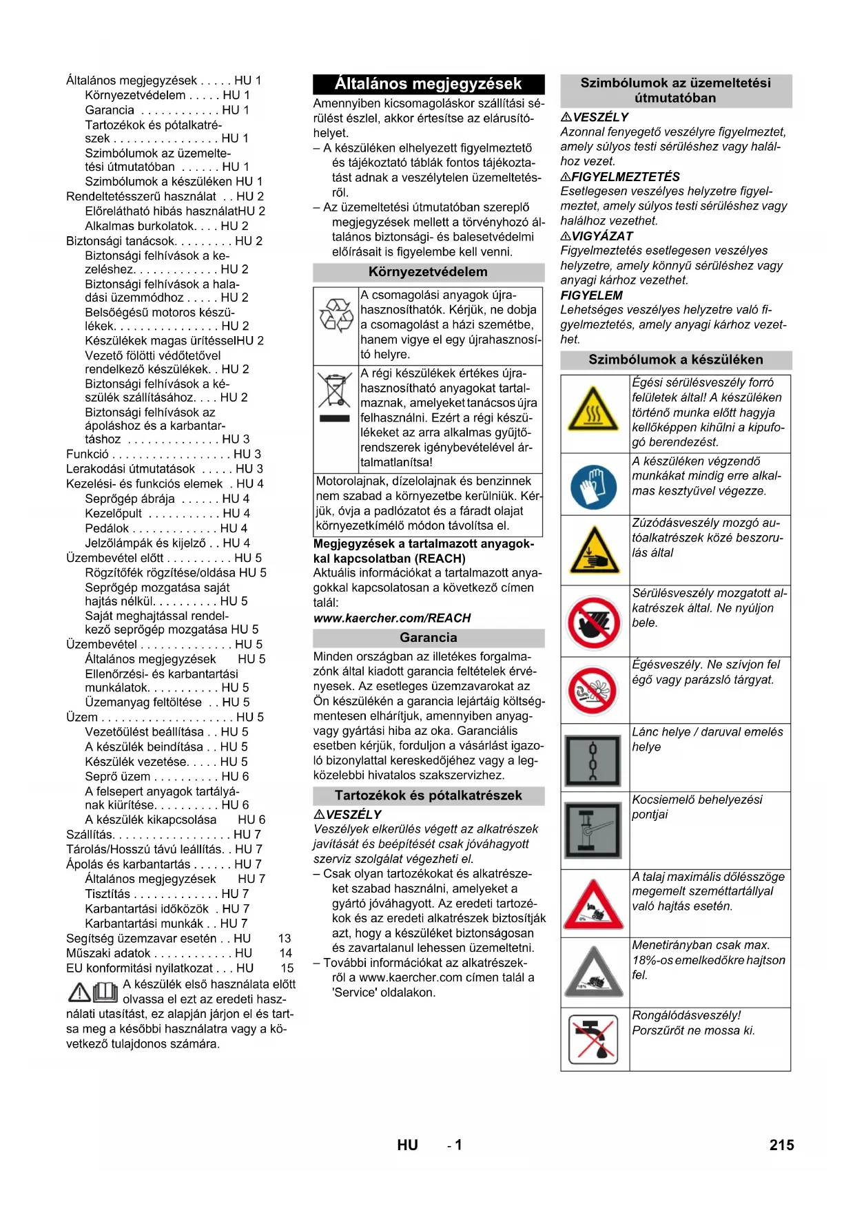 2000/14/ЕС: Приложение V Уровень мощности звука дБ(A) Измерено: 96 Гарантировано: 98 Chairman of the Board of Management Director Regulatory Affairs & Certification 214 RU- 1 A készülék első használata előtt olvassa el ezt az eredeti hasz- nálati utasítást, ez alapján járjon el és tart- sa meg a későbbi használatra vagy a kö- vetkező tulajdonos számára. Amennyiben kicsomagoláskor szállítási sé- rülést észlel, akkor értesítse az elárusító- helyet. – A készüléken elhelyezett figyelmeztető és tájékoztató táblák fontos tájékozta- tást adnak a veszélytelen üzemeltetés- ről. – Az üzemeltetési útmutatóban szereplő megjegyzések mellett a törvényhozó ál- talános biztonsági- és balesetvédelmi előírásait is figyelembe kell venni. Megjegyzések a tartalmazott anyagok- kal kapcsolatban (REACH) Aktuális információkat a tartalmazott anya- gokkal kapcsolatosan a következő címen talál: www.kaercher.com/REACH Minden országban az illetékes forgalma- zónk által kiadott garancia feltételek érvé- nyesek. Az esetleges üzemzavarokat az Ön készülékén a garancia lejártáig költség- mentesen elhárítjuk, amennyiben anyag- vagy gyártási hiba az oka. Garanciális esetben kérjük, forduljon a vásárlást igazo- ló bizonylattal kereskedőjéhez vagy a leg- közelebbi hivatalos szakszervizhez. VESZÉLY Veszélyek elkerülés végett az alkatrészek javítását és beépítését csak jóváhagyott szerviz szolgálat végezheti el. – Csak olyan tartozékokat és alkatrésze- ket szabad használni, amelyeket a gyártó jóváhagyott. Az eredeti tartozé- kok és az eredeti alkatrészek biztosítják azt, hogy a készüléket biztonságosan és zavartalanul lehessen üzemeltetni. – További információkat az alkatrészek- ről a www.kaercher.com címen talál a 'Service' oldalakon. VESZÉLY Azonnal fenyegető veszélyre figyelmeztet, amely súlyos testi sérüléshez vagy halál- hoz vezet. 몇 FIGYELMEZTETÉS Esetlegesen veszélyes helyzetre figyel- meztet, amely súlyos testi sérüléshez vagy halálhoz vezethet. 몇 VIGYÁZAT Figyelmeztetés esetlegesen veszélyes helyzetre, amely könnyű sérüléshez vagy anyagi kárhoz vezethet. FIGYELEM Lehetséges veszélyes helyzetre való fi- gyelmeztetés, amely anyagi kárhoz vezet- het. Általános megjegyzések . . . . . HU 1 Környezetvédelem . . . . . HU 1 Garancia . . . . . . . . . . . . HU 1 Tartozékok és pótalkatré- szek . . . . . . . . . . . . . . . . HU 1 Szimbólumok az üzemelte- tési útmutatóban . . . . . . HU 1 Szimbólumok a készüléken HU 1 Rendeltetésszerű használat . . HU 2 Előrelátható hibás használatHU 2 Alkalmas burkolatok. . . . HU 2 Biztonsági tanácsok. . . . . . . . . HU 2 Biztonsági felhívások a ke- zeléshez. . . . . . . . . . . . . HU 2 Biztonsági felhívások a hala- dási üzemmódhoz . . . . . HU 2 Belsőégésű motoros készü- lékek. . . . . . . . . . . . . . . . HU 2 Készülékek magas ürítésselHU 2 Vezető fölötti védőtetővel rendelkező készülékek. . HU 2 Biztonsági felhívások a ké- szülék szállításához. . . . HU 2 Biztonsági felhívások az ápoláshoz és a karbantar- táshoz . . . . . . . . . . . . . . HU 3 Funkció . . . . . . . . . . . . . . . . . . HU 3 Lerakodási útmutatások . . . . . HU 3 Kezelési- és funkciós elemek . HU 4 Seprőgép ábrája . . . . . . HU 4 Kezelőpult . . . . . . . . . . . HU 4 Pedálok . . . . . . . . . . . . . HU 4 Jelzőlámpák és kijelző . . HU 4 Üzembevétel előtt . . . . . . . . . . HU 5 Rögzítőfék rögzítése/oldása HU 5 Seprőgép mozgatása saját hajtás nélkül. . . . . . . . . . HU 5 Saját meghajtással rendel- kező seprőgép mozgatása HU 5 Üzembevétel . . . . . . . . . . . . . . HU 5 Általános megjegyzések HU 5 Ellenőrzési- és karbantartási munkálatok. . . . . . . . . . . HU 5 Üzemanyag feltöltése . . HU 5 Üzem . . . . . . . . . . . . . . . . . . . . HU 5 Vezetőülést beállítása . . HU 5 A készülék beindítása . . HU 5 Készülék vezetése. . . . . HU 5 Seprő üzem . . . . . . . . . . HU 6 A felsepert anyagok tartályá- nak kiürítése. . . . . . . . . . HU 6 A készülék kikapcsolása HU 6 Szállítás. . . . . . . . . . . . . . . . . . HU 7 Tárolás/Hosszú távú leállítás. . HU 7 Ápolás és karbantartás . . . . . . HU 7 Általános megjegyzések HU 7 Tisztítás . . . . . . . . . . . . . HU 7 Karbantartási időközök . HU 7 Karbantartási munkák . . HU 7 Segítség üzemzavar esetén . . HU 13 Műszaki adatok . . . . . . . . . . . . HU 14 EU konformitási nyilatkozat . . . HU 15 Általános megjegyzések Környezetvédelem A csomagolási anyagok újra- hasznosíthatók. Kérjük, ne dobja a csomagolást a házi szemétbe, hanem vigye el egy újrahasznosí- tó helyre. A régi készülékek értékes újra- hasznosítható anyagokat tartal- maznak, amelyeket tanácsos újra felhasználni. Ezért a régi készü- lékeket az arra alkalmas gyűjtő- rendszerek igénybevételével ár- talmatlanítsa! Motorolajnak, dízelolajnak és benzinnek nem szabad a környezetbe kerülniük. Kér- jük, óvja a padlózatot és a fáradt olajat környezetkímélő módon távolítsa el. Garancia Tartozékok és pótalkatrészek Szimbólumok az üzemeltetési útmutatóban Szimbólumok a készüléken Égési sérülésveszély forró felületek által! A készüléken történő munka előtt hagyja kellőképpen kihűlni a kipufo- gó berendezést. A készüléken végzendő munkákat mindig erre alkal- mas kesztyűvel végezze. Zúzódásveszély mozgó au- tóalkatrészek közé beszoru- lás által Sérülésveszély mozgatott al- katrészek által. Ne nyúljon bele. Égésveszély. Ne szívjon fel égő vagy parázsló tárgyat. Lánc helye / daruval emelés helye Kocsiemelő behelyezési pontjai A talaj maximális dőlésszöge megemelt szemé