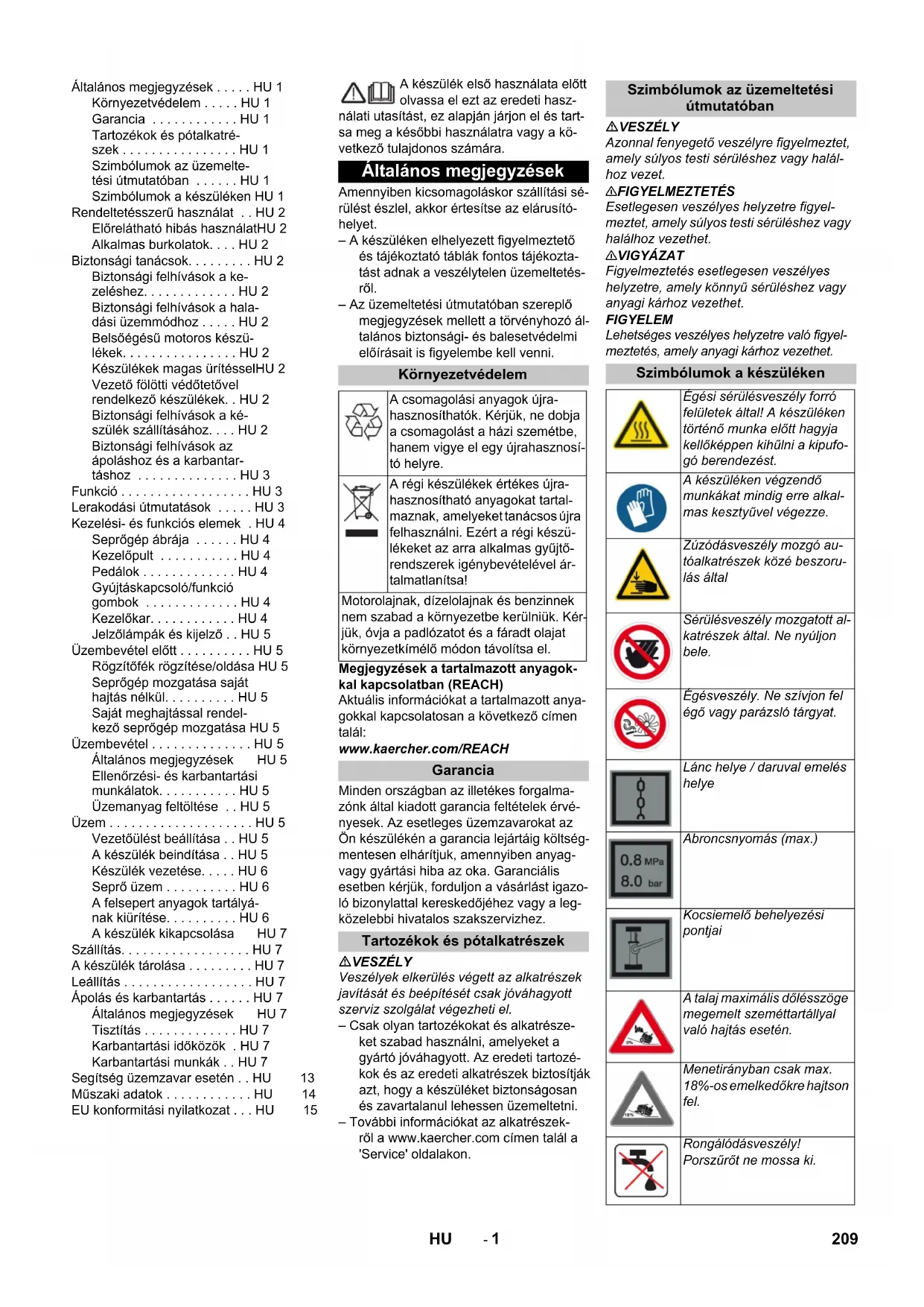 2000/14/ЕС: Приложение V Уровень мощности звука дБ(A) Измерено: 99 Гарантировано: 102 Chairman of the Board of Management Director Regulatory Affairs & Certification 208 RU- 1 A készülék első használata előtt olvassa el ezt az eredeti hasz- nálati utasítást, ez alapján járjon el és tart- sa meg a későbbi használatra vagy a kö- vetkező tulajdonos számára. Amennyiben kicsomagoláskor szállítási sé- rülést észlel, akkor értesítse az elárusító- helyet. – A készüléken elhelyezett figyelmeztető és tájékoztató táblák fontos tájékozta- tást adnak a veszélytelen üzemeltetés- ről. – Az üzemeltetési útmutatóban szereplő megjegyzések mellett a törvényhozó ál- talános biztonsági- és balesetvédelmi előírásait is figyelembe kell venni. Megjegyzések a tartalmazott anyagok- kal kapcsolatban (REACH) Aktuális információkat a tartalmazott anya- gokkal kapcsolatosan a következő címen talál: www.kaercher.com/REACH Minden országban az illetékes forgalma- zónk által kiadott garancia feltételek érvé- nyesek. Az esetleges üzemzavarokat az Ön készülékén a garancia lejártáig költség- mentesen elhárítjuk, amennyiben anyag- vagy gyártási hiba az oka. Garanciális esetben kérjük, forduljon a vásárlást igazo- ló bizonylattal kereskedőjéhez vagy a leg- közelebbi hivatalos szakszervizhez. VESZÉLY Veszélyek elkerülés végett az alkatrészek javítását és beépítését csak jóváhagyott szerviz szolgálat végezheti el. – Csak olyan tartozékokat és alkatrésze- ket szabad használni, amelyeket a gyártó jóváhagyott. Az eredeti tartozé- kok és az eredeti alkatrészek biztosítják azt, hogy a készüléket biztonságosan és zavartalanul lehessen üzemeltetni. – További információkat az alkatrészek- ről a www.kaercher.com címen talál a 'Service' oldalakon. VESZÉLY Azonnal fenyegető veszélyre figyelmeztet, amely súlyos testi sérüléshez vagy halál- hoz vezet. 몇 FIGYELMEZTETÉS Esetlegesen veszélyes helyzetre figyel- meztet, amely súlyos testi sérüléshez vagy halálhoz vezethet. 몇 VIGYÁZAT Figyelmeztetés esetlegesen veszélyes helyzetre, amely könnyű sérüléshez vagy anyagi kárhoz vezethet. FIGYELEM Lehetséges veszélyes helyzetre való figyel- meztetés, amely anyagi kárhoz vezethet. Általános megjegyzések . . . . . HU 1 Környezetvédelem . . . . . HU 1 Garancia . . . . . . . . . . . . HU 1 Tartozékok és pótalkatré- szek . . . . . . . . . . . . . . . . HU 1 Szimbólumok az üzemelte- tési útmutatóban . . . . . . HU 1 Szimbólumok a készüléken HU 1 Rendeltetésszerű használat . . HU 2 Előrelátható hibás használatHU 2 Alkalmas burkolatok. . . . HU 2 Biztonsági tanácsok. . . . . . . . . HU 2 Biztonsági felhívások a ke- zeléshez. . . . . . . . . . . . . HU 2 Biztonsági felhívások a hala- dási üzemmódhoz . . . . . HU 2 Belsőégésű motoros készü- lékek. . . . . . . . . . . . . . . . HU 2 Készülékek magas ürítésselHU 2 Vezető fölötti védőtetővel rendelkező készülékek. . HU 2 Biztonsági felhívások a ké- szülék szállításához. . . . HU 2 Biztonsági felhívások az ápoláshoz és a karbantar- táshoz . . . . . . . . . . . . . . HU 3 Funkció . . . . . . . . . . . . . . . . . . HU 3 Lerakodási útmutatások . . . . . HU 3 Kezelési- és funkciós elemek . HU 4 Seprőgép ábrája . . . . . . HU 4 Kezelőpult . . . . . . . . . . . HU 4 Pedálok . . . . . . . . . . . . . HU 4 Gyújtáskapcsoló/funkció gombok . . . . . . . . . . . . . HU 4 Kezelőkar. . . . . . . . . . . . HU 4 Jelzőlámpák és kijelző . . HU 5 Üzembevétel előtt . . . . . . . . . . HU 5 Rögzítőfék rögzítése/oldása HU 5 Seprőgép mozgatása saját hajtás nélkül. . . . . . . . . . HU 5 Saját meghajtással rendel- kező seprőgép mozgatása HU 5 Üzembevétel . . . . . . . . . . . . . . HU 5 Általános megjegyzések HU 5 Ellenőrzési- és karbantartási munkálatok. . . . . . . . . . . HU 5 Üzemanyag feltöltése . . HU 5 Üzem . . . . . . . . . . . . . . . . . . . . HU 5 Vezetőülést beállítása . . HU 5 A készülék beindítása . . HU 5 Készülék vezetése. . . . . HU 6 Seprő üzem . . . . . . . . . . HU 6 A felsepert anyagok tartályá- nak kiürítése. . . . . . . . . . HU 6 A készülék kikapcsolása HU 7 Szállítás. . . . . . . . . . . . . . . . . . HU 7 A készülék tárolása . . . . . . . . . HU 7 Leállítás . . . . . . . . . . . . . . . . . . HU 7 Ápolás és karbantartás . . . . . . HU 7 Általános megjegyzések HU 7 Tisztítás . . . . . . . . . . . . . HU 7 Karbantartási időközök . HU 7 Karbantartási munkák . . HU 7 Segítség üzemzavar esetén . . HU 13 Műszaki adatok . . . . . . . . . . . . HU 14 EU konformitási nyilatkozat . . . HU 15 Általános megjegyzések Környezetvédelem A csomagolási anyagok újra- hasznosíthatók. Kérjük, ne dobja a csomagolást a házi szemétbe, hanem vigye el egy újrahasznosí- tó helyre. A régi készülékek értékes újra- hasznosítható anyagokat tartal- maznak, amelyeket tanácsos újra felhasználni. Ezért a régi készü- lékeket az arra alkalmas gyűjtő- rendszerek igénybevételével ár- talmatlanítsa! Motorolajnak, dízelolajnak és benzinnek nem szabad a környezetbe kerülniük. Kér- jük, óvja a padlózatot és a fáradt olajat környezetkímélő módon távolítsa el. Garancia Tartozékok és pótalkatrészek Szimbólumok az üzemeltetési útmutatóban Szimbólumok a készüléken Égési sérülésveszély forró felületek által! A készüléken történő munka előtt hagyja kellőképpen kihűlni a kipufo- gó berendezést. A készüléken végzendő munkákat mindig erre alkal- mas kesztyűvel végezze. Zúzódásveszély mozgó au- tóalkatrészek közé beszoru- lás által Sérülésveszély mozgatott al- katrészek által. Ne nyúljon bele. Égésveszély. Ne sz