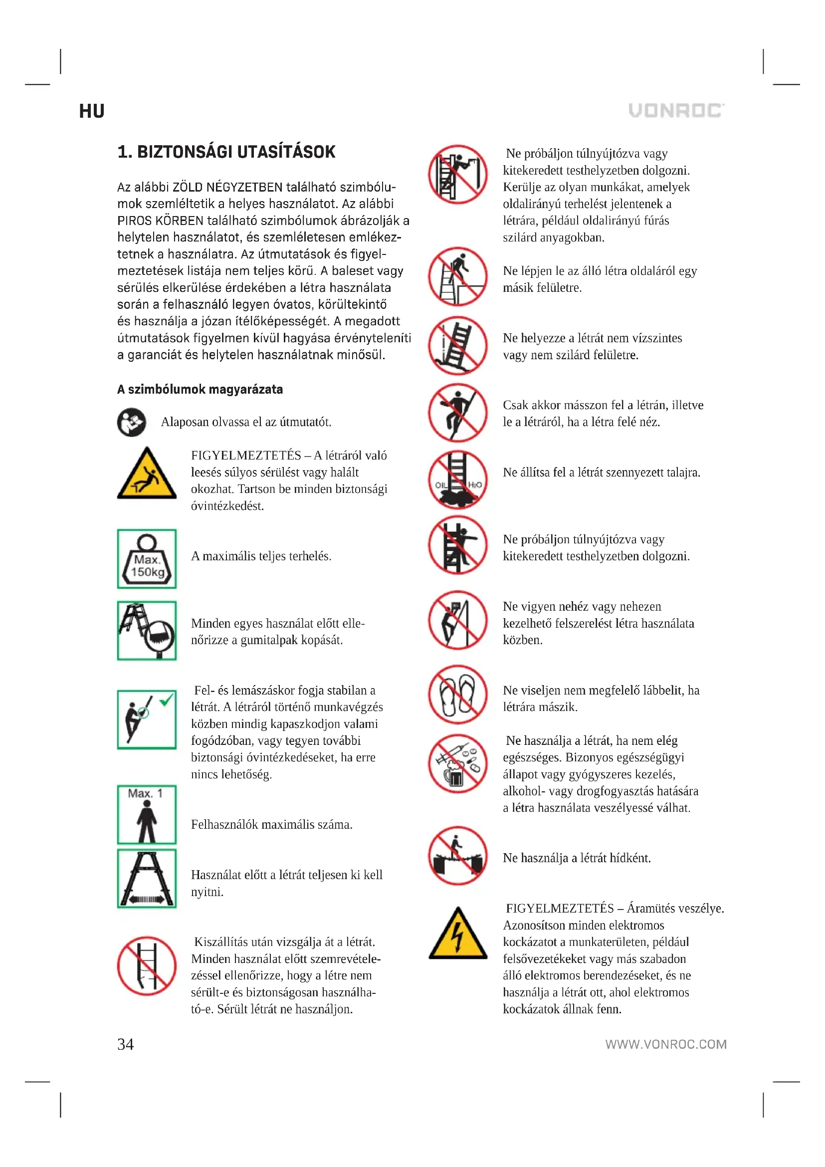 Az alábbi ZÖLD NÉGYZETBEN található szimbólu- mok szemléltetik a helyes használatot. Az alábbi PIROS KÖRBEN található szimbólumok ábrázolják a helytelen használatot, és szemléletesen emlékez- tetnek a használatra. Az útmutatások és figyel- meztetések listája nem teljes körű. A baleset vagy sérülés elkerülése érdekében a létra használata során a felhasználó legyen óvatos, körültekintő és használja a józan ítélőképességét. A megadott útmutatások figyelmen kívül hagyása érvényteleníti a garanciát és helytelen használatnak minősül. A szimbólumok magyarázata Alaposan olvassa el az útmutatót. FIGYELMEZTETÉS – A létráról való leesés súlyos sérülést vagy halált okozhat. Tartson be minden biztonsági óvintézkedést. A maximális teljes terhelés. Minden egyes használat előtt elle- nőrizze a gumitalpak kopását. Fel- és lemászáskor fogja stabilan a létrát. A létráról történő munkavégzés közben mindig kapaszkodjon valami fogódzóban, vagy tegyen további biztonsági óvintézkedéseket, ha erre nincs lehetőség. Felhasználók maximális száma. Használat előtt a létrát teljesen ki kell nyitni. Kiszállítás után vizsgálja át a létrát. Minden használat előtt szemrevétele- zéssel ellenőrizze, hogy a létre nem sérült-e és biztonságosan használha- tó-e. Sérült létrát ne használjon. Ne próbáljon túlnyújtózva vagy kitekeredett testhelyzetben dolgozni. Kerülje az olyan munkákat, amelyek oldalirányú terhelést jelentenek a létrára, például oldalirányú fúrás szilárd anyagokban. Ne lépjen le az álló létra oldaláról egy másik felületre. Ne helyezze a létrát nem vízszintes vagy nem szilárd felületre. Csak akkor másszon fel a létrán, illetve le a létráról, ha a létra felé néz. Ne állítsa fel a létrát szennyezett talajra. Ne próbáljon túlnyújtózva vagy kitekeredett testhelyzetben dolgozni. Ne vigyen nehéz vagy nehezen kezelhető felszerelést létra használata közben. Ne viseljen nem megfelelő lábbelit, ha létrára mászik. Ne használja a létrát, ha nem elég egészséges. Bizonyos egészségügyi állapot vagy gyógyszeres kezelés, alkohol- vagy drogfogyasztás hatására a létra használata veszélyessé válhat. Ne használja a létrát hídként. FIGYELMEZTETÉS – Áramütés veszélye. Azonosítson minden elektromos kockázatot a munkaterületen, például felsővezetékeket vagy más szabadon álló elektromos berendezéseket, és ne használja a létrát ott, ahol elektromos kockázatok állnak fenn.HU