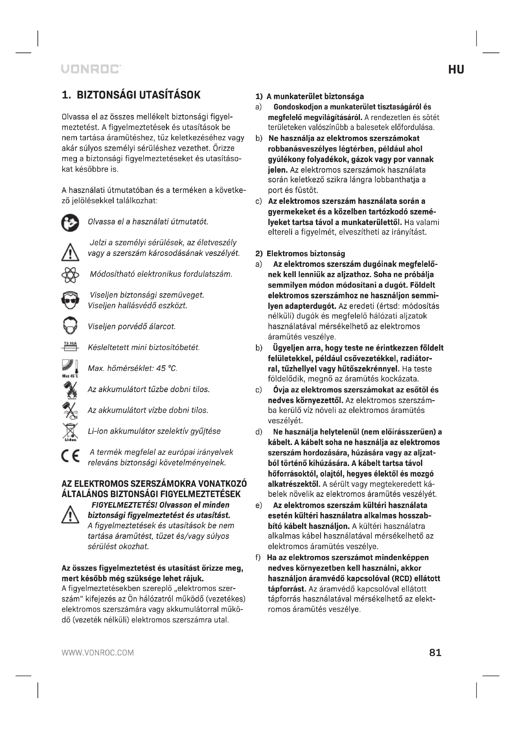 d) Az akkumulátort csak a Vonroc termékéhez használja. Ezzel az intézkedéssel veszélyes túlterheléstől védi az akkumulátorát. e) Az akkumulátor megsérülhet, ha a külsejét he- gyes tárggyal (pl. szeggel, csavarhúzóval) vagy erőszakosan manipulálják. Belső rövidzárlat következhet be, amitől az akkumulátor leéghet, füstölhet, robbanhat vagy túlmelegedhet. A TÖLTŐRE VONATKOZÓ BIZTONSÁGI FIGYEL MEZTETÉSEK Rendeltetésszerű használat A töltővel csak CD801AA és CD803AA típusú tölthető akkumulátorcsomagokat szabad tölteni. Más típusú akkumulátor szétrobbanhat, személyi sérülést és anyagi kárt okozva. a) A villamos készüléket csökkent fizikai, érzék- szervi vagy szellemi képességű személyek (gyermekeket is ideértve) vagy tapasztalat, ismeret híján csak felügyelet vagy útmutatás mellett használhatják. b) Felügyelje a gyermekeket, nehogy játszassanak a készülékkel. c) Nem újratölthető akkumulátorok újratöltésével próbálkozni tilos! d) Az akkumulátorok töltését jól szellőző helyen kell végezni! Elektromos biztonság Mindig ellenőrizze, hogy a tápellátás megfelel-e az adattáblán feltüntetett feszültségnek.