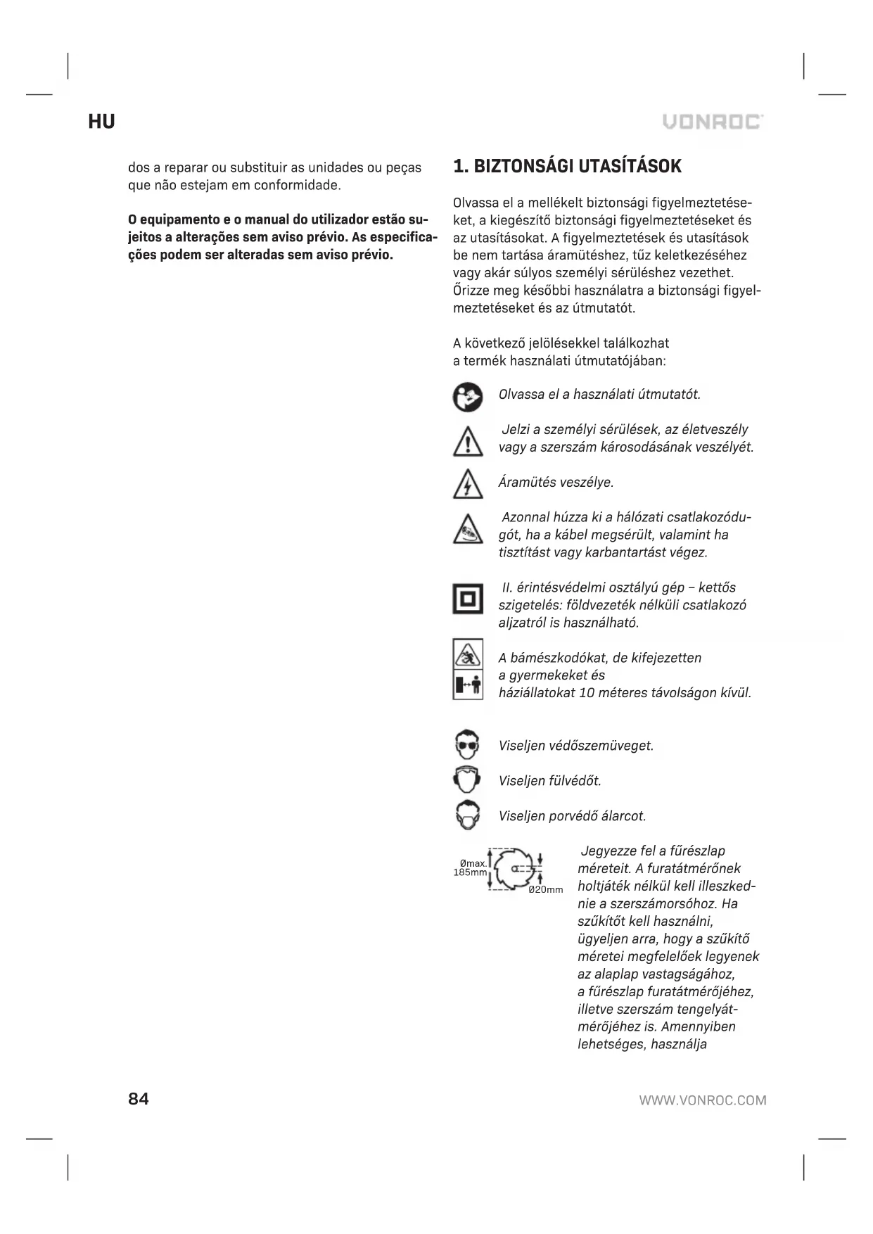 szigetelés: földvezeték nélküli csatlakozó aljzatról is használható. Abámészkodókat, de kifejezetten agyermekeket és háziállatokat 10 méteres távolságon kívül. Viseljen védőszemüveget. Viseljen fülvédőt. Viseljen porvédő álarcot. Ø20mm Ømax. 185mm Jegyezze fel afűrészlap méreteit. Afuratátmérőnek holtjáték nélkül kell illeszked- nie aszerszámorsóhoz. Ha szűkítőt kell használni, ügyeljen arra, hogy aszűkítő méretei megfelelőek legyenek az alaplap vastagságához, afűrészlap furatátmérőjéhez, illetve szerszám tengelyát- mérőjéhez is. Amennyiben lehetséges, használjaHU