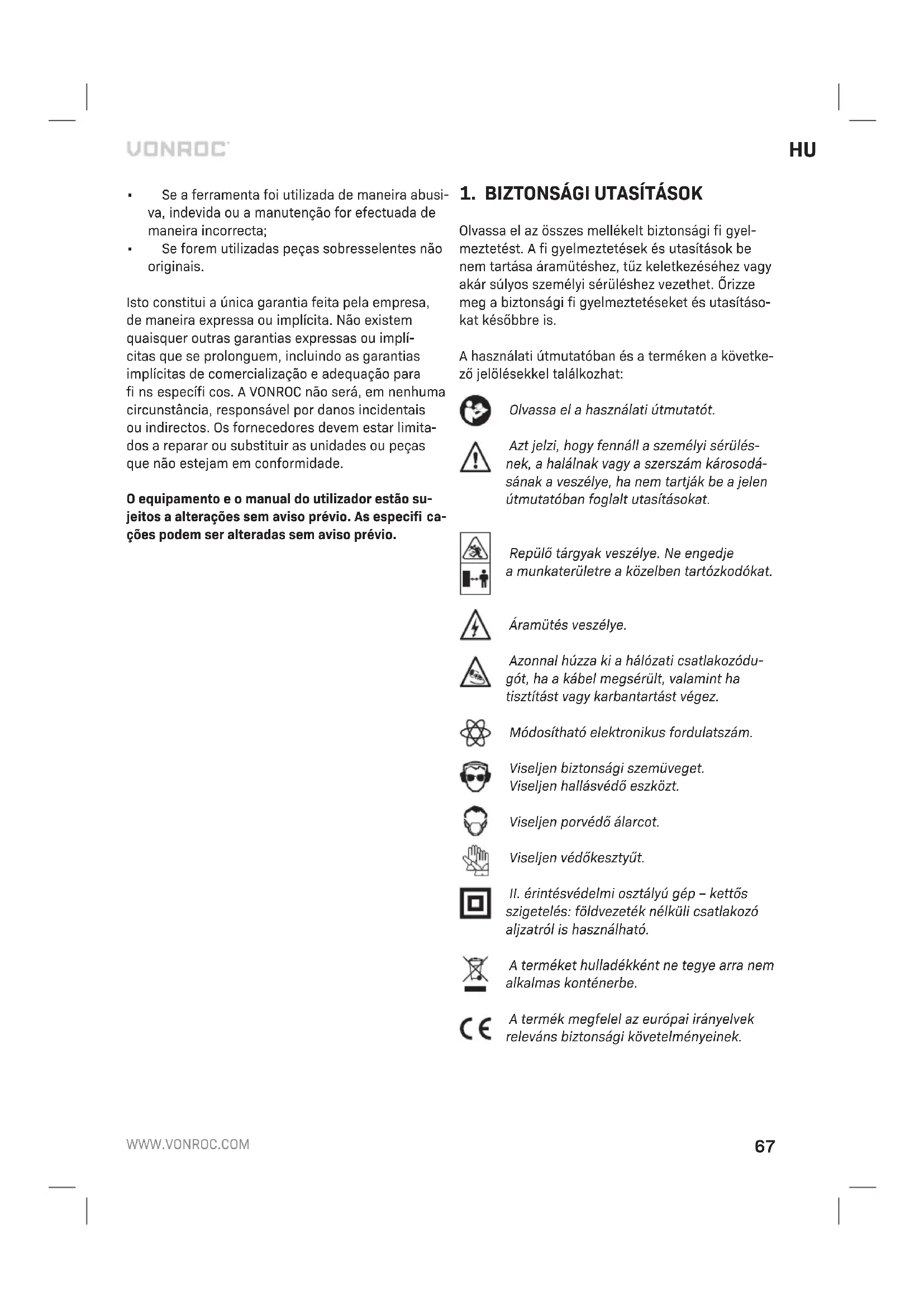 AVONROC termékei alegmagasabb minőségi normák szerint készülnek, és az eredeti vásárlás napjától számított, törvényileg előírt időtartamig garantáljuk, hogy anyag- és gyártási hibáktól mentesen fognak működni. Ha atermékben ezen időszak alatt bármilyen hiba jelentkezik anyag- és/ vagy gyártási hiba miatt, kérjük, forduljon közvetle- nül az Ön VONROC kapcsolattartójához. Aszavatosság nem érvényes akövetkező körülmé- nyek egyikére sem: