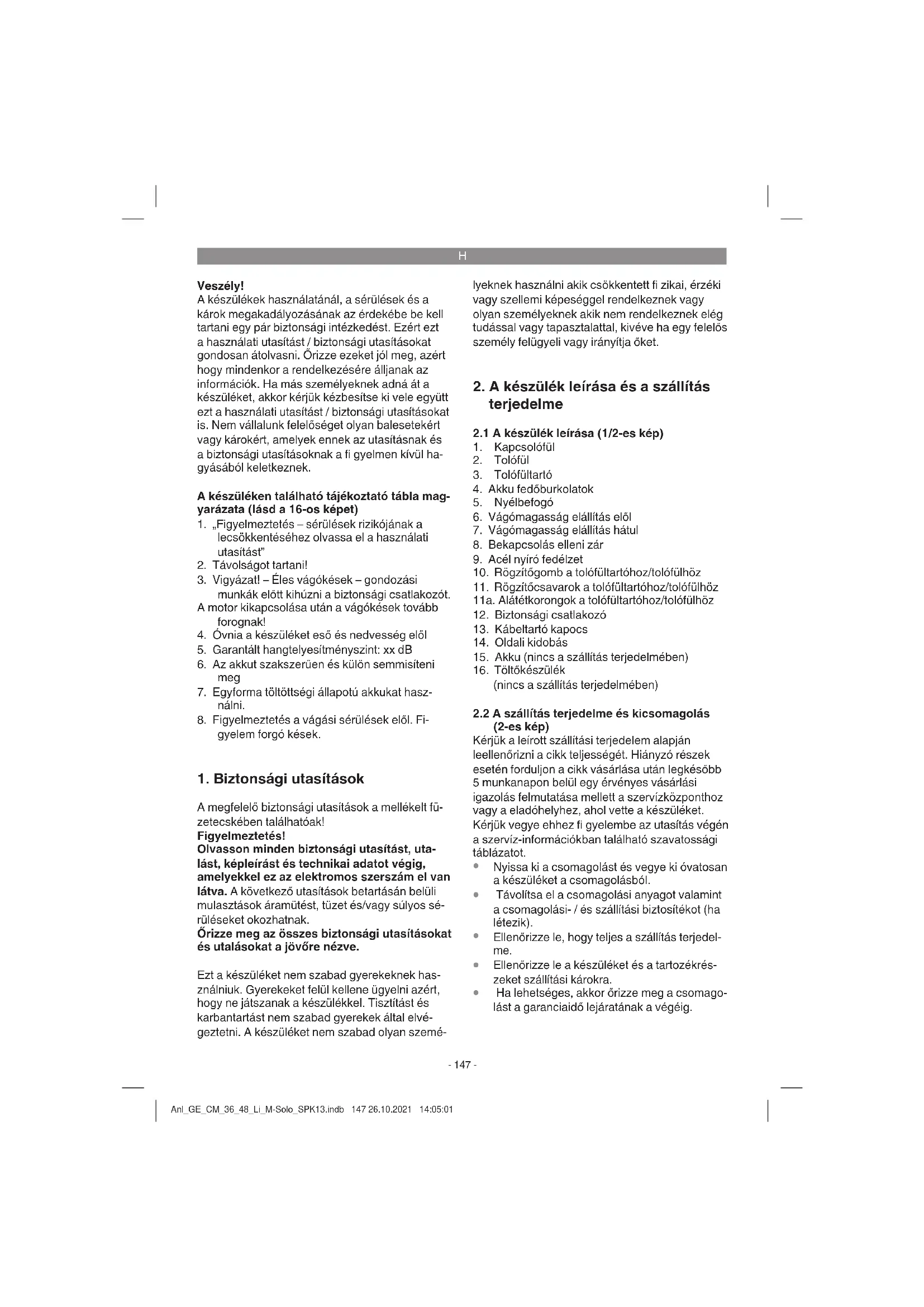 Vigyázat! A fűnyírógép egy biztonsági kapcsolóval van felszerelve azért, hogy megakadályoza a jogosul- atlan használatot. Közvetlenül a fűnyírógépnek az üzembevétele előtt betenni a biztonsági csatlako- zót (9-es kép/ poz. 12) és a munka minden megs- zakításánál vagy befejezésénél ismét eltávolítani Anl_GE_CM_36_48_Li_M-Solo_SPK13.indb 150 26.10.2021 14:05:02H