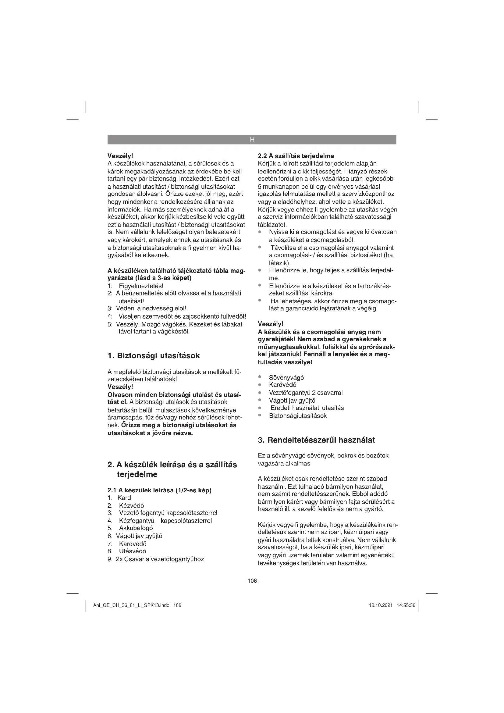 Ez a sövényvágó sövények, bokrok és bozótok vágására alkalmas A készüléket csak rendeltetése szerint szabad használni. Ezt túlhaladó bármilyen használat, nem számít rendeltetésszerűnek. Ebből adódó bármilyen kárért vagy bármilyen fajta sérülésért a használó ill. a kezelő felelős és nem a gyártó. Kérjük vegye fi gyelembe, hogy a készülékeink ren- deltetésük szerint nem az ipari, kézműipari vagy gyári használatra lettek konstruálva. Nem vállalunk szavatosságot, ha a készülék ipari, kézműipari vagy gyári üzemek területén valamint egyenértékű tevékenységek területén van használva. Anl_GE_CH_36_61_Li_SPK13.indb 106Anl_GE_CH_36_61_Li_SPK13.indb 106 19.10.2021 14:55:3619.10.2021 14:55:36H