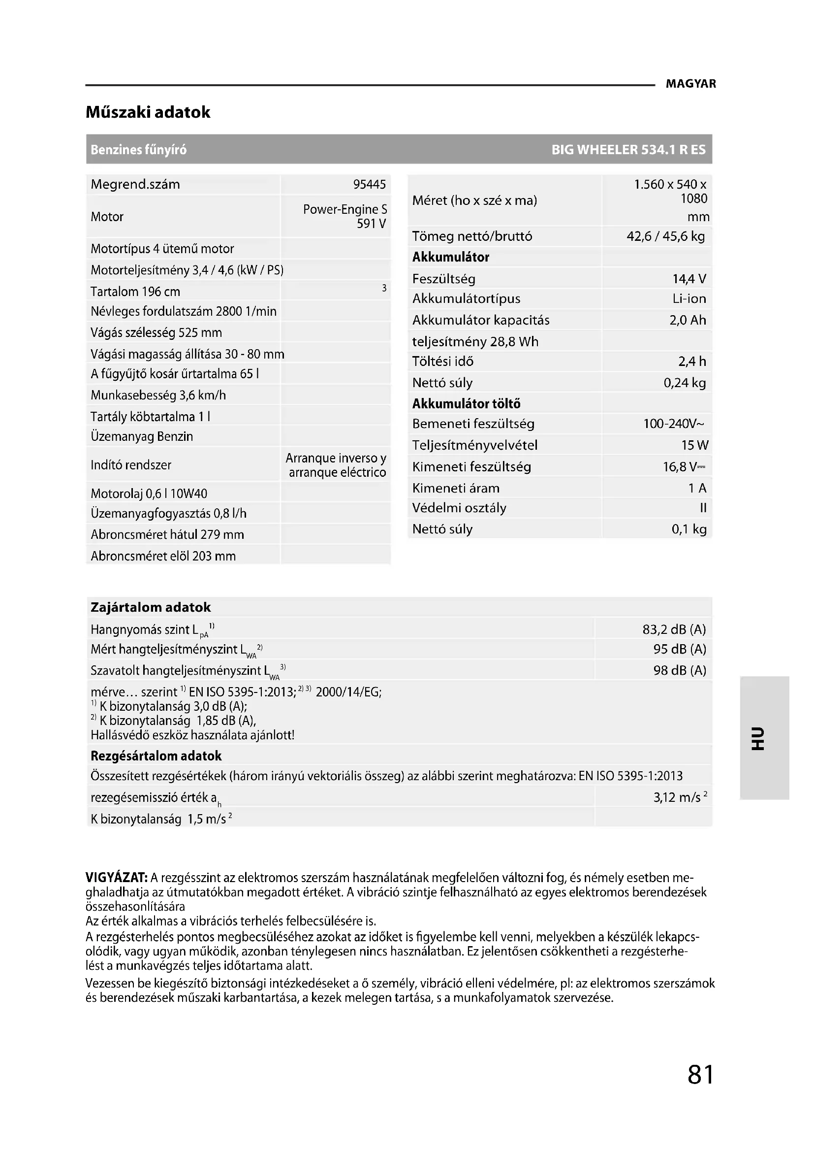 K bizonytalanság 1,85 dB (A), Hallásvédő eszköz használata ajánlott! Rezgésártalom adatok Összesített rezgésértékek (három irányú vektoriális összeg) az alábbi szerint meghatározva: EN ISO 5395-1:2013 rezegésemisszió érték a