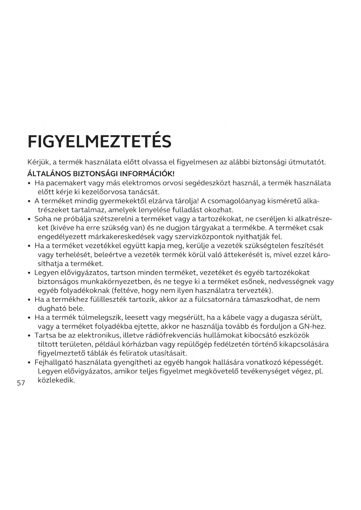 - Fejhallgató használata gyengítheti az egyéb hangok hallására vonatkozó képességét. Legyen elővigyázatos, amikor teljes figyelmet megkövetelő tevékenységet végez, pl. közlekedik.58 FIGYELMEZTETÉS