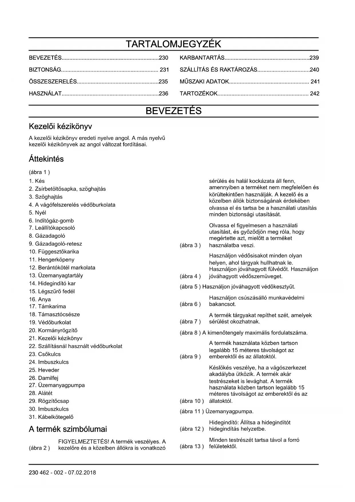 A termék szimbólumai (ábra 2 ) FIGYELMEZTETÉS! A termék veszélyes. A kezelőre és a közelben állókra is vonatkozó sérülés és halál kockázata áll fenn, amennyiben a terméket nem megfelelően és körültekintően használják. A kezelő és a közelben állók biztonságának érdekében olvassa el és tartsa be a használati utasítás minden biztonsági utasítását. (ábra 3 ) Olvassa el figyelmesen a használati utasítást, és győződjön meg róla, hogy megértette azt, mielőtt a terméket használatba veszi. (ábra 4 ) Használjon védősisakot minden olyan helyen, ahol tárgyak hullhatnak le. Használjon jóváhagyott fülvédőt. Használjon jóváhagyott védőszemüveget. (ábra 5 ) Használjon jóváhagyott védőkesztyűt. (ábra 6 ) Használjon csúszásálló munkavédelmi bakancsot. (ábra 7 ) A termék tárgyakat repíthet szét, amelyek sérülést okozhatnak. (ábra 8 ) A kimenőtengely maximális fordulatszáma. (ábra 9 ) A termék használata közben tartson legalább 15 méteres távolságot az emberektől és az állatoktól. (ábra 10 ) Késlökés veszélye, ha a vágószerkezet akadályba ütközik. A termék akár testrészeket is levághat. A termék használata közben tartson legalább 15 méteres távolságot az emberektől és az állatoktól. (ábra 11 ) Üzemanyagpumpa. (ábra 12 ) Hidegindító: Állítsa a hidegindítót hidegindítás helyzetbe. (ábra 13 ) Minden testrészét tartsa távol a forró felületektől. 230 462 - 002 - 07.02.2018(ábra 14 ) Az Európai Közösség irányelvének megfelelő környezeti zajkibocsátás. A termék kibocsátási adatai megtalálhatók a Műszaki adatok című fejezetben és a címkén. (ábra 15 ) Ez a termék megfelel a vonatkozó EK- irányelveknek. Megjegyzés: A terméken szereplő többi jelölés/címke a további piacok specifikus vizsgáztatási követelményeire vonatkozik. Termékszavatosság A termékszavatosságra vonatkozó jogszabályok értelmében nem vagyunk felelősek a termékeink által okozott károkért az alábbi esetekben: