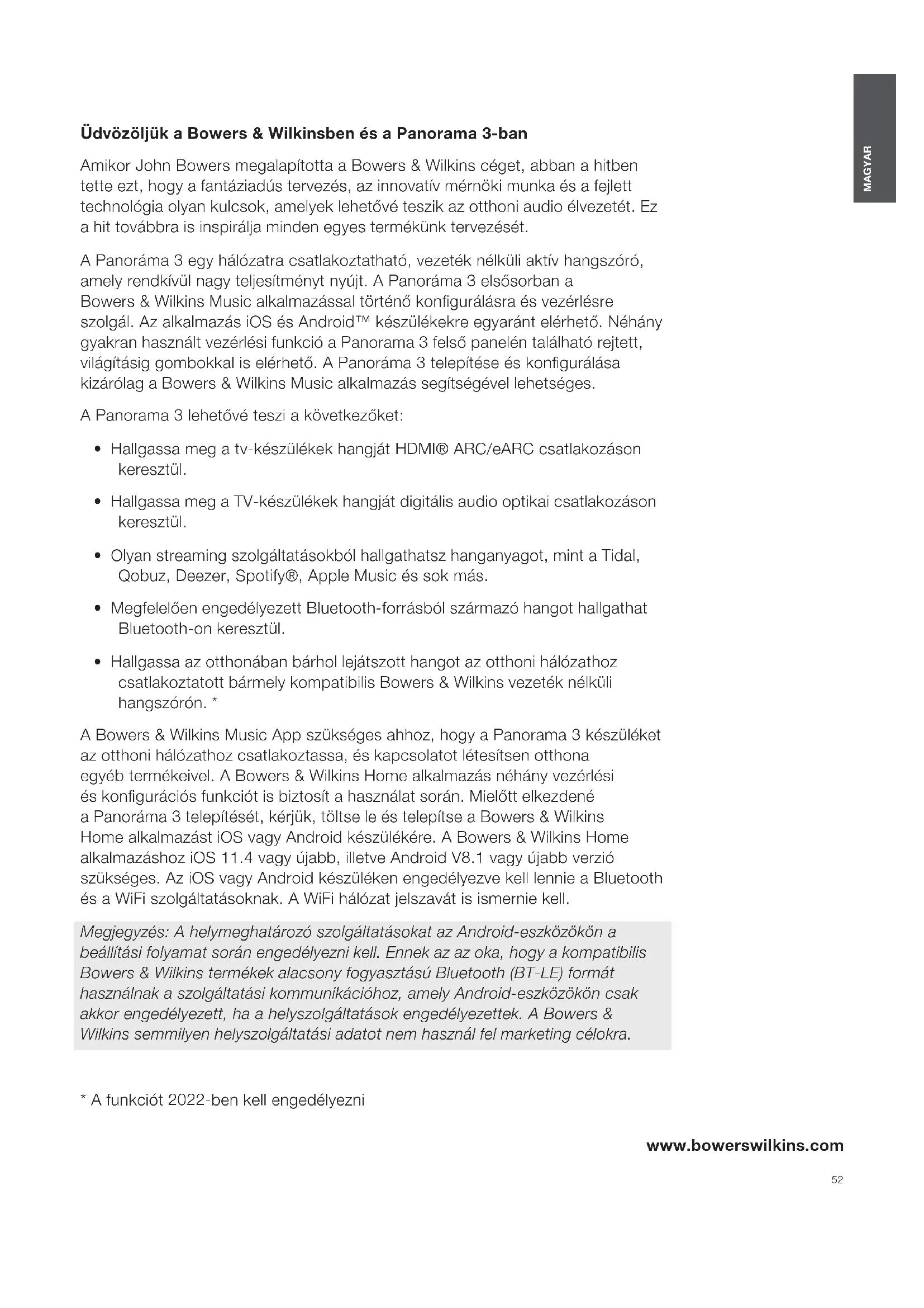 - Hallgassa az otthonában bárhol lejátszott hangot az otthoni hálózathoz csatlakoztatott bármely kompatibilis Bowers&Wilkins vezeték nélküli hangszórón. * A Bowers&Wilkins Music App szükséges ahhoz, hogy a Panorama3 készüléket az otthoni hálózathoz csatlakoztassa, és kapcsolatot létesítsen otthona egyéb termékeivel. A Bowers&Wilkins Home alkalmazás néhány vezérlési és kongurációs funkciót is biztosít a használat során. Mielőtt elkezdené a Panoráma3 telepítését, kérjük, töltse le és telepítse a Bowers&Wilkins Home alkalmazást iOS vagy Android készülékére. A Bowers&Wilkins Home alkalmazáshoz iOS 11.4 vagy újabb, illetve Android V8.1 vagy újabb verzió szükséges. Az iOS vagy Android készüléken engedélyezve kell lennie a Bluetooth és a WiFi szolgáltatásoknak. A WiFi hálózat jelszavát is ismernie kell. Megjegyzés: A helymeghatározó szolgáltatásokat az Android-eszközökön a beállítási folyamat során engedélyezni kell. Ennek az az oka, hogy a kompatibilis Bowers&Wilkins termékek alacsony fogyasztású Bluetooth (BT-LE) formát használnak a szolgáltatási kommunikációhoz, amely Android-eszközökön csak akkor engedélyezett, ha a helyszolgáltatások engedélyezettek. A Bowers & Wilkins semmilyen helyszolgáltatási adatot nem használ fel marketing célokra.