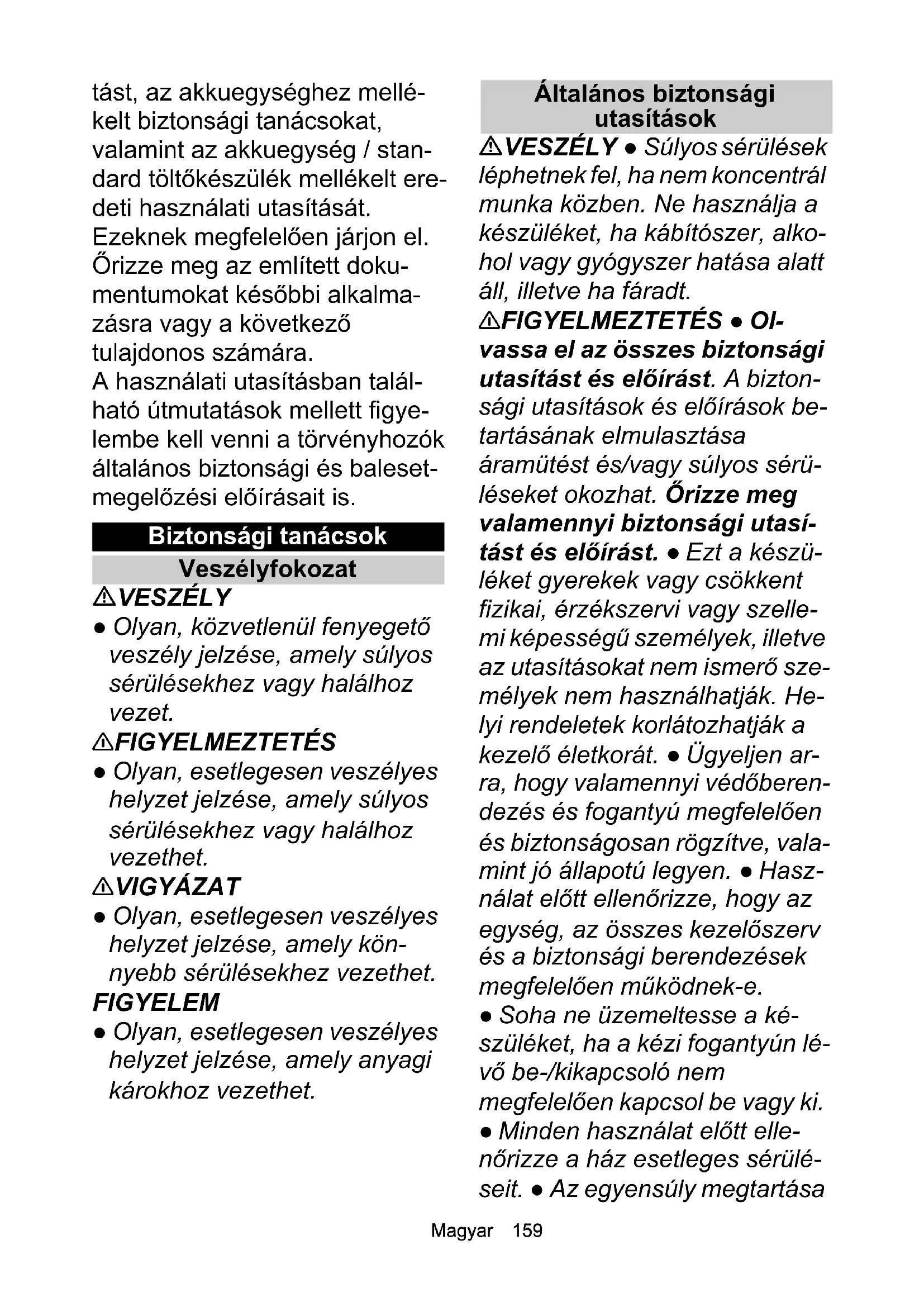 • EU megfelelőségi nyilatkozat Chairman of the Board of ManagementDirector Regulatory Affairs & CertificationH. JennerS. ReiserMagyar 159 tást, az akkuegységhez mellé- kelt biztonsági tanácsokat, valamint az akkuegység / stan- dard töltőkészülék mellékelt ere- deti használati utasítását. Ezeknek megfelelően járjon el. Őrizze meg az említett doku- mentumokat későbbi alkalma- zásra vagy a következő tulajdonos számára. A használati utasításban talál- ható útmutatások mellett figye- lembe kell venni a törvényhozók általános biztonsági és baleset- megelőzési előírásait is. Biztonsági tanácsok Veszélyfokozat VESZÉLY ● Olyan, közvetlenül fenyegető veszély jelzése, amely súlyos sérülésekhez vagy halálhoz vezet. 몇 FIGYELMEZTETÉS ● Olyan, esetlegesen veszélyes helyzet jelzése, amely súlyos sérülésekhez vagy halálhoz vezethet. 몇 VIGYÁZAT ● Olyan, esetlegesen veszélyes helyzet jelzése, amely kön- nyebb sérülésekhez vezethet. FIGYELEM ● Olyan, esetlegesen veszélyes helyzet jelzése, amely anyagi károkhoz vezethet. Általános biztonsági utasítások VESZÉLY ● Súlyos sérülések léphetnek fel, ha nem koncentrál munka közben. Ne használja a készüléket, ha kábítószer, alko- hol vagy gyógyszer hatása alatt áll, illetve ha fáradt. 몇 FIGYELMEZTETÉS ● Ol- vassa el az összes biztonsági utasítást és előírást. A bizton- sági utasítások és előírások be- tartásának elmulasztása áramütést és/vagy súlyos sérü- léseket okozhat. Őrizze meg valamennyi biztonsági utasí- tást és előírást. ● Ezt a készü- léket gyerekek vagy csökkent fizikai, érzékszervi vagy szelle- mi képességű személyek, illetve az utasításokat nem ismerő sze- mélyek nem használhatják. He- lyi rendeletek korlátozhatják a kezelő életkorát. ● Ügyeljen ar- ra, hogy valamennyi védőberen- dezés és fogantyú megfelelően és biztonságosan rögzítve, vala- mint jó állapotú legyen. ● Hasz- nálat előtt ellenőrizze, hogy az egység, az összes kezelőszerv és a biztonsági berendezések megfelelően működnek-e. ● Soha ne üzemeltesse a ké- szüléket, ha a kézi fogantyún lé- vő be-/kikapcsoló nem megfelelően kapcsol be vagy ki. ● Minden használat előtt elle- nőrizze a ház esetleges sérülé- seit. ● Az egyensúly megtartása160 Magyar érdekében készletenként cse- rélje ki az elhasználódott vagy sérült alkatrészeket. ● A készü- lék használata során tartsa távol a gyermekeket és más szemé- lyeket a munkavégzési terület- től. ● Győződjön meg róla, hogy a szellőzőnyílások lerakódás- mentesek. ●  A légáram jelentős távolságon keresztül képes fújni a tárgyakat. Használat előtt ala- posan ellenőrizze a munkaterü- letet, és távolítsa el az esetleges tárgyakat, mint például köveket, törött üveget, szögeket, dróto- kat, fonalakat. ● Sérülésveszély az anyagkidobódás miatt. Ne használja a készüléket köves burkolatú helyeken illetve kavi- cson. ● A készüléket csak szi- lárd, sík felületen, és a javasolt helyzetben tartva használja. 몇 VIGYÁZAT ● Ismerkedjen meg a kezelőelemekkel és a ké- szülék szabályszerű használa- tával. ● A készülék használatakor viseljen teljes fül- védelmet. A készülék rendkívül hangos, így tartós halláskároso- dást okozhat, ha nem tartja be szigorúan az expozícióra, a zaj- csökkentésre és a hallásvéde- lemre vonatkozó utasításokat. ● A készülék használatakor vi- seljen teljes szemvédelmet. A gyártó erősen javasolja, hogy vi- seljen teljes arcmaszkot vagy teljesen zárt védőszemüveget. A normál szemüveg vagy nap- szemüveg nem védi meg az el- repített tárgyaktól. ● Sérülésveszély, ha a laza ru- házatot, hajat vagy ékszert a ké- szülék beszívja a légbemenetén. A hosszú hajat a válla feletti magasságban fogja össze. ● A készülékkel végzett munka során viseljen hosszú, nehéz nadrágot, stabil lábbelit és megfelelő szabású kesztyűt. Ne dolgozzon mezítláb. Ne vi- seljen ékszert, szandált vagy rö- vidnadrágot. FIGYELEM ● A készülék kez- elője felelős a más személyek- kel vagy azok tulajdonával történő balesetekért. Megjegyzés ● Egyes területe- ken előírások korlátozhatják a készülék alkalmazását. Érdek- lődjön erről a helyi hatóságnál. ● A készüléken lévő sérült vagy olvashatatlan figyelmeztető táb- lákat cseréltesse ki a hivatalos ügyfélszolgálattal. ● Az akkumu- látoros fúvókészülék használata előtt gereblyével és seprűvel la- zítsa meg a szennyeződéseket. Biztonságos üzem VESZÉLY ● Tilos a készülé- ket robbanásveszélyes terüle- ten használni! 몇 FIGYELMEZTETÉS ● Más személyektől és állatoktól tart- son 15 m minimális távolságot. Állítsa le a készüléket, ha valaki belép a területre. ● Az arcot és aMagyar 161 testet tartsa távol a bevezető nyílástól. ● A gép indítása előtt ellenőrizze, hogy a bevezető kamra üres-e. ● Ne tartsa a ke- zét vagy más testrészeit az be- vezető kamrába, a kivezető csőbe, illetve más mozgó alkat- részekbe. ● Ne használja a ké- szüléket, ha fennáll a villámcsapás veszélye. ● A le- hetséges veszélyek felismerése érdekében a munkaterületet akadálytalanul át kell tudni tekin- teni. A készüléket csak akkor használja, ha a megvilágítás megfelelő. ● A készülékkel való munkavégzés során ne fusson, hanem járjon. Ne haladjon vis- szafelé. Kerülje a szabálytalan testhelyzetet, álljon stabilan, és mindig tartsa meg egyensúlyát. ● Soha ne használja a készülé- ket, ha a védőberendezések hi- básak, vagy ha nincsenek meg a biztonsági berendezések, pél- dául a törmelék-elkapó. ● Azon- nal állí