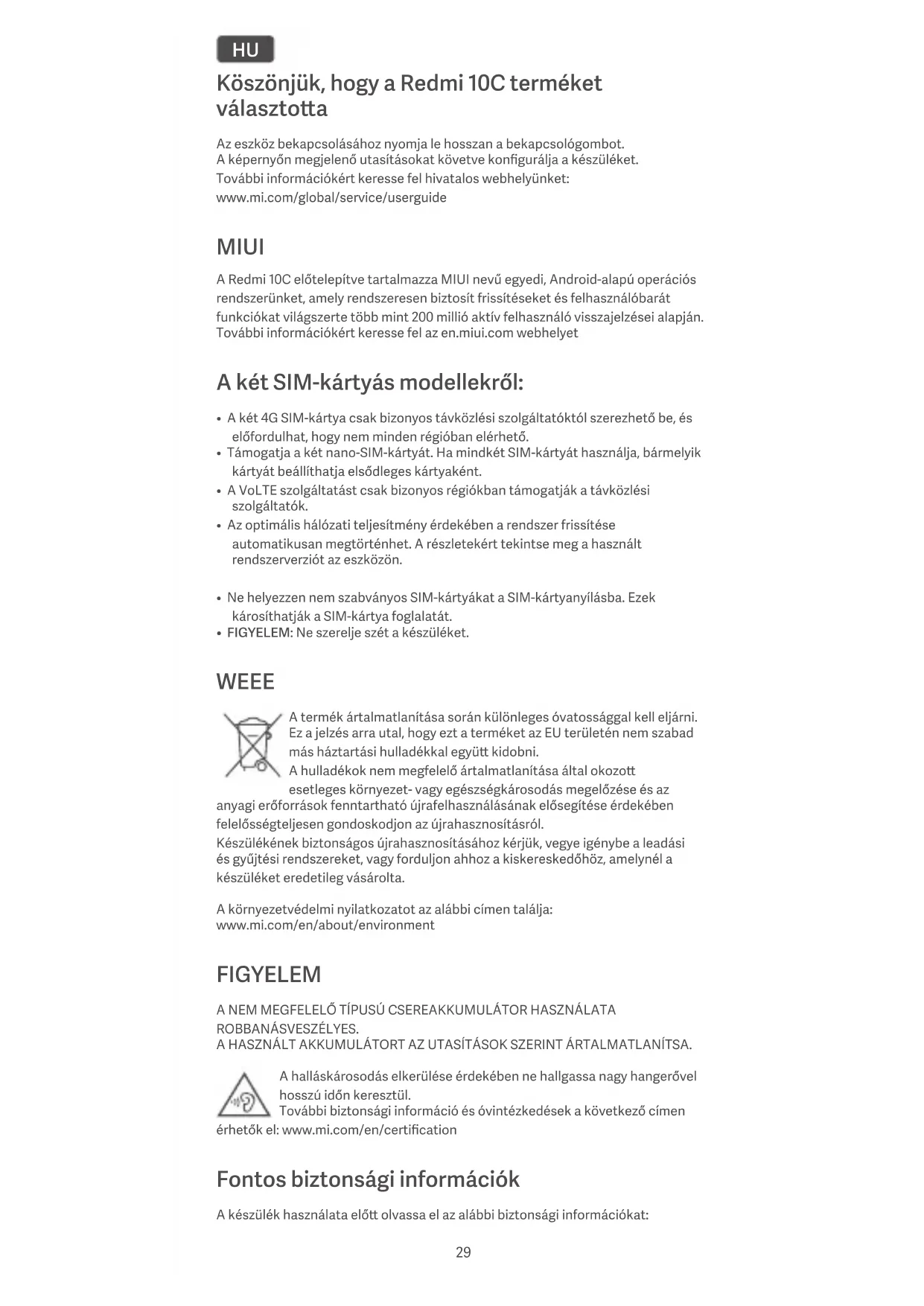 - FIGYELEM: Ne szerelje szét a készüléket. WEEE A termék ártalmatlanítása során különleges óvatossággal kell eljárni. Ez a jelzés arra utal, hogy ezt a terméket az EU területén nem szabad más háztartási hulladékkal együ kidobni. A hulladékok nem megfelelő ártalmatlanítása által okozo esetleges környezet- vagy egészségkárosodás megelőzése és az anyagi erőforrások fenntartható újrafelhasználásának elősegítése érdekében felelősségteljesen gondoskodjon az újrahasznosításról. Készülékének biztonságos újrahasznosításához kérjük, vegye igénybe a leadási és gyűjtési rendszereket, vagy forduljon ahhoz a kiskereskedőhöz, amelynél a készüléket eredetileg vásárolta. A környezetvédelmi nyilatkozatot az alábbi címen találja: www.mi.com/en/about/environment FIGYELEM A NEM MEGFELELŐ TÍPUSÚ CSEREAKKUMULÁTOR HASZNÁLATA ROBBANÁSVESZÉLYES. A HASZNÁLT AKKUMULÁTORT AZ UTASÍTÁSOK SZERINT ÁRTALMATLANÍTSA. A halláskárosodás elkerülése érdekében ne hallgassa nagy hangerővel hosszú időn keresztül. További biztonsági információ és óvintézkedések a következő címen érhetők el: www.mi.com/en/certification Fontos biztonsági információk A készülék használata elő olvassa el az alábbi biztonsági információkat: 29• Jóváhagyás nélküli kábelek, tápegységek vagy akkumulátorok használata tüzet vagy robbanást okozhat, illetve egyéb kockázatokkal járhat.
