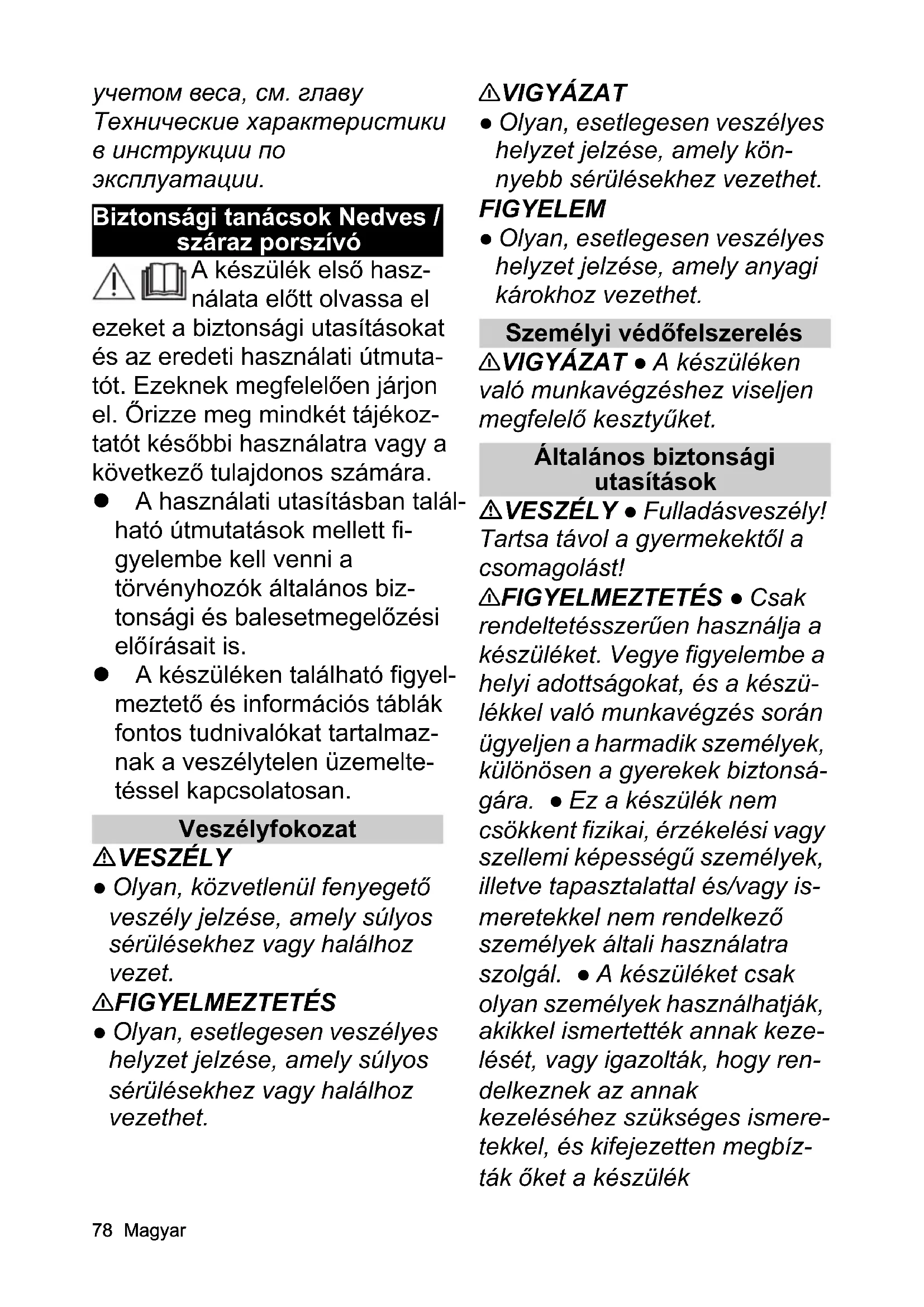 Используйте только те принадлежности и запасные детали, которые одобрены производителем. Использовать оригинальные принадлежности и запасные части. Только они гарантируют безопасную и бесперебойную работу устройства. Транспортировка 몇 ОСТОРОЖНО ● Перед транспортировкой остановить двигатель. Фиксировать устройство с78 Magyar учетом веса, см. главу Технические характеристики в инструкции по эксплуатации. Biztonsági tanácsok Nedves / száraz porszívó A készülék első hasz- nálata előtt olvassa el ezeket a biztonsági utasításokat és az eredeti használati útmuta- tót. Ezeknek megfelelően járjon el. Őrizze meg mindkét tájékoz- tatót későbbi használatra vagy a következő tulajdonos számára. A használati utasításban talál- ható útmutatások mellett fi- gyelembe kell venni a törvényhozók általános biz- tonsági és balesetmegelőzési előírásait is. A készüléken található figyel- meztető és információs táblák fontos tudnivalókat tartalmaz- nak a veszélytelen üzemelte- téssel kapcsolatosan. Veszélyfokozat VESZÉLY ● Olyan, közvetlenül fenyegető veszély jelzése, amely súlyos sérülésekhez vagy halálhoz vezet. 몇 FIGYELMEZTETÉS ● Olyan, esetlegesen veszélyes helyzet jelzése, amely súlyos sérülésekhez vagy halálhoz vezethet. 몇 VIGYÁZAT ● Olyan, esetlegesen veszélyes helyzet jelzése, amely kön- nyebb sérülésekhez vezethet. FIGYELEM ● Olyan, esetlegesen veszélyes helyzet jelzése, amely anyagi károkhoz vezethet. Személyi védőfelszerelés 몇 VIGYÁZAT ● A készüléken való munkavégzéshez viseljen megfelelő kesztyűket. Általános biztonsági utasítások VESZÉLY ● Fulladásveszély! Tartsa távol a gyermekektől a csomagolást! 몇 FIGYELMEZTETÉS ● Csak rendeltetésszerűen használja a készüléket. Vegye figyelembe a helyi adottságokat, és a készü- lékkel való munkavégzés során ügyeljen a harmadik személyek, különösen a gyerekek biztonsá- gára. ● Ez a készülék nem csökkent fizikai, érzékelési vagy szellemi képességű személyek, illetve tapasztalattal és/vagy is- meretekkel nem rendelkező személyek általi használatra szolgál. ● A készüléket csak olyan személyek használhatják, akikkel ismertették annak keze- lését, vagy igazolták, hogy ren- delkeznek az annak kezeléséhez szükséges ismere- tekkel, és kifejezetten megbíz- ták őket a készülékMagyar 79 használatával. ● Gyermekek nem használhatják a készülé- ket! ● Felügyelje a gyerekeket, és biztosítsa, hogy ne játszhas- sanak a készülékkel. 몇 VIGYÁZAT ● A biztonsági be- rendezések az Ön védelmét szolgálják. A biztonsági beren- dezéseket ne módosítsa és ne mellőzze használatukat! Áramütésveszély VESZÉLY ● Az I. érintésvé- delmi osztályba sorolt készülé- keket csak megfelelő földeléssel ellátott áramforráshoz csatla- koztassa! ● A típustáblán sze- replő feszültségnek meg kell egyeznie az áramforrás feszült- ségével. ● Soha ne fogja meg a hálózati dugót vagy az aljzatot nedves kézzel. 몇 FIGYELMEZTETÉS ● Csak olyan elektromos csatlakozóra csatlakoztassa a készüléket, amelyet villamos szakember alakított ki IEC 60364-1 szab- ványnak megfelelően. ● Habo- sodás vagy folyadékszivárgás esetén azonnal kapcsolja ki a készüléket, húzza ki a hálózati csatlakozót, vagy vegye ki az akkumulátort. ● A készülék min- den egyes használata előtt győ- ződjön meg arról, hogy a hálózati csatlakozó vezeték és a hálózati dugasz nem sérült-e. A veszélyek elkerülése érdekében a sérült hálózati csatlakozó ve- zetéket haladéktalanul cserél- tesse ki a gyártóval, a hivatalos ügyfélszolgálattal vagy villamos- sági szakemberrel. ● Ne men- jen át a hálózati kábelen és a hosszabbítókábelen, illetve ne hagyja beszorulni és megtörni őket stb., mivel megsérülhetnek, illetve károsodhatnak. Védje a hálózati kábelt a hőtől, olajtól és az élektől. ● Csak a gyártó által előírt hálózati csatlakozó veze- téket alkalmazza, ez a vezeték cseréje esetén is alkalmas. A rendelésszámot és típust lásd a használati utasításban. ● A há- lózati csatlakozókat és a hos- szabbító vezeték csatlakozóit csak azonos fröcskölő víz elleni védelemmel és azonos mecha- nikai szilárdsággal rendelkező csatlakozókra cserélje. FIGYELEM ● A bekapcsolási fo- lyamatok rövid idejű feszültség- csökkentéseket hoznak létre. ● Kedvezőtlen hálózati feltételek negatívan befolyásolhatják a to- vábbi készülékeket. ● 0,15 Ohmnál kisebb hálózati impedancia esetén nem várha- tók zavarok. Üzemeltetés VESZÉLY ● A készülék ve- szélyes tartományban (pl. töl- tőállomáson) való használata esetén tartsa be a megfelelő biz- tonsági előírásokat. ● Robba- násveszélyes atmoszférában80 Magyar történő üzemeltetés tilos, kivé- ve, ha a készüléket kifejezetten erre tervezték, lásd a kezelési útmutató Rendeltetésszerű használat fejezetében. ● Rob- banásveszély. Egyes anyagok a szívólevegővel való turbulencia útján robbanóképes gőzöket vagy keverékeket képezhetnek, és megtámadhatják a készülé- ken használt anyagokat. Ne szívjon fel gyúlékony gá- zokat, folyadékokat vagy po- rokat (reaktív porok), kivéve, ha a készüléket kifejezetten erre tervezték, lásd a kezelési útmutató Rendeltetésszerű használat fejezetét. Ne szívjon fel reaktív fémpo- rokat (pl. alumínium, magné- zium, cink) erősen lúgos vagy savas tisztítószerek