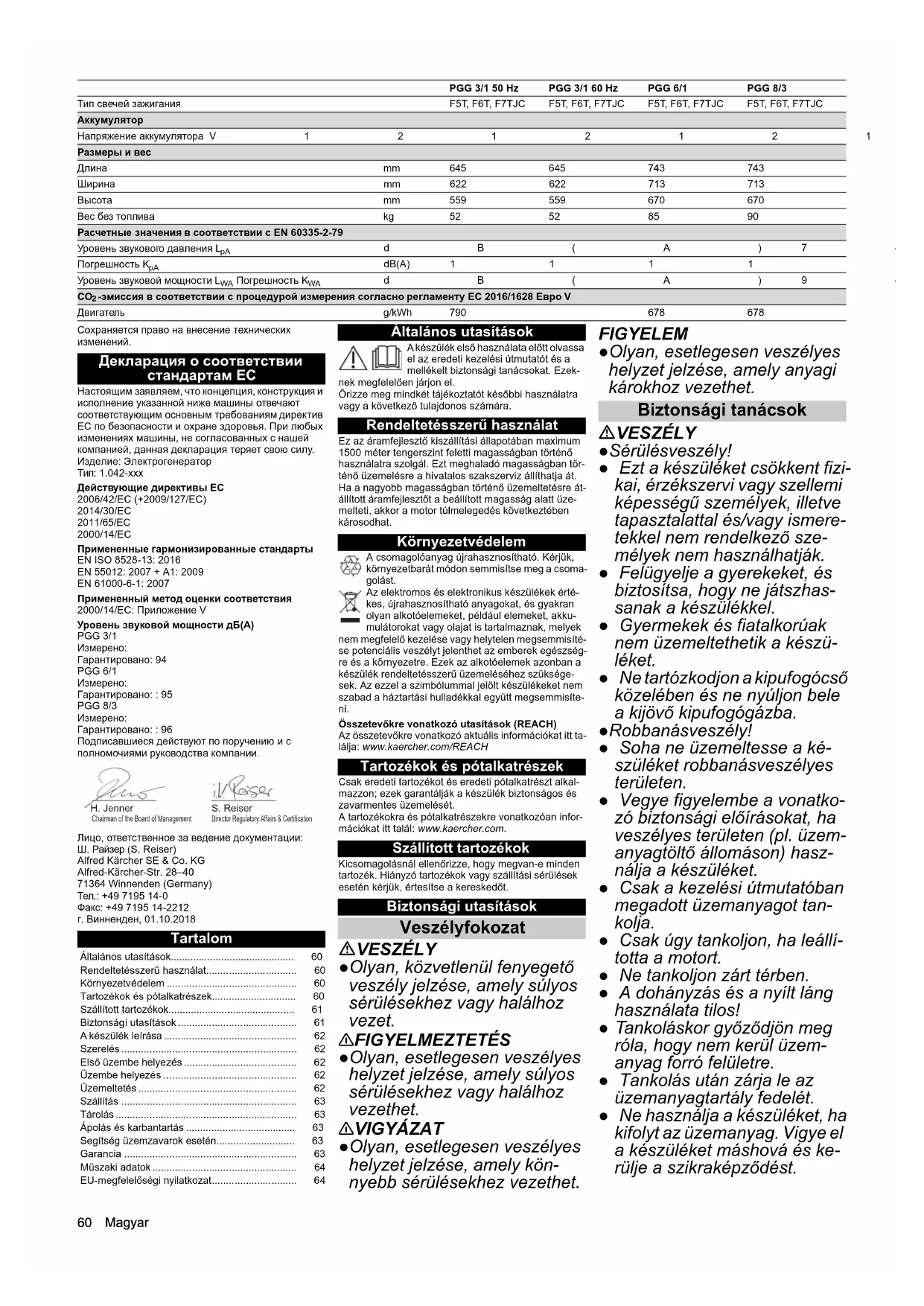Гарантировано: : 96 Подписавшиеся действуют по поручению и с полномочиями руководства компании. Лицо, ответственное за ведение документации: Ш. Райзер (S. Reiser) Alfred Kärcher SE & Co. KG Alfred-Kärcher-Str. 28–40 71364 Winnenden (Germany) Тел.: +49 7195 14-0 Факс: +49 7195 14-2212 г. Винненден, 01.10.2018 Tartalom Általános utasítások A készülék első használata előtt olvassa el az eredeti kezelési útmutatót és a mellékelt biztonsági tanácsokat. Ezek- nek megfelelően járjon el. Őrizze meg mindkét tájékoztatót későbbi használatra vagy a következő tulajdonos számára. Rendeltetésszerű használat Ez az áramfejlesztő kiszállítási állapotában maximum 1500 méter tengerszint feletti magasságban történő használatra szolgál. Ezt meghaladó magasságban tör- ténő üzemelésre a hivatalos szakszerviz állíthatja át. Ha a nagyobb magasságban történő üzemeltetésre át- állított áramfejlesztőt a beállított magasság alatt üze- melteti, akkor a motor túlmelegedés következtében károsodhat. Környezetvédelem A csomagolóanyag újrahasznosítható. Kérjük, környezetbarát módon semmisítse meg a csoma- golást. Az elektromos és elektronikus készülékek érté- kes, újrahasznosítható anyagokat, és gyakran olyan alkotóelemeket, például elemeket, akku- mulátorokat vagy olajat is tartalmaznak, melyek nem megfelelő kezelése vagy helytelen megsemmisíté- se potenciális veszélyt jelenthet az emberek egészség- re és a környezetre. Ezek az alkotóelemek azonban a készülék rendeltetésszerű üzemeléséhez szüksége- sek. Az ezzel a szimbólummal jelölt készülékeket nem szabad a háztartási hulladékkal együtt megsemmisíte- ni. Összetevőkre vonatkozó utasítások (REACH) Az összetevőkre vonatkozó aktuális információkat itt ta- lálja: www.kaercher.com/REACH Tartozékok és pótalkatrészek Csak eredeti tartozékot és eredeti pótalkatrészt alkal- mazzon; ezek garantálják a készülék biztonságos és zavarmentes üzemelését. A tartozékokra és pótalkatrészekre vonatkozóan infor- mációkat itt talál: www.kaercher.com. Szállított tartozékok Kicsomagolásnál ellenőrizze, hogy megvan-e minden tartozék. Hiányzó tartozékok vagy szállítási sérülések esetén kérjük, értesítse a kereskedőt. Biztonsági utasítások Veszélyfokozat VESZÉLY ●Olyan, közvetlenül fenyegető veszély jelzése, amely súlyos sérülésekhez vagy halálhoz vezet. 몇 FIGYELMEZTETÉS ●Olyan, esetlegesen veszélyes helyzet jelzése, amely súlyos sérülésekhez vagy halálhoz vezethet. 몇 VIGYÁZAT ●Olyan, esetlegesen veszélyes helyzet jelzése, amely kön- nyebb sérülésekhez vezethet. FIGYELEM ●Olyan, esetlegesen veszélyes helyzet jelzése, amely anyagi károkhoz vezethet. Biztonsági tanácsok VESZÉLY ●Sérülésveszély! ● Ezt a készüléket csökkent fizi- kai, érzékszervi vagy szellemi képességű személyek, illetve tapasztalattal és/vagy ismere- tekkel nem rendelkező sze- mélyek nem használhatják. ● Felügyelje a gyerekeket, és biztosítsa, hogy ne játszhas- sanak a készülékkel. ● Gyermekek és fiatalkorúak nem üzemeltethetik a készü- léket. ● Ne tartózkodjon a kipufogócső közelében és ne nyúljon bele a kijövő kipufogógázba. ●Robbanásveszély! ● Soha ne üzemeltesse a ké- szüléket robbanásveszélyes területen. ● Vegye figyelembe a vonatko- zó biztonsági előírásokat, ha veszélyes területen (pl. üzem- anyagtöltő állomáson) hasz- nálja a készüléket. ● Csak a kezelési útmutatóban megadott üzemanyagot tan- kolja. ● Csak úgy tankoljon, ha leállí- totta a motort. ● Ne tankoljon zárt térben. ● A dohányzás és a nyílt láng használata tilos! ● Tankoláskor győződjön meg róla, hogy nem kerül üzem- anyag forró felületre. ● Tankolás után zárja le az üzemanyagtartály fedelét. ● Ne használja a készüléket, ha kifolyt az üzemanyag. Vigye el a készüléket máshová és ke- rülje a szikraképződést. Тип свечей зажигания F5T, F6T, F7TJC F5T, F6T, F7TJC F5T, F6T, F7TJC F5T, F6T, F7TJC Аккумулятор Напряжение аккумулятора V12121212 Размеры и вес Длина mm 645 645 743 743 Ширина mm 622 622 713 713 Высота mm 559 559 670 670 Вес без топлива kg 52 52 85 90 Расчетные значения в соответствии с EN 60335-2-79 Уровень звукового давления L
