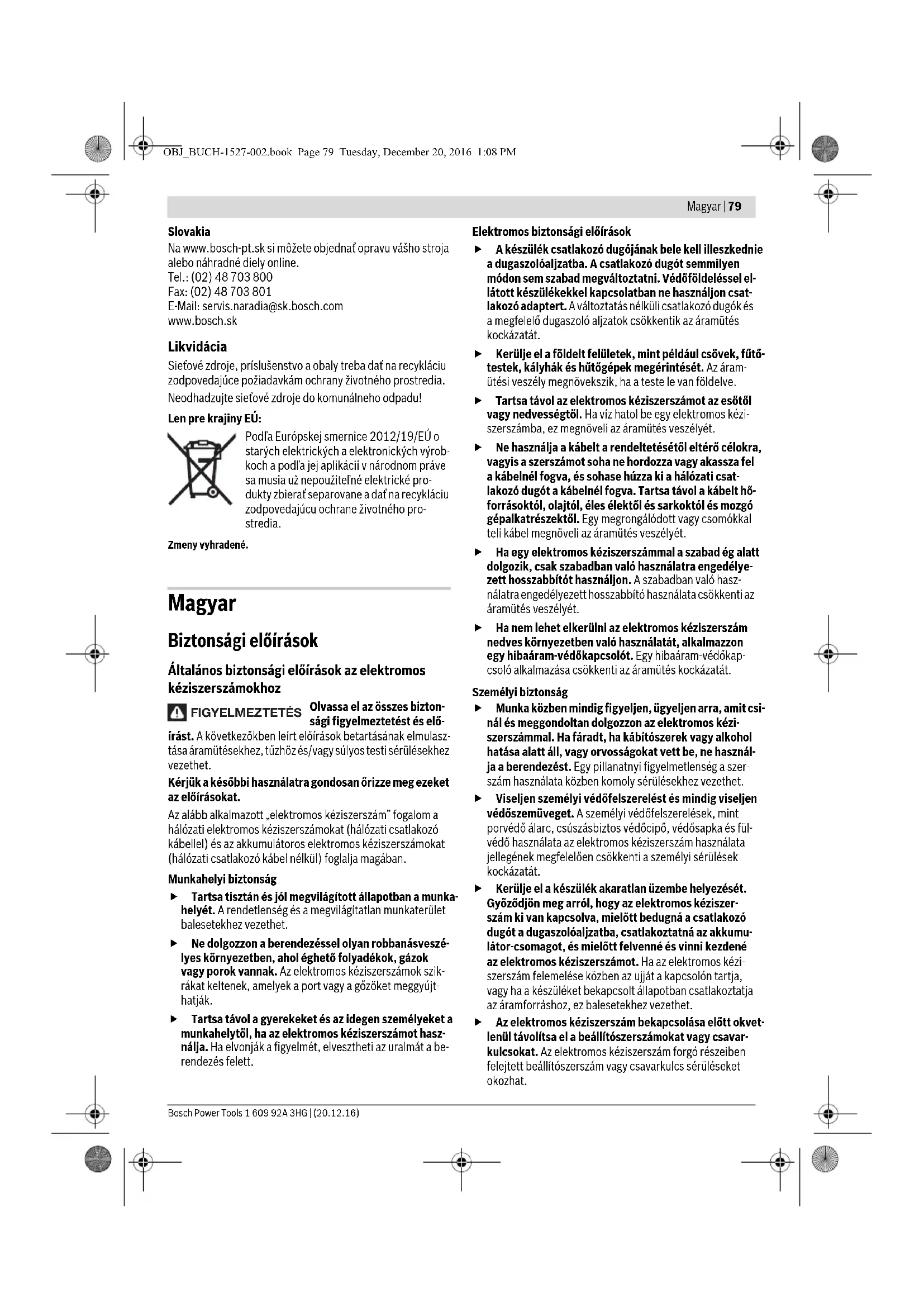 lbs 2,6 5,7 2,6 5,7 Trieda ochrany /I /I OBJ_BUCH-1527-002.book Page 77 Tuesday, December 20, 2016 1:08 PM78 | Slovensky 1 609 92A 3HG | (20.12.16) Bosch Power Tools Odpojenie od zdroja elektrickej energie Najprv vždy vytiahnite zástrčku 11 z elektrickej zásuvky. Po- tom vytiahnite zástrčku 9 sieťovej šnúry z pripájacej zásuvky 10 sieťového zdroja. Najprv vždy odpojte pripojenie na zásuvku, aby ste sa vyhli prípadnému zásahu elektrickým prúdom. Prevádzka Uvedenie do prevádzky Zapnutie/vypnutie sieťového zdroja PUC-EXACT (pozri obrázok C) Najprv musíte zapnúť sieťový zdroj PUC-EXACT zapnúť ručné elektrické náradie C-EXACT (pozri k tomu odsek „Prípojka na zdroj elektrického prúdu“, strana 77). Keď chcete zapnúť sieťový zdroj, stlačte vypínač 2 na sieťo- vom zdroji do pozície 1. Nazeleno svietiaca LED indikácia 3 zobrazuje, že sieťový zdroj je pripravený na prevádzku. PUC-EXACT 1: Ak svieti LED indikácia 4, napätie je prítomné. Ak chcete sieťový zdroj vypnúť, zatlačte vypínač sieťového zdroja 2 do polohy 0. Z dôvodu energetickej úspory sieťový zdroj len vtedy, keď ho používate. Zapnutie a vypnutie ručného elektrického nára- dia Priame elektrické skrutkovače s pákovým spúšťaním (pozri obrázok D) Ak chcete zapnúť ručné elektrické náradie stlačte vypínač 2 až na doraz. Toto ručné elektrické náradie sa vždy automaticky vypne, len čo sa dosiahne nastavený krútiaci moment. V prípade predčasného uvoľnenia vypínača 2 sa nasta- vený krútiaci moment nedosiahne. Priame elektrické skrutkovače s tlakovým spúšťaním Ak chcete ručné elektrické náradie zapnúť, priložte ručné elektrické náradie na skrutku a vyviňte mierny tlak axiálne na skrutkovač. Toto ručné elektrické náradie sa vždy automaticky vypne, len čo sa dosiahne nastavený krútiaci moment. V prípade predčasného uvoľnenia skrutkovača, naprík- lad keď sa pracovný nástroj skrutkovača zo skrutky zošmykne, sa nastavený krútiaci moment nedosiahne. Pokyny na používanie Pri práci dávajte pozor na to, aby ste sieťový zdroj náhodou neúmyselne nestiahli z pracovnej plochy. Sieťový zdroj buď spoľahlivo upevnite na stenu, alebo prívodnú elektrickú šnúru uložte tak, aby ste sa o ňu nemohli potknúť. Ochrana proti preťaženiu (PUC-EXACT 1) V prípade preťaženia sieťového zdroja sa rozsvieti indikácia LED 4 sa rozsvieti a signalizuje takýmto spôsobom poruchu. Zastavte ihneď prácu. Vypnite skrutkovač a takisto sieťový zdroj. Skontrolujte skrutkovač aj prívodnú elektrickú šnúru náradia. Poškodené súčiastky vymeňte. Potom znova zapnite sieťový zdroj aj skrutkovač. Ak indikácia 4 ešte stále svieti, je pokazený sieťový zdroj. Daj- te ho opraviť do niektorého autorizovaného servisného stre- diska ručného elektrického náradia Bosch. Údržba a servis Údržba a čistenie Skôr ako budete vykonávať čistiace práce, odpojte sie- ťový napájač PUC-EXACT od elektrickej siete. Tým sa vyhnete nebezpečenstvu zásahu elektrickým prúdom. Sa- motné vypnutie sieťového zdroja nestačí. Tento sieťový zdroj si nevyžaduje žiadnu údržbu. Prístroj a vetracie štrbiny udržiavajte vždy voľné a čisté. Pripájacie zásuvky, spojky a zástrčku sieťového zdroja odpo- jeného od elektrickej siete pravidelne čistite pomocou suchej handričky, ktorá nepúšťa chlpy a odstraňujte z nich čiastočky prachu a drobné nečistoty. Ak je potrebná výmena prívodnej šnúry, musí ju vykonať firma Bosch alebo niektoré autorizované servisné stredisko ručné- ho elektrického náradia Bosch, aby sa zabránilo ohrozeniu bezpečnosti používateľa náradia. Práce na údržbe a oprave dávajte vykonávať výlučne iba kvalifikovanému odbornému personálu. Takýmto spôsobom sa zaručí, že bezpečnosť náradia zostane za- chovaná. Autorizované servisné stredisko Bosch vykonáva tieto práce rýchlo a spoľahlivo. Mastiace a čistiace prostriedky likvidujte so zreteľom na ochranu životného prostredia. Dodržiavajte zákon- né predpisy. Príslušenstvo O kompletnom programe kvalitného príslušenstva sa môžete informovať na internetových stránkach www.bosch-pt.com a www.boschproductiontools.com alebo u svojho autorizova- ného predajcu. Servisné stredisko a poradenstvo pri používaní Servisné stredisko Vám odpovie na otázky týkajúce sa opravy a údržby Vášho produktu ako aj náhradných súčiastok. Rozlo- žené obrázky a informácie k náhradným súčiastkam nájdete aj na web-stránke: www.bosch-pt.com Tím poradcov Bosch Vám s radosťou poskytne pomoc pri otázkach týkajúcich sa našich produktov a ich príslušenstva. V prípade akýchkoľvek otázok a objednávok náhradných sú- čiastok uvádzajte bezpodmienečne 10-miestne vecné číslo uvedené na typovom štítku výrobku. OBJ_BUCH-1527-002.book Page 78 Tuesday, December 20, 2016 1:08 PMMagyar | 79 Bosch Power Tools 1 609 92A 3HG | (20.12.16) Slovakia Na www.bosch-pt.sk si môžete objednať opravu vášho stroja alebo náhradné diely online. Tel.: (02) 48 703 800 Fax: (02) 48 703 801 E-Mail: servis.naradia@sk.bosch.com www.bosch.sk Likvidácia Sieťové zdroje, príslušenstvo a obaly treba dať na recykláciu zodpovedajúce požiadavkám ochrany životného prostredia. Neodhadzujte sieťové zdroje do komunálneho odpadu! Len pre krajiny EÚ: Podľa Európskej smernice 2012/19/EÚ o starých elektrických a elektronických výrob- koch a podľa jej aplikácií v národnom práve sa musia už nepoužiteľné elektrické pro- dukty zbierať separovane a dať na recykláciu zodpovedajúcu ochrane životného pro- stredia. Zmeny vyhradené. Magyar Biztonsági előírások Általános biztonsági előírások az elektromos kéziszerszámokhoz Olvassa el az összes bizton- sági figyelmeztetést és elő- írást. A következőkben leírt előírások betar