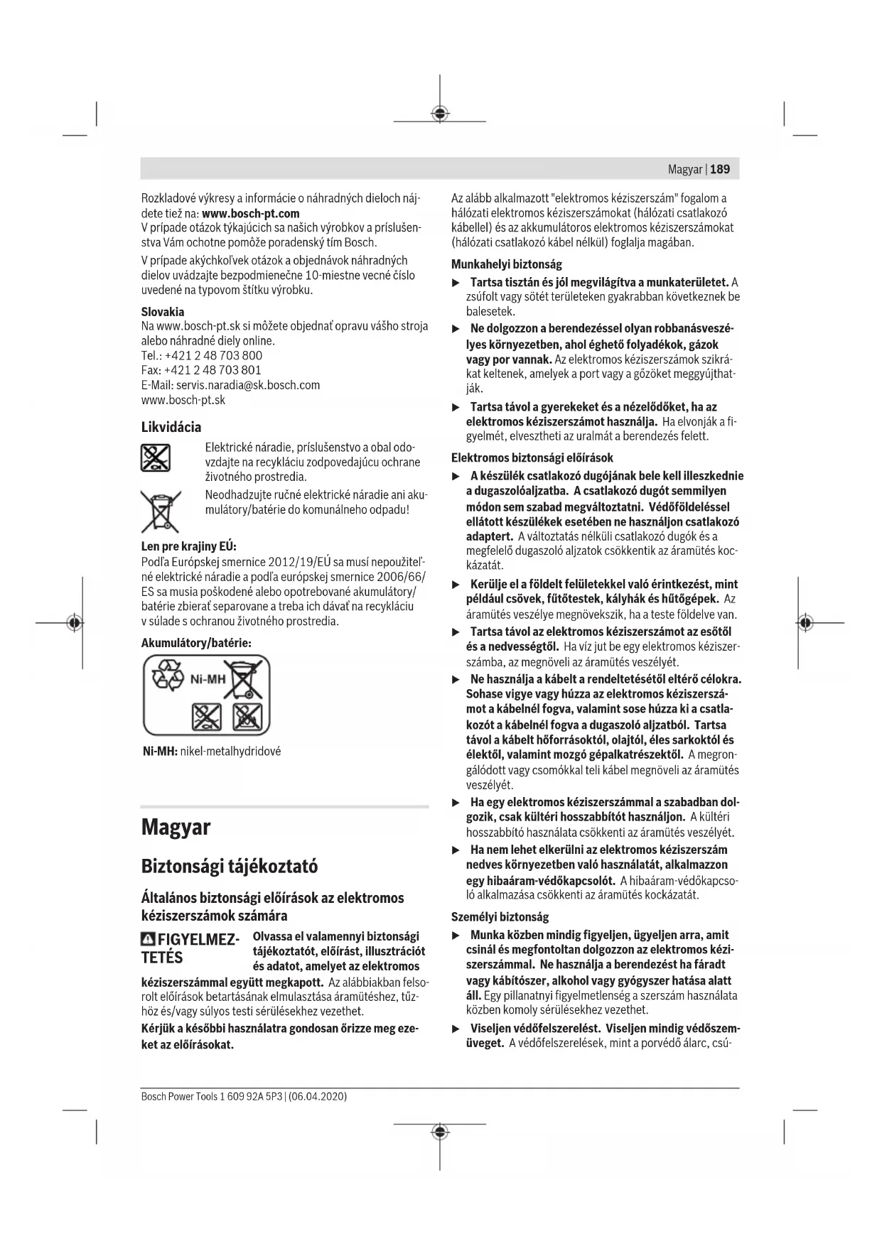 Az ezen utasításokban megadott rezgésszint és zajkibocsátá- si érték egy szabványban rögzített mérési módszerrel került meghatározásra és az elektromos kéziszerszámok egymással Bosch Power Tools 1 609 92A 5P3 | (06.04.2020)196 | Magyar való összehasonlítására alkalmazható. Ez az érték a rezgés- és zajkibocsátás ideiglenes becslésére is alkalmas. A megadott rezgésszint és zajkibocsátási érték az elektro- mos kéziszerszám fő alkalmazásaira vonatkozik. Ha az elekt- romos kéziszerszámot más alkalmazásokra, eltérő betétszer- számokkal vagy nem kielégítő karbantartás mellett használ- ják, a rezgésszint és a zajkibocsátási érték a fenti értékektől eltérhet. Ez az egész munkaidőre vonatkozó rezgés- és zajki- bocsátást lényegesen megnövelheti. A rezgés- és zajkibocsátás pontos megbecsüléséhez figye- lembe kell venni azokat az időszakokat is, amikor a készülék kikapcsolt állapotban van, vagy amikor be van ugyan kap- csolva, de nem kerül ténylegesen használatra. Ez az egész munkaidőre vonatkozó rezgés- és zajkibocsátást lényegesen csökkentheti. Hozzon kiegészítő biztonsági intézkedéseket a kezelőnek a rezgések hatása elleni védelmére, például: Az elektromos ké- ziszerszám és a betétszerszámok karbantartása, a kezek me- legen tartása, a munkamenetek megszervezése. Összeszerelés Szállítmány tartalma Az ipari akkumulátoros csavarozógépek akkumulátorcsomag nélkül, az ipari akkumulátoros könyökös csavarozógépek pe- dig könyökös csavarozófej és akkumulátorcsomag nélkül ke- rülnek kiszállításra. Az alkalmas tartozékok kiválasztásához kérjük forduljon a Bosch ipari szerszámok szakboltjához. Üzemi és tárolási környezet Az elektromos kéziszerszám kizárólag zárt he- lyen történő használatra alkalmas. A készülék kifogástalan üzemének biztosításá- ra a környezeti hőmérsékletnek a megengedett környezeti hőmérséklet tartományban, –5 °C és +50 °C (23 °F és 122 °F) között, kell lennie, a levegő megengedett relatív nedves- ségtartalma 20 és 95 % között lehet, harmatképződés nél- kül. Az akkumulátort 0 °C (32 °F) és 45 °C (113 °F) közötti hő- mérsékleten kell tárolni, nehogy az akkumulátorcellák meg- rongálódjanak. A könyökös csavarozó fej felszerelése BT-ANGLEEXACT 2 | 3 | 6 | 7 | 8 | 15 | 17 | 23 | 30 Ezekre az ipari akkumulátoros könyökös csavarozó készülé- kekre először egy hozzáillő könyökös csavarozó fejet (lásd „Műszaki adatok”, Oldal192) kell felszerelni. u Győződjön meg arról, hogy a forgásirány-átkapcsoló a középső helyzetben áll (bekapcsolás reteszelése), vagy hogy az akkumulátort kivették az elektromos ké- ziszerszámból, mielőtt csavarozó fejet felszerelne, be- állítana vagy leszerelne. Tartsa az elektromos kéziszerszámot a (6) villáskulccsal a könyökös csavarozó fej karimájának (5) kulcsfelületénél fog- va. u Az elektromos kéziszerszámot sohase fogja be a ház két felénél fogva. Tegye fel a (3) könyökös csavarozó fejet a kívánt helyzetben a karimára, és a (16) kulcsfelületre felhelyezett (4) villás- kulccsal húzza meg szorosra a hollandianyát. Eközben tartson ellen a sarokfej karimáján a (6) villáskulcs- csal. BT-ANGLEEXACT 23 | 30 Ezeket az ipari akkumulátoros könyökös csavarozókat csak a 0607451618 számú könyökös csavarozó fejjel lehet üze- meltetni. Felakasztó szerkezet A (8) felakasztó kengyel segítségével az elektromos kéziszer- számot egy felakasztó szerkezetre lehet rögzíteni. Tegye fel a (8) felakasztó kengyelt az elektromos kéziszer- számra, és pattintsa be a (14) résbe. u Rendszeresen ellenőrizze a felakasztó kengyel és a felakasztó szerkezetben található horog állapotát. Töltési folyamat Figyelem: Töltőkészülékek és akkumulátorok nem részei a szállítmánynak. Az ábrán látható hálózati csatlakozó dugó eltérhet az Ön elektromos kéziszerszámán található csatlakozó dugótól. u Ügyeljen arra, hogy a töltőkészülék és az akkumulátor megfeleljen az adott ország villamos hálózatának. AL 2450 DV töltőkészülék (lásd a Aábrát) Csatlakoztassa a (21) töltőkészüléket a (22) hálózati csatla- kozó dugóval az elektromos energiaellátáshoz és dugja be a (18) akkumulátort a helyes helyzetben a töltőkészülék töltő- kosarába. u Az akkumulátor behelyezésekor/kivételekor ne alkal- mazzon erőszakot. Az APT csatlakozó érintkezővel (Akku Pack Top) ellátott akkumulátoroknak olyan a kivitele, hogy azokat csak a helyes helyzetben lehet az elektromos kéziszerszámba vagy a töltőkészülékbe behelyezni. A zöld (23) LED-kijelző villogni kezd. Ez azt jelzi, hogy folyik a töltőáram. A töltési folyamat automatikusan leáll, amikor az akkumulátor teljesen feltöltött állapotba került. Ha zöld LED- kijelző már nem villog, hanem egyenletesen világít, a töltési folyamat befejeződött. Ekkor kb. 2másodpercre felhangzik egy akusztikus jel, ez azt jelenti, hogy az akkumulátor telje- sen fel van töltve. A piros (24) LED tartós fénye a csökkentett töltőáramú tölté- si eljárást jelzi. Ha a piros LED-kijelző villog, akkor töltésre nincs lehetőség. Hibák – okaik és elhárításuk módja A hiba oka Hibaelhárítás A LED-kijelzők nem világítanak A töltőkészülék hálózati csat- lakozó dugója nincs (helye- sen) bedugva Dugja be (helyesen) a hálóza- ti csatlakozó dugót a duga- szolóaljzatba 1 609 92A 5P3 | (06.04.2020) Bosch Power ToolsMagyar | 197 A hiba oka Hibaelhárítás A dugaszolóaljzat, a hálózati tápvezeték vagy a töltőkészü- lék meghibásodott Vizsgálja meg a hálózati fe- szültséget, szükség esetén egy Bosch-elektromos kézi- szerszám vevőszolgálat mű- helyében vizsgáltassa meg a töltőkészüléket Töltési folyamatra nincs lehet