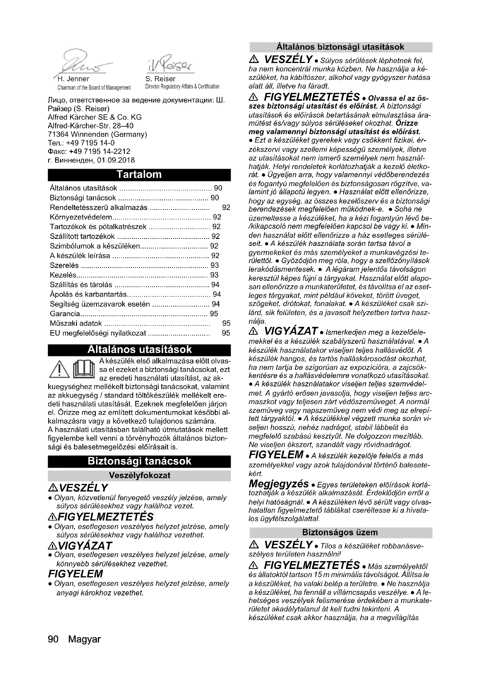 - 1,5 LBB 1060/36 Battery90 Magyar Лицо, ответственное за ведение документации: Ш. Райзер (S. Reiser) Alfred Kärcher SE & Co. KG Alfred-Kärcher-Str. 28–40 71364 Winnenden (Germany) Тел.: +49 7195 14-0 Факс: +49 7195 14-2212 г. Винненден, 01.09.2018 Tartalom Általános utasítások A készülék első alkalmazása előtt olvas- sa el ezeket a biztonsági tanácsokat, ezt az eredeti használati utasítást, az ak- kuegységhez mellékelt biztonsági tanácsokat, valamint az akkuegység / standard töltőkészülék mellékelt ere- deti használati utasítását. Ezeknek megfelelően járjon el. Őrizze meg az említett dokumentumokat későbbi al- kalmazásra vagy a következő tulajdonos számára. A használati utasításban található útmutatások mellett figyelembe kell venni a törvényhozók általános bizton- sági és balesetmegelőzési előírásait is. Biztonsági tanácsok Veszélyfokozat VESZÉLY ● Olyan, közvetlenül fenyegető veszély jelzése, amely súlyos sérülésekhez vagy halálhoz vezet. 몇 FIGYELMEZTETÉS ● Olyan, esetlegesen veszélyes helyzet jelzése, amely súlyos sérülésekhez vagy halálhoz vezethet. 몇 VIGYÁZAT ● Olyan, esetlegesen veszélyes helyzet jelzése, amely könnyebb sérülésekhez vezethet. FIGYELEM ● Olyan, esetlegesen veszélyes helyzet jelzése, amely anyagi károkhoz vezethet. Általános biztonsági utasítások VESZÉLY ● Súlyos sérülések léphetnek fel, ha nem koncentrál munka közben. Ne használja a ké- szüléket, ha kábítószer, alkohol vagy gyógyszer hatása alatt áll, illetve ha fáradt. 몇 FIGYELMEZTETÉS ● Olvassa el az ös- szes biztonsági utasítást és előírást. A biztonsági utasítások és előírások betartásának elmulasztása ára- mütést és/vagy súlyos sérüléseket okozhat. Őrizze meg valamennyi biztonsági utasítást és előírást. ● Ezt a készüléket gyerekek vagy csökkent fizikai, ér- zékszervi vagy szellemi képességű személyek, illetve az utasításokat nem ismerő személyek nem használ- hatják. Helyi rendeletek korlátozhatják a kezelő életko- rát. ● Ügyeljen arra, hogy valamennyi védőberendezés és fogantyú megfelelően és biztonságosan rögzítve, va- lamint jó állapotú legyen. ● Használat előtt ellenőrizze, hogy az egység, az összes kezelőszerv és a biztonsági berendezések megfelelően működnek-e. ● Soha ne üzemeltesse a készüléket, ha a kézi fogantyún lévő be- /kikapcsoló nem megfelelően kapcsol be vagy ki. ● Min- den használat előtt ellenőrizze a ház esetleges sérülé- seit. ● A készülék használata során tartsa távol a gyermekeket és más személyeket a munkavégzési te- rülettől. ● Győződjön meg róla, hogy a szellőzőnyílások lerakódásmentesek. ● A légáram jelentős távolságon keresztül képes fújni a tárgyakat. Használat előtt alapo- san ellenőrizze a munkaterületet, és távolítsa el az eset- leges tárgyakat, mint például köveket, törött üveget, szögeket, drótokat, fonalakat. ● A készüléket csak szi- lárd, sík felületen, és a javasolt helyzetben tartva hasz- nálja. 몇 VIGYÁZAT ● Ismerkedjen meg a kezelőele- mekkel és a készülék szabályszerű használatával. ● A készülék használatakor viseljen teljes hallásvédőt. A készülék hangos, és tartós halláskárosodást okozhat, ha nem tartja be szigorúan az expozícióra, a zajcsök- kentésre és a hallásvédelemre vonatkozó utasításokat. ● A készülék használatakor viseljen teljes szemvédel- met. A gyártó erősen javasolja, hogy viseljen teljes arc- maszkot vagy teljesen zárt védőszemüveget. A normál szemüveg vagy napszemüveg nem védi meg az elrepí- tett tárgyaktól. ● A készülékkel végzett munka során vi- seljen hosszú, nehéz nadrágot, stabil lábbelit és megfelelő szabású kesztyűt. Ne dolgozzon mezítláb. Ne viseljen ékszert, szandált vagy rövidnadrágot. FIGYELEM ● A készülék kezelője felelős a más személyekkel vagy azok tulajdonával történő balesete- kért. Megjegyzés ● Egyes területeken előírások korlá- tozhatják a készülék alkalmazását. Érdeklődjön erről a helyi hatóságnál. ● A készüléken lévő sérült vagy olvas- hatatlan figyelmeztető táblákat cseréltesse ki a hivata- los ügyfélszolgálattal. Biztonságos üzem VESZÉLY ● Tilos a készüléket robbanásve- szélyes területen használni! 몇 FIGYELMEZTETÉS ● Más személyektől és állatoktól tartson 15 m minimális távolságot. Állítsa le a készüléket, ha valaki belép a területre. ● Ne használja a készüléket, ha fennáll a villámcsapás veszélye. ● A le- hetséges veszélyek felismerése érdekében a munkate- rületet akadálytalanul át kell tudni tekinteni. A készüléket csak akkor használja, ha a megvilágítás Általános utasítások p. 90