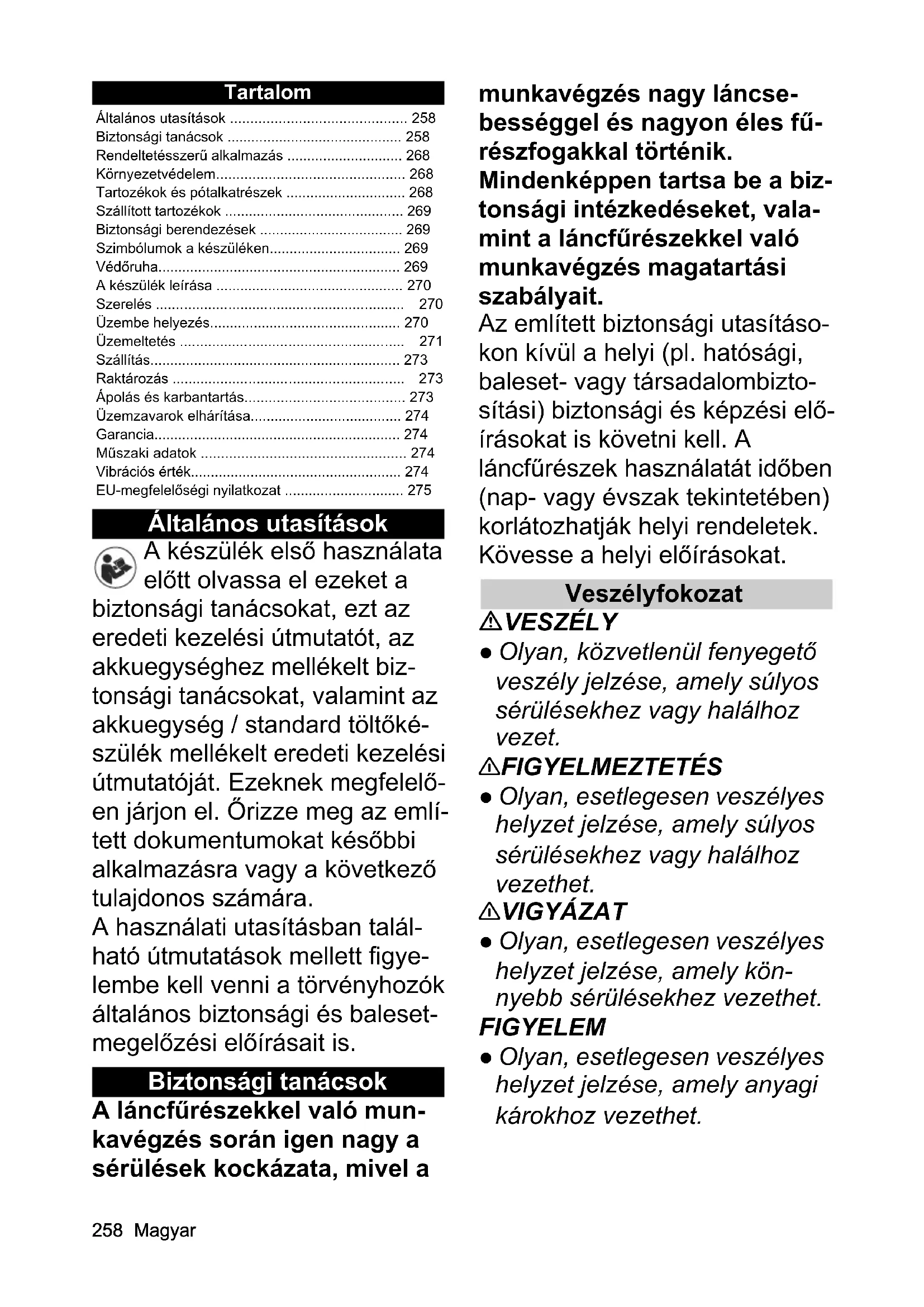 • kg 5,0 Chairman of the Board of ManagementDirector Regulatory Affairs & Certification H. Jenner S. Reiser258 Magyar Tartalom Általános utasítások A készülék első használata előtt olvassa el ezeket a biztonsági tanácsokat, ezt az eredeti kezelési útmutatót, az akkuegységhez mellékelt biz- tonsági tanácsokat, valamint az akkuegység / standard töltőké- szülék mellékelt eredeti kezelési útmutatóját. Ezeknek megfelelő- en járjon el. Őrizze meg az emlí- tett dokumentumokat későbbi alkalmazásra vagy a következő tulajdonos számára. A használati utasításban talál- ható útmutatások mellett figye- lembe kell venni a törvényhozók általános biztonsági és baleset- megelőzési előírásait is. Biztonsági tanácsok A láncfűrészekkel való mun- kavégzés során igen nagy a sérülések kockázata, mivel a munkavégzés nagy láncse- bességgel és nagyon éles fű- részfogakkal történik. Mindenképpen tartsa be a biz- tonsági intézkedéseket, vala- mint a láncfűrészekkel való munkavégzés magatartási szabályait. Az említett biztonsági utasításo- kon kívül a helyi (pl. hatósági, baleset- vagy társadalombizto- sítási) biztonsági és képzési elő- írásokat is követni kell. A láncfűrészek használatát időben (nap- vagy évszak tekintetében) korlátozhatják helyi rendeletek. Kövesse a helyi előírásokat. Veszélyfokozat VESZÉLY ● Olyan, közvetlenül fenyegető veszély jelzése, amely súlyos sérülésekhez vagy halálhoz vezet. 몇 FIGYELMEZTETÉS ● Olyan, esetlegesen veszélyes helyzet jelzése, amely súlyos sérülésekhez vagy halálhoz vezethet. 몇 VIGYÁZAT ● Olyan, esetlegesen veszélyes helyzet jelzése, amely kön- nyebb sérülésekhez vezethet. FIGYELEM ● Olyan, esetlegesen veszélyes helyzet jelzése, amely anyagi károkhoz vezethet. Általános utasítások p. 258