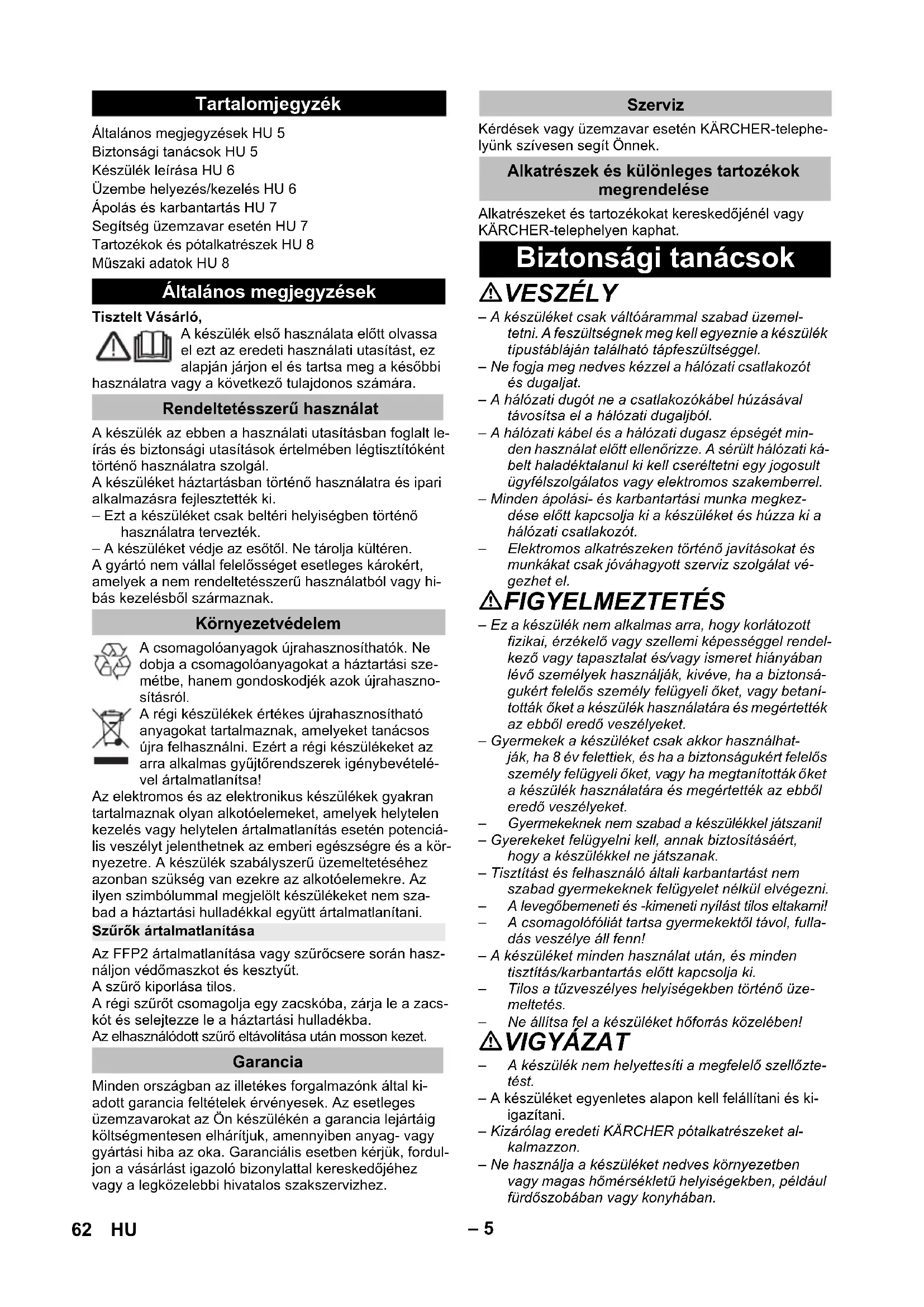61RU– 5 Tisztelt Vásárló, A készülék első használata előtt olvassa el ezt az eredeti használati utasítást, ez alapján járjon el és tartsa meg a későbbi használatra vagy a következő tulajdonos számára. A készülék az ebben a használati utasításban foglalt le- írás és biztonsági utasítások értelmében légtisztítóként történő használatra szolgál. A készüléket háztartásban történő használatra és ipari alkalmazásra fejlesztették ki. – Ezt a készüléket csak beltéri helyiségben történő használatra tervezték. – A készüléket védje az esőtől. Ne tárolja kültéren. A gyártó nem vállal felelősséget esetleges károkért, amelyek a nem rendeltetésszerű használatból vagy hi- bás kezelésből származnak. A csomagolóanyagok újrahasznosíthatók. Ne dobja a csomagolóanyagokat a háztartási sze- métbe, hanem gondoskodjék azok újrahaszno- sításról. A régi készülékek értékes újrahasznosítható anyagokat tartalmaznak, amelyeket tanácsos újra felhasználni. Ezért a régi készülékeket az arra alkalmas gyűjtőrendszerek igénybevételé- vel ártalmatlanítsa! Az elektromos és az elektronikus készülékek gyakran tartalmaznak olyan alkotóelemeket, amelyek helytelen kezelés vagy helytelen ártalmatlanítás esetén potenciá- lis veszélyt jelenthetnek az emberi egészségre és a kör- nyezetre. A készülék szabályszerű üzemeltetéséhez azonban szükség van ezekre az alkotóelemekre. Az ilyen szimbólummal megjelölt készülékeket nem sza- bad a háztartási hulladékkal együtt ártalmatlanítani. Az FFP2 ártalmatlanítása vagy szűrőcsere során hasz- náljon védőmaszkot és kesztyűt. A szűrő kiporlása tilos. A régi szűrőt csomagolja egy zacskóba, zárja le a zacs- kót és selejtezze le a háztartási hulladékba. Az elhasználódott szűrő eltávolítása után mosson kezet. Minden országban az illetékes forgalmazónk által ki- adott garancia feltételek érvényesek. Az esetleges üzemzavarokat az Ön készülékén a garancia lejártáig költségmentesen elhárítjuk, amennyiben anyag- vagy gyártási hiba az oka. Garanciális esetben kérjük, fordul- jon a vásárlást igazoló bizonylattal kereskedőjéhez vagy a legközelebbi hivatalos szakszervizhez. Kérdések vagy üzemzavar esetén KÄRCHER-telephe- lyünk szívesen segít Önnek. Alkatrészeket és tartozékokat kereskedőjénél vagy KÄRCHER-telephelyen kaphat. VESZÉLY – A készüléket csak váltóárammal szabad üzemel- tetni. A feszültségnek meg kell egyeznie a készülék típustábláján található tápfeszültséggel. – Ne fogja meg nedves kézzel a hálózati csatlakozót és dugaljat. – A hálózati dugót ne a csatlakozókábel húzásával távosítsa el a hálózati dugaljból. – A hálózati kábel és a hálózati dugasz épségét min- den használat előtt ellenőrizze. A sérült hálózati ká- belt haladéktalanul ki kell cseréltetni egy jogosult ügyfélszolgálatos vagy elektromos szakemberrel. – Minden ápolási- és karbantartási munka megkez- dése előtt kapcsolja ki a készüléket és húzza ki a hálózati csatlakozót. – Elektromos alkatrészeken történő javításokat és munkákat csak jóváhagyott szerviz szolgálat vé- gezhet el. FIGYELMEZTETÉS – Ez a készülék nem alkalmas arra, hogy korlátozott fizikai, érzékelő vagy szellemi képességgel rendel- kező vagy tapasztalat és/vagy ismeret hiányában lévő személyek használják, kivéve, ha a biztonsá- gukért felelős személy felügyeli őket, vagy betaní- tották őket a készülék használatára és megértették az ebből eredő veszélyeket. – Gyermekek a készüléket csak akkor használhat- ják, ha 8 év felettiek, és ha a biztonságukért felelős személy felügyeli őket, vagy ha megtanították őket a készülék használatára és megértették az ebből eredő veszélyeket. – Gyermekeknek nem szabad a készülékkel játszani! – Gyerekeket felügyelni kell, annak biztosításáért, hogy a készülékkel ne játszanak. – Tisztítást és felhasználó általi karbantartást nem szabad gyermekeknek felügyelet nélkül elvégezni. – A levegőbemeneti és -kimeneti nyílást tilos eltakarni! – A csomagolófóliát tartsa gyermekektől távol, fulla- dás veszélye áll fenn! – A készüléket minden használat után, és minden tisztítás/karbantartás előtt kapcsolja ki. – Tilos a tűzveszélyes helyiségekben történő üze- meltetés. – Ne állítsa fel a készüléket hőforrás közelében! VIGYÁZAT – A készülék nem helyettesíti a megfelelő szellőzte- tést. – A készüléket egyenletes alapon kell felállítani és ki- igazítani. – Kizárólag eredeti KÄRCHER pótalkatrészeket al- kalmazzon. – Ne használja a készüléket nedves környezetben vagy magas hőmérsékletű helyiségekben, például fürdőszobában vagy konyhában. Tartalomjegyzék Általános megjegyzések HU 5 Biztonsági tanácsok HU 5 Készülék leírása HU 6 Üzembe helyezés/kezelés HU 6 Ápolás és karbantartás HU 7 Segítség üzemzavar esetén HU 7 Tartozékok és pótalkatrészek HU 8 Műszaki adatok HU 8 Általános megjegyzések Rendeltetésszerű használat Környezetvédelem Szűrők ártalmatlanítása Garancia Szerviz Alkatrészek és különleges tartozékok megrendelése Biztonsági tanácsok 62 HU– 6 VESZÉLY Közvetlenül fenyegető veszélyre való figyelmeztetés, amely súlyos testi sérüléshez vagy halálhoz vezet. 몇 FIGYELMEZTETÉS Lehetséges veszélyes helyzetre való figyelmeztetés, amely súlyos testi sérüléshez vagy halálhoz vezethet. 몇 VIGYÁZAT Figyelmeztetés esetlegesen veszélyes helyzetre, amely könnyű sérüléshez vezethet. FIGYELEM Lehetséges veszélyes helyzetre való figyelmeztetés, amely anyagi kárhoz vezethet. Ellenőrizze kicsomagoláskor a csomag tartalmának tel- jességét és sértetlensé