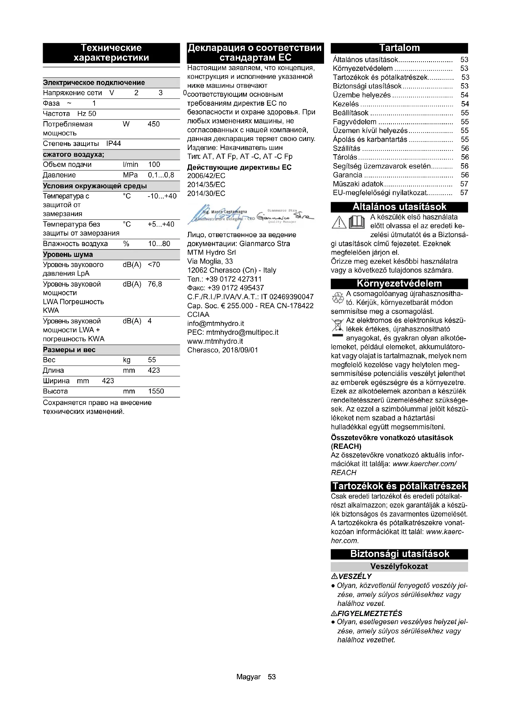 .: +39 0172 427311 Факс: +39 0172 495437 C.F./R.I./P.IVA/V.A.T.: IT 02469390047 Cap. Soc. € 255.000 - REA CN-178422 CCIAA info@mtmhydro.it PEC: mtmhydro@multipec.it www.mtmhydro.it Cherasco, 2018/09/01 Tartalom Általános utasítások A készülék első használata előtt olvassa el az eredeti ke- zelési útmutatót és a Biztonsá- gi utasítások című fejezetet. Ezeknek megfelelően járjon el. Őrizze meg ezeket későbbi használatra vagy a következő tulajdonos számára. Környezetvédelem A csomagolóanyag újrahasznosítha- tó. Kérjük, környezetbarát módon semmisítse meg a csomagolást. Az elektromos és elektronikus készü- lékek értékes, újrahasznosítható anyagokat, és gyakran olyan alkotóe- lemeket, például elemeket, akkumulátoro- kat vagy olajat is tartalmaznak, melyek nem megfelelő kezelése vagy helytelen meg- semmisítése potenciális veszélyt jelenthet az emberek egészségre és a környezetre. Ezek az alkotóelemek azonban a készülék rendeltetésszerű üzemeléséhez szüksége- sek. Az ezzel a szimbólummal jelölt készü- lékeket nem szabad a háztartási hulladékkal együtt megsemmisíteni. Összetevőkre vonatkozó utasítások (REACH) Az összetevőkre vonatkozó aktuális infor- mációkat itt találja: www.kaercher.com/ REACH Tartozékok és pótalkatrészek Csak eredeti tartozékot és eredeti pótalkat- részt alkalmazzon; ezek garantálják a készü- lék biztonságos és zavarmentes üzemelését. A tartozékokra és pótalkatrészekre vonat- kozóan információkat itt talál: www.kaerc- her.com. Biztonsági utasítások Veszélyfokozat VESZÉLY ● Olyan, közvetlenül fenyegető veszély jel- zése, amely súlyos sérülésekhez vagy halálhoz vezet. 몇 FIGYELMEZTETÉS ● Olyan, esetlegesen veszélyes helyzet jel- zése, amely súlyos sérülésekhez vagy halálhoz vezethet. Электрическое подключение Напряжение сети V230 Фаза ~1 Частота Hz 50 Потребляемая