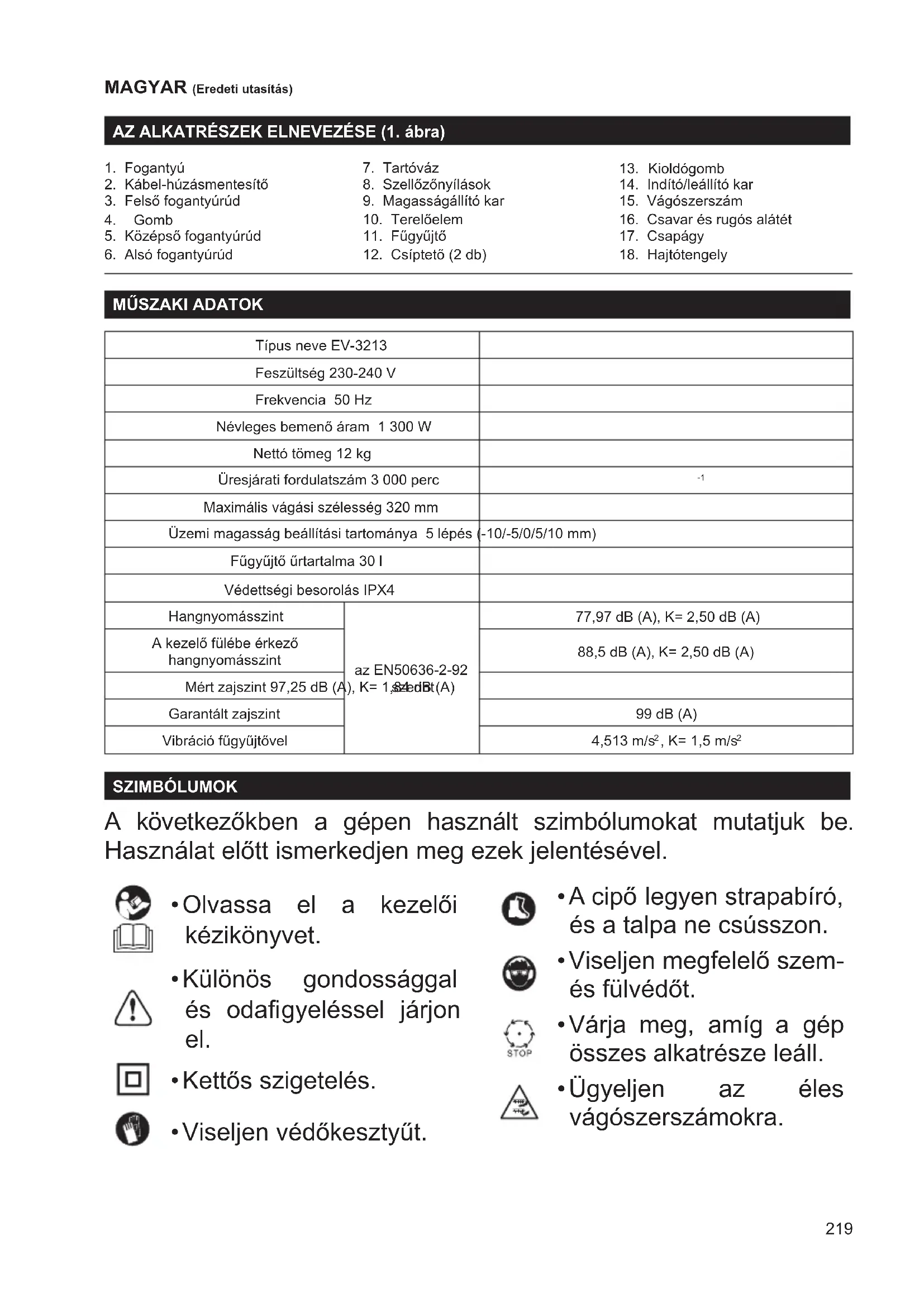 Maximális vágási szélesség 320 mm Üzemi magasság beállítási tartománya 5 lépés (-10/-5/0/5/10 mm) Fűgyűjtő űrtartalma 30 l Védettségi besorolás IPX4 Hangnyomásszint az EN50636-2-92 szerint 77,97 dB (A), K= 2,50 dB (A) A kezelő fülébe érkező hangnyomásszint 88,5 dB (A), K= 2,50 dB (A) Mért zajszint 97,25 dB (A), K= 1,84 dB (A) Garantált zajszint 99 dB (A) Vibráció fűgyűjtővel 4,513 m/s