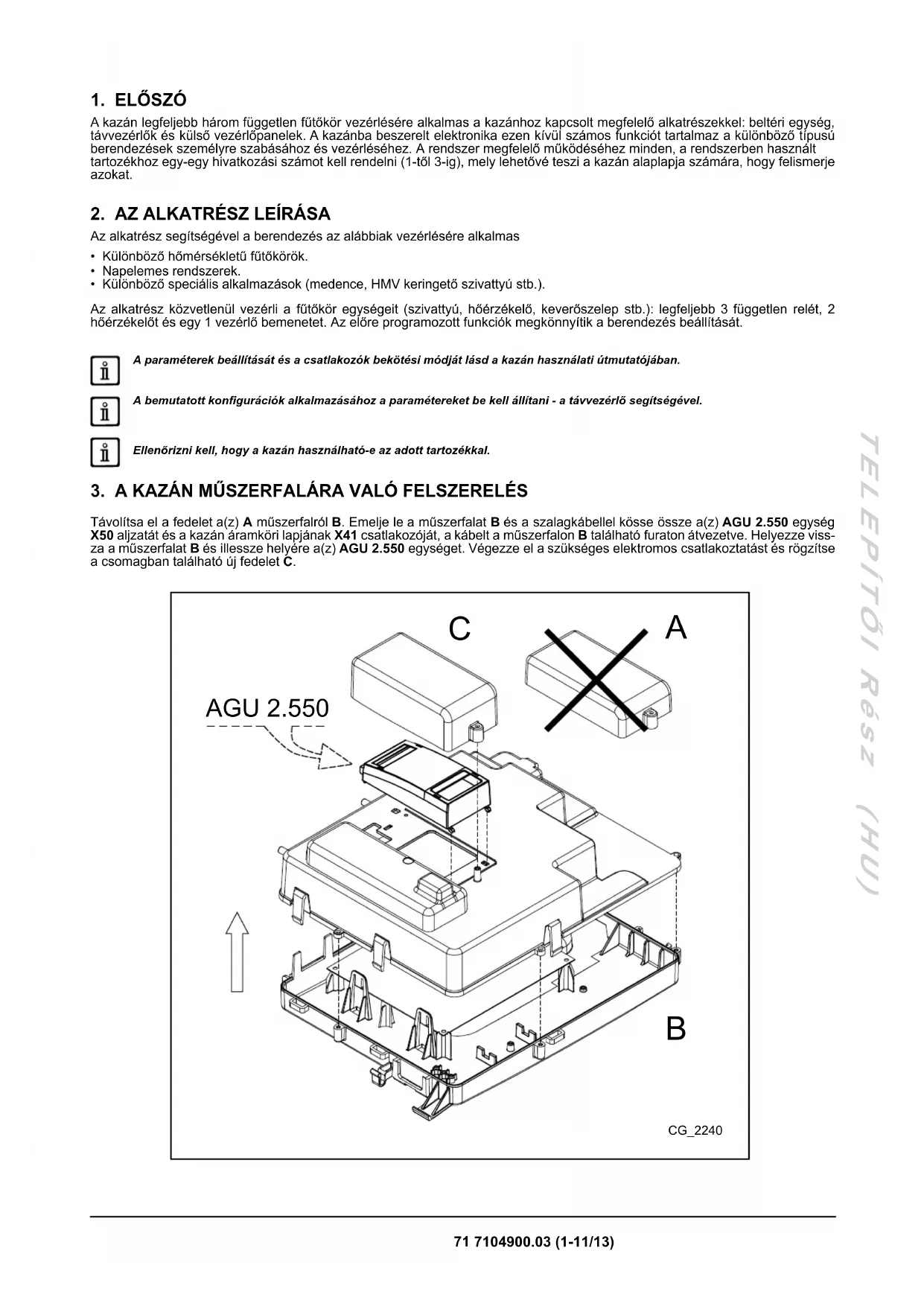 Távolítsa el a fedelet a(z) A műszerfalról B. Emelje le a műszerfalat B és a szalagkábellel kösse össze a(z) AGU 2.550 egység X50 aljzatát és a kazán áramköri lapjának X41 csatlakozóját, a kábelt a műszerfalon B található furaton átvezetve. Helyezze viss- za a műszerfalat B és illessze helyére a(z) AGU 2.550 egységet. Végezze el a szükséges elektromos csatlakoztatást és rögzítse a csomagban található új fedelet C.