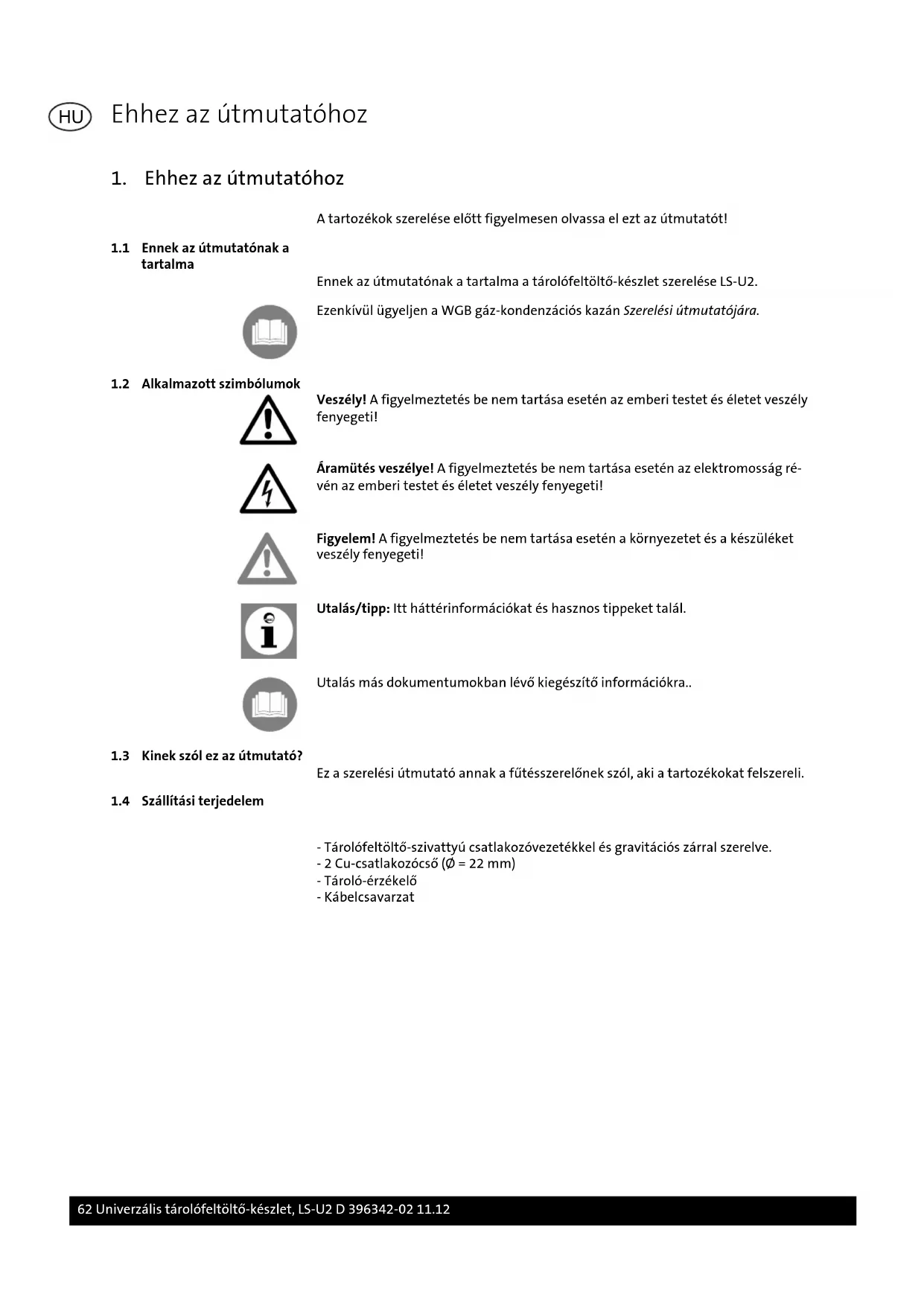 - Tárolófeltöltő-szivattyú csatlakozóvezetékkel és gravitációs zárral szerelve. - 2 Cu-csatlakozócső (Ø = 22 mm) - Tároló-érzékelő - Kábelcsavarzat Ehhez az útmutatóhoz 62 Univerzális tárolófeltöltő-készlet, LS-U2 D 396342-02 11.12 HU2. Biztonság