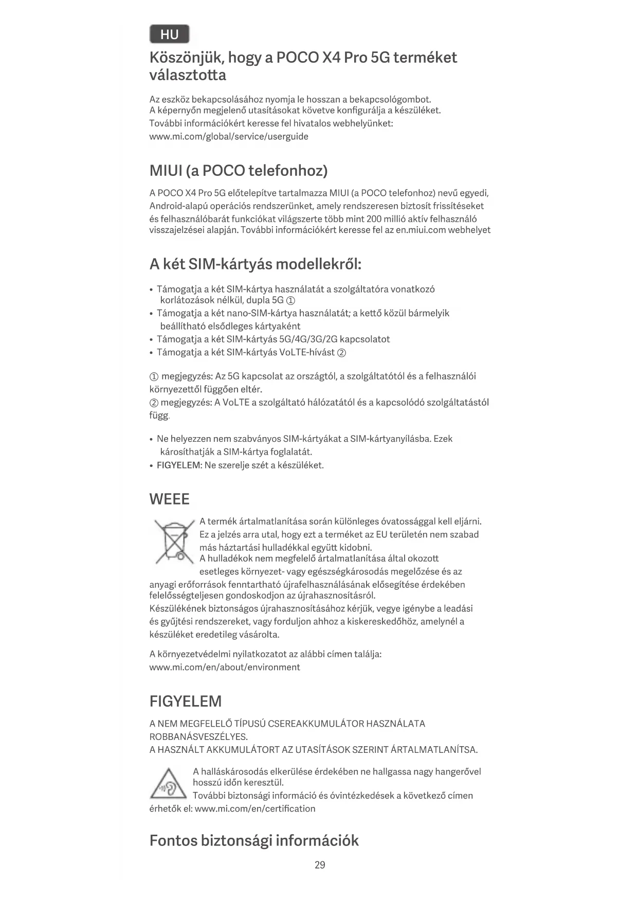 - FIGYELEM: Ne szerelje szét a készüléket. WEEE A termék ártalmatlanítása során különleges óvatossággal kell eljárni. Ez a jelzés arra utal, hogy ezt a terméket az EU területén nem szabad más háztartási hulladékkal együ kidobni. A hulladékok nem megfelelő ártalmatlanítása által okozo esetleges környezet- vagy egészségkárosodás megelőzése és az anyagi erőforrások fenntartható újrafelhasználásának elősegítése érdekében felelősségteljesen gondoskodjon az újrahasznosításról. Készülékének biztonságos újrahasznosításához kérjük, vegye igénybe a leadási és gyűjtési rendszereket, vagy forduljon ahhoz a kiskereskedőhöz, amelynél a készüléket eredetileg vásárolta. A környezetvédelmi nyilatkozatot az alábbi címen találja: www.mi.com/en/about/environment FIGYELEM A NEM MEGFELELŐ TÍPUSÚ CSEREAKKUMULÁTOR HASZNÁLATA ROBBANÁSVESZÉLYES. A HASZNÁLT AKKUMULÁTORT AZ UTASÍTÁSOK SZERINT ÁRTALMATLANÍTSA. A halláskárosodás elkerülése érdekében ne hallgassa nagy hangerővel hosszú időn keresztül. További biztonsági információ és óvintézkedések a következő címen érhetők el: www.mi.com/en/certification Fontos biztonsági információk 29A készülék használata elő olvassa el az alábbi biztonsági információkat: