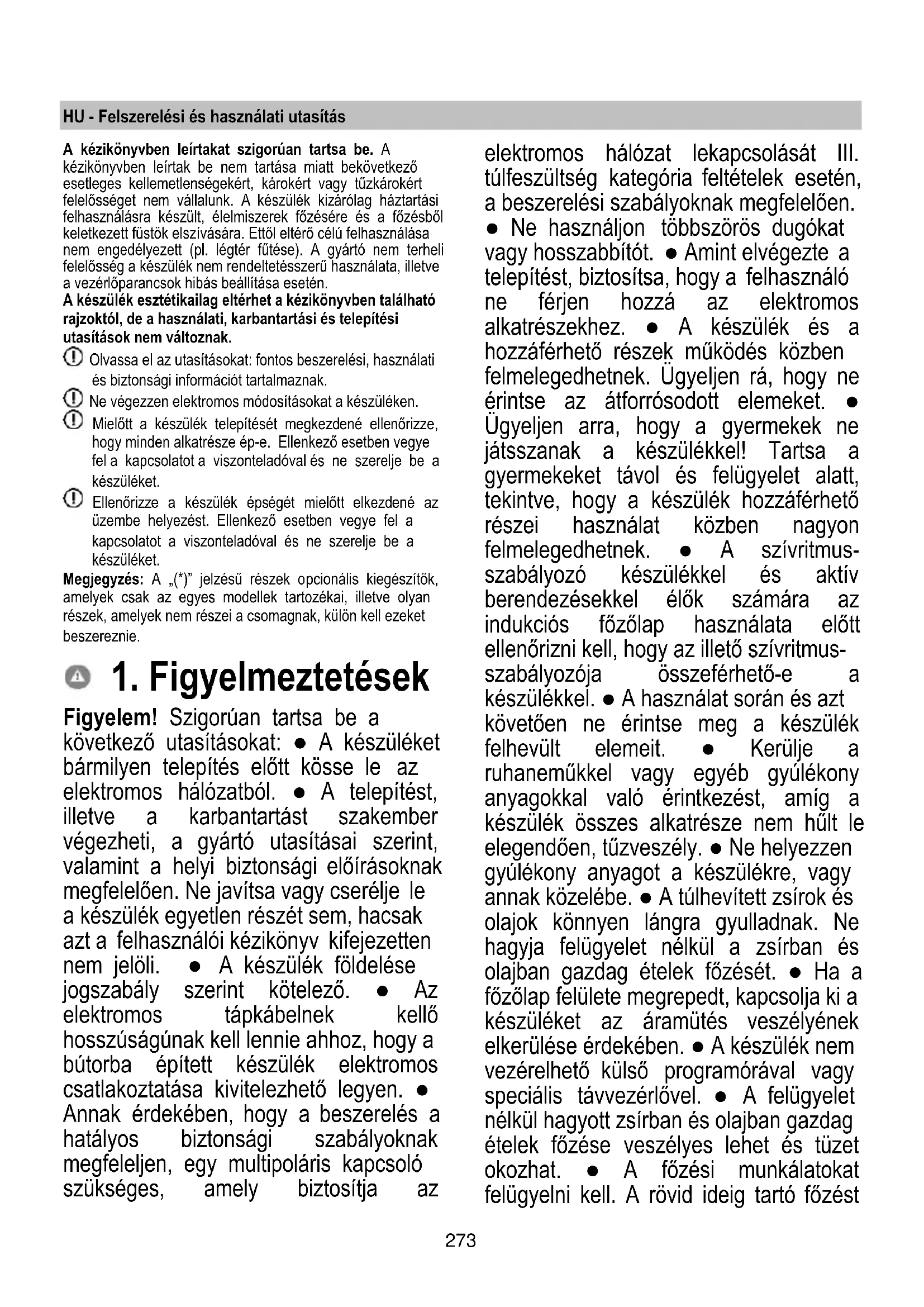 Figyelem! Szigorúan tartsa be a következő utasításokat: ● A készüléket bármilyen telepítés előtt kösse le az elektromos hálózatból. ● A telepítést, illetve a karbantartást szakember végezheti, a gyártó utasításai szerint, valamint a helyi biztonsági előírásoknak megfelelően. Ne javítsa vagy cserélje le a készülék egyetlen részét sem, hacsak azt a felhasználói kézikönyv kifejezetten nem jelöli. ● A készülék földelése jogszabály szerint kötelező. ● Az elektromos tápkábelnek kellő hosszúságúnak kell lennie ahhoz, hogy a bútorba épített készülék elektromos csatlakoztatása kivitelezhető legyen. ● Annak érdekében, hogy a beszerelés a hatályos biztonsági szabályoknak megfeleljen, egy multipoláris kapcsoló szükséges, amely biztosítja az elektromos hálózat lekapcsolását III. túlfeszültség kategória feltételek esetén, a beszerelési szabályoknak megfelelően. ● Ne használjon többszörös dugókat vagy hosszabbítót. ● Amint elvégezte a telepítést, biztosítsa, hogy a felhasználó ne férjen hozzá az elektromos alkatrészekhez. ● A készülék és a hozzáférhető részek működés közben felmelegedhetnek. Ügyeljen rá, hogy ne érintse az átforrósodott elemeket. ● Ügyeljen arra, hogy a gyermekek ne játsszanak a készülékkel! Tartsa a gyermekeket távol és felügyelet alatt, tekintve, hogy a készülék hozzáférhető részei használat közben nagyon felmelegedhetnek. ● A szívritmus- szabályozó készülékkel és aktív berendezésekkel élők számára az indukciós főzőlap használata előtt ellenőrizni kell, hogy az illető szívritmus- szabályozója összeférhető-e a készülékkel. ● A használat során és azt követően ne érintse meg a készülék felhevült elemeit. ● Kerülje a ruhaneműkkel vagy egyéb gyúlékony anyagokkal való érintkezést, amíg a készülék összes alkatrésze nem hűlt le elegendően, tűzveszély. ● Ne helyezzen gyúlékony anyagot a készülékre, vagy annak közelébe. ● A túlhevített zsírok és olajok könnyen lángra gyulladnak. Ne hagyja felügyelet nélkül a zsírban és olajban gazdag ételek főzését. ● Ha a főzőlap felülete megrepedt, kapcsolja ki a készüléket az áramütés veszélyének elkerülése érdekében. ● A készülék nem vezérelhető külső programórával vagy speciális távvezérlővel. ● A felügyelet nélkül hagyott zsírban és olajban gazdag ételek főzése veszélyes lehet és tüzet okozhat. ● A főzési munkálatokat felügyelni kell. A rövid ideig tartó főzést274 folyamatosan felügyelni kell. ● SOHA ne próbálja vízzel eloltani a lángokat. Ellenkezőleg, kapcsolja ki a készüléket és fojtsa el a lángokat, például egy fedővel vagy egy tűzálló pokróccal. Tűzveszély: ne rakodjon a főzőlap felületére. ● Ne használjon gőztisztító gépeket, áramütés veszélye. ● Ne tegyen fém tárgyakat, mint például késeket, villákat, kanalakat és fedőket a főzőlapra, mert azok felforrósodhatnak. ● Mielőtt az elektromos hálózatra kötné a készüléket, ellenőrizze (a készülék alján található) adattáblát, hogy meggyőződjön róla, hogy az azon feltüntetett feszültség és teljesítmény megfelel-e a hálózati és csatlakozóaljzat feszültségének. Amennyiben kétségei lennének, forduljon villanyszerelőhöz. Fontos: ● Használat után a vezérlőszenzorral kapcsolja ki a főzőlapot és ne a lábas érzékelőre hagyatkozzon. ● Kerülje a folyadékok kiömlését. Főzésnél, illetve forralásnál csökkentse a hőfokot. ● Ne hagyja üresen, illetve ne tegyen üres serpenyőt vagy lábast a bekapcsolt melegítő részekre. ● Ha befejezte a főzést, kapcsolja le a vonatkozó főzési területet. ● A főzéshez soha ne használjon alumínium fóliát, és soha ne helyezzen közvetlenül a felületre alumínium fóliába csomagolt termékeket. Az alumínium megolvad és javíthatatlanul tönkreteszi a készüléket. ● Soha ne melegítsen élelmiszert tartalmazó lezárt dobozt vagy konzervet anélkül, hogy felnyitná: felrobbanhat! Ez a figyelmeztetés a többi, más típusú főzőlapra is vonatkozik. ● Az olyan nagy teljesítményű funkciók, mint a booster, nem használható bármilyen típusú folyadék melegítéséhez, mint amilyen például a sütőolaj. A túl magas hőmérséklet veszélyes lehet. Ilyen esetben használjon alacsonyabb teljesítményfokozatot. ● A főzőedényeket közvetlenül a főzőlapra kell helyezni, középre igazítva. Semmilyen esetben se tegyen semmilyen tárgyat a főzőlap és a főzőedény közé. ● Magas hőmérséklet esetén a készülék automatikusan csökkenti a főzőzóna teljesítményfokozatát. ● Bármiféle tisztítási vagy karbantartási művelet előtt válassza le a készüléket az elektromos hálózatról, kihúzva a vezetéket vagy lekapcsolva a lakás főkapcsolóját. ● Minden telepítési vagy karbantartási folyamathoz viseljen munkavédelmi kesztyűt. ● A készüléket 8 évnél nem fiatalabb gyermekek és csökkent fizikai, érzékszervi vagy mentális képességekkel rendelkező, vagy tapasztalatlan, vagy a szükséges ismeretekkel nem rendelkező személyek csak akkor használhatják, ha felügyelet alatt vannak vagy ha megkapták a készülék biztonságos használatával és a benne rejlő veszélyek megértésével kapcsolatos utasításokat. ● Ellenőrizze, hogy a gyerekek ne játszanak a készülékkel. ● A tisztítási és karbantartási műveleteket gyermekek csak felügyelet mellett végezhetik. ● A helyiségben megfelelő szellőztetés legyen, amikor a készüléket más gáz● vagy tüzelőberendezéssel egyidejűleg használja. ● A készüléket gyakran tisztítsa mind belül, mind kívül (LEGALÁBB HAVI EGYSZER), mindenképp tartsa be a karbantartási utasításokban leírtakat. ● A készülék tiszt