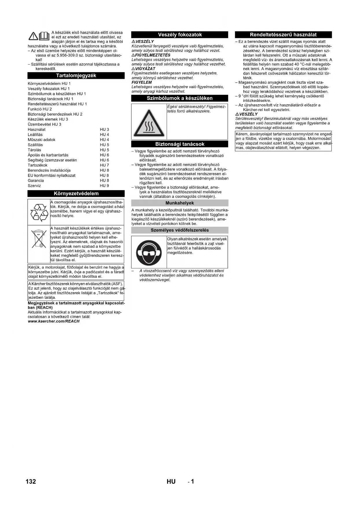 Kontroll lámpák Üzembevétel Használat Biztonsági tanácsok 134 HU- 4 VESZÉLYÉletveszély áramütés által! Ne irányítsa a vízsugarat a következő berendezések felé:– Elektromos készülékek és berendezések,– magára erre a berendezésre, – semmilyen áramvezető alkatrészre a munkaterületen. A sugárcsőből kilépő vízsugár által visszalökőerő kelet-kezik. A hajlított sugárcső miatt ez az erő felfelé hat. VESZÉLY – Sérülésveszély! A sugárcső visszalökő ereje kibil- lentheti Önt egyensúlyából. Ön eleshet. A sugár-cső elrepülhet és személyek sérülését okozhatja. Keressen egy biztos helyet és fogja erősen a szó-rópisztolyt. A kézi szórópisztoly karját soha ne szo-rítsa le.– A vízsugarat nem szabad másokra vagy saját magá-ra irányítani ruházat vagy lábbeli tisztítása céljából. – Sérülésveszély elrepülő tárgyak által! Elrepülő le- tört darabok vagy tárgyak személyek vagy állatok sérülését okozhatják. Ne irányítsa a vízsugarat tö-rékeny vagy szabadon álló tárgyak felé.– Balesetveszély rongálódás következtében! Gumi-abroncsokat és szelepeket minimum 30 cm távol-ságból tisztítsa. VESZÉLYVeszély egészségre ártalmas anyagok által! A követke-ző anyagokat ne permetezze le, mivel egészségre ártal-mas anyagok kavarodhatnak fel:– azbeszt tartalmú anyagok,– Olyan anyagok, amelyek egészségre ártalmas anyagokat tartalmazhatnak. VESZÉLY– Sérülésveszély a kiáramló, esetlegesen forró víz-sugár által! Csak az eredeti Kärcher-magasnyomá-sú tömlők vannak optimálisan beállítva a berende-zéshez. Más tömlők használata esetére nem válla-lunk garanciát.– Egészségi ártalom tisztítószerek által! Az adott esetben hozzákevert tisztítószer miatt a készülék- ből kijövő víznek nincs ivóvíz minősége. – Halláskárosodás veszélye zaj felerősítő alkatré- szeken való munka által! Ebben az esetben visel-jen fülvédőt.몇 FIGYELMEZTETÉSA készülék hosszabb használati ideje esetén a kezek-ben vibráció okozta vérkeringési zavar léphet fel.Általánosan érvényes használati időt nem lehet megha-tározni, mert ez több befolyásoló tényezőtől függ:– Személyes hajlam a rossz vérkeringésre (gyakran hideg ujjak, ujjak bizsergése).– Alacsony környezeti hőmérséklet. Viseljen meleg kesztyűt a kéz védelmére.– Az erős markolás gátolja a vérkeringést.– A folyamatos üzem rosszabb, mint a szünetekkel megszakított üzem.A készülék rendszeres, hosszan tartó használatánál és a megfelelő jelek (például ujjak zsibbadása, hideg ujjak) ismételt előfordulásánál orvosi vizsgálatot ajánlunk. VESZÉLYSérülésveszély a kiáramló, esetlegesen forró vízsugár által! VESZÉLY Ellenőrize a nagynyomású tömlő épségét minden hasz- nálat előtt. A sérült nagynyomású tömlőt azonnal ki kell cserélni. Minden használat előtt ellenőrizze a magasnyomá-sú tömlőt, csővezetékeket, szerelvényeket és a su-gárcsövet, hogy nem rongálódtak-e meg. Ellenőrizze a tömlőkapcsolat biztos elhelyezkedé-sét és vízzáróságát. A kulcsos kapcsolót forgassa a „0“ helyzetbe. Zárja el a víztápláló-vezetéket. Nyomja meg a kézi szórópisztolyt, amíg a készülék nyomás mentes lesz. Nyissa ki a vízvezetéket. A kulcsos kapcsolót forgassa a „1“ helyzetbe. Kioldó gombot megnyomni.Az üzemkész állapot kontroll lámpája világít. Tisztítás elvégzése.Megjegyzés:30 másodpercnél hosszabb tisztítási szü-net esetén a szivattyú leáll. Ezzel egy időben 6 órán át tartó üzemkész állapot idő indul el. Az üzemkész állapot időn belül a készülék automatikusan beindul a kézi szó-rópisztoly kinyitása általi nyomáscsökkenés következ-tében. Kioldó gombot megnyomni.Az üzemkész állapot kontroll lámpája világít. A kulcsos kapcsolót forgassa a „0“ helyzetbe. Zárja el a víztápláló-vezetéket. Nyomja meg a kézi szórópisztolyt, amíg a készülék nyomás mentes lesz. Biztosítsa a kézi szórópisztolyt a biztonsági pecek-kel véletlenszerű kinyitás ellen.Hosszabb üzem szüneteknél vagy ha fagymentes fel-szerelés nem lehetséges, a következő intézkedéseket végezze le (lásd az „Ápolás és karbantartás“ fejezet, „Fagyás elleni védelem“ részét): Víz leeresztése. Öblítse át a készüléket fagyállószerrel Kapcsolja ki és biztosítsa a főkapcsolót.