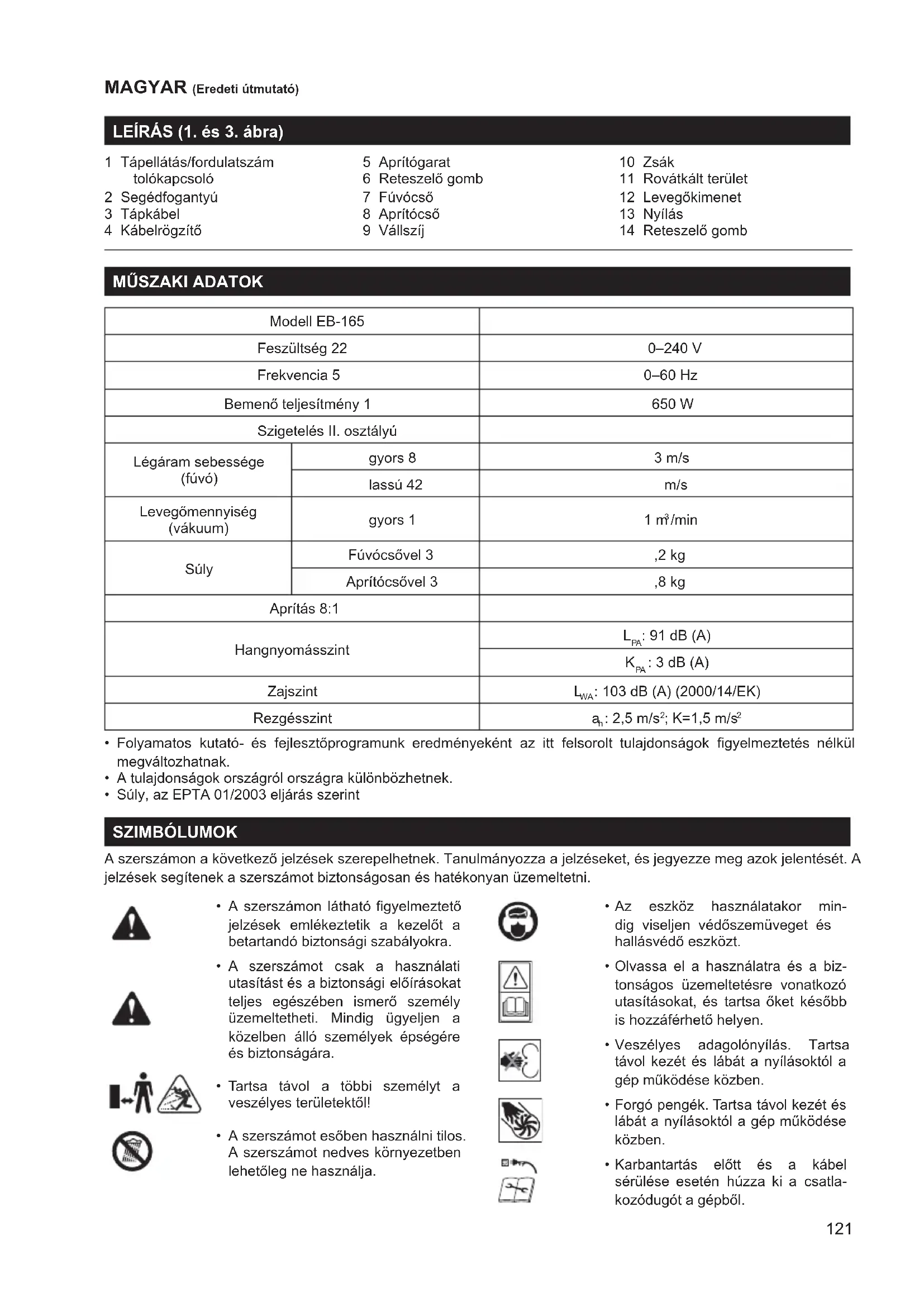 Modell EB-165 Feszültség 22 0–240 V Frekvencia 5 0–60 Hz Bemenő teljesítmény 1 650 W Szigetelés II. osztályú Légáram sebessége (fúvó) gyors 8 3 m/s lassú 42 m/s Levegőmennyiség (vákuum) gyors 1 1 m