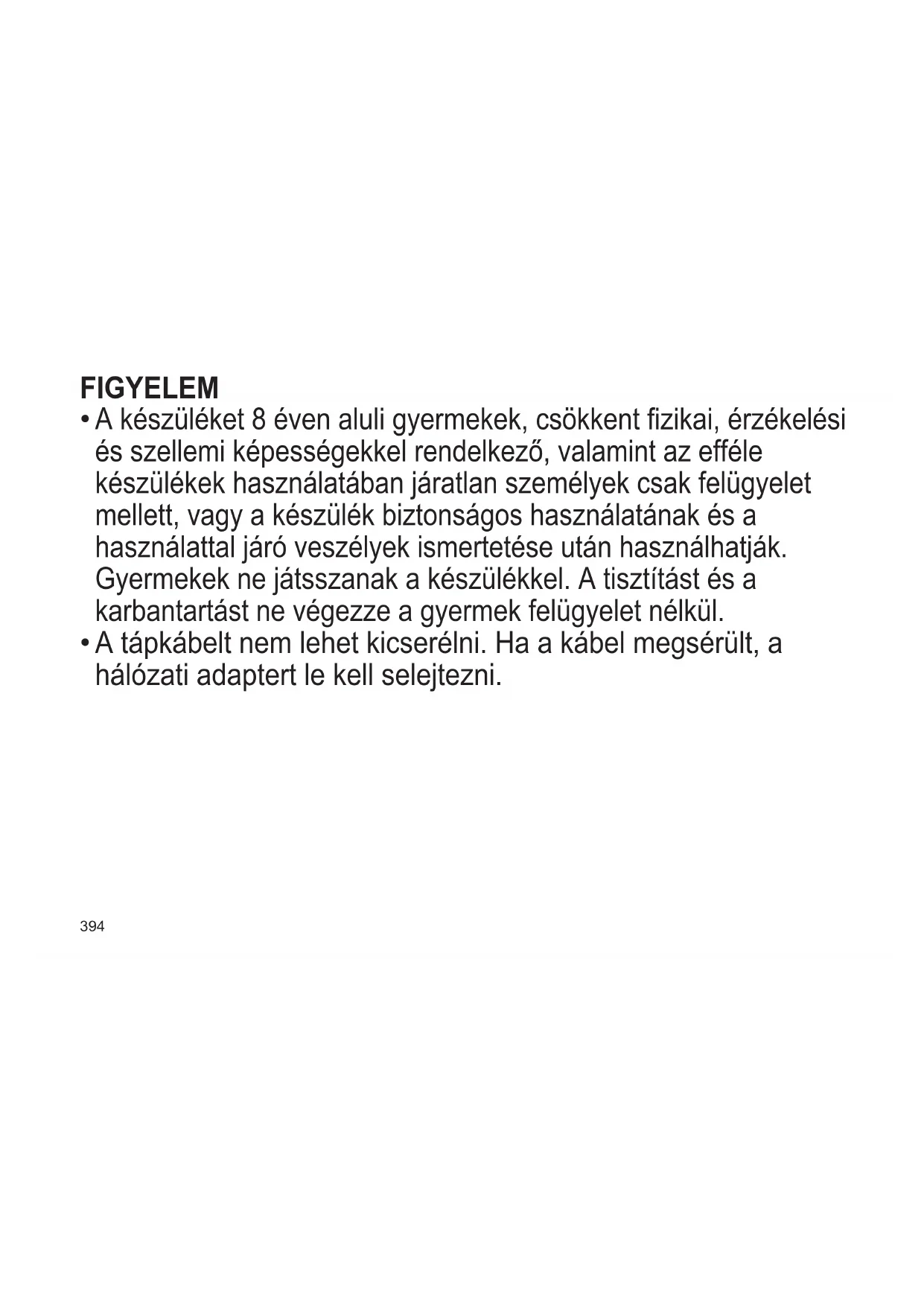 A készüléket 8 éven aluli gyermekek, csökkent zikai, érzékelési és szellemi képességekkel rendelkező, valamint az efféle készülékek használatában járatlan személyek csak felügyelet mellett, vagy a készülék biztonságos használatának és a használattal járó veszélyek ismertetése után használhatják. Gyermekek ne játsszanak a készülékkel. A tisztítást és a karbantartást ne végezze a gyermek felügyelet nélkül.
