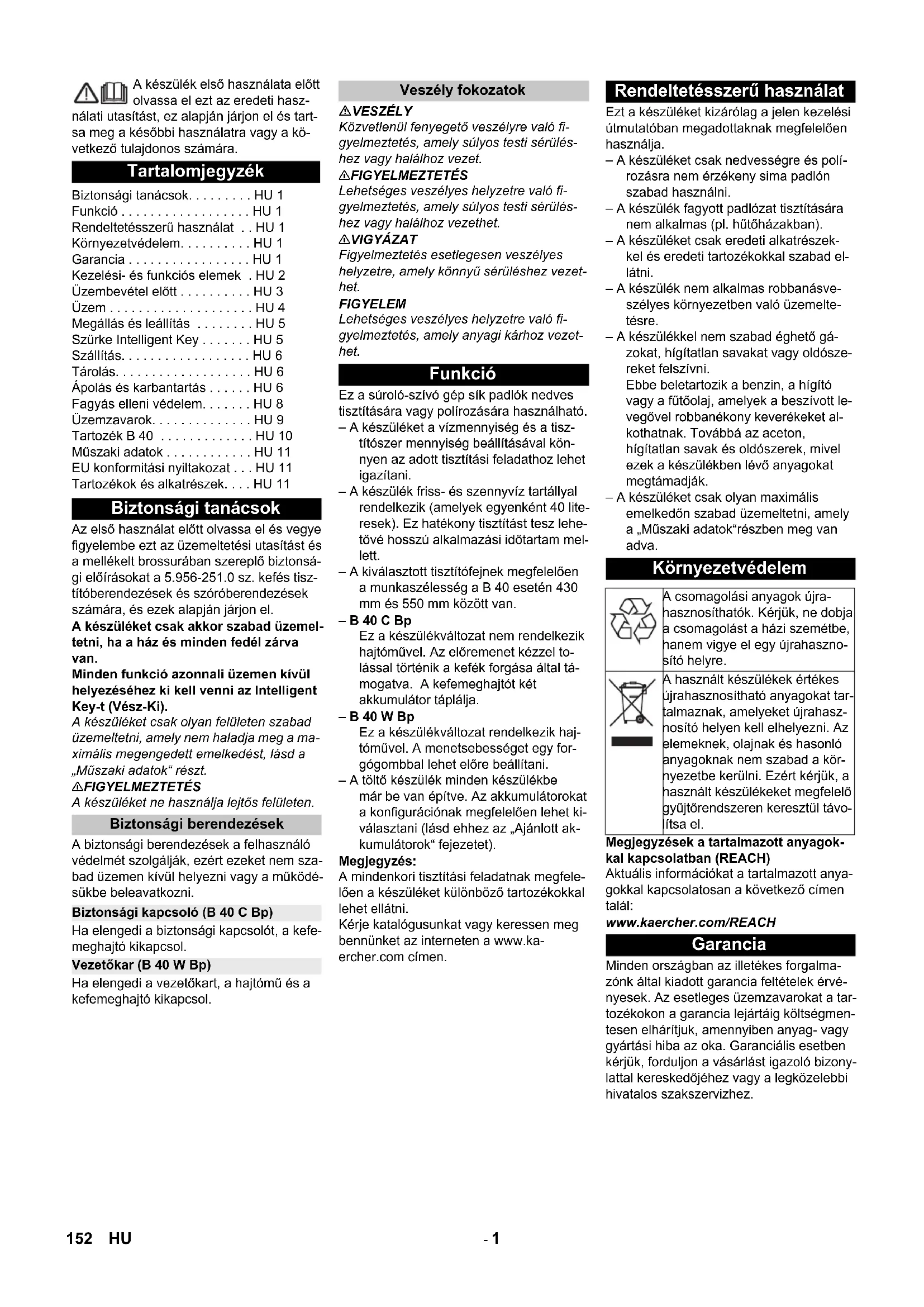 Chairman of the Board of Management Director Regulatory Affairs & Certification Принадлежности и запасные детали 151RU- 1 A készülék első használata előtt olvassa el ezt az eredeti hasz- nálati utasítást, ez alapján járjon el és tart- sa meg a későbbi használatra vagy a kö- vetkező tulajdonos számára. Az első használat előtt olvassa el és vegye figyelembe ezt az üzemeltetési utasítást és a mellékelt brossurában szereplő biztonsá- gi előírásokat a 5.956-251.0 sz. kefés tisz- títóberendezések és szóróberendezések számára, és ezek alapján járjon el. A készüléket csak akkor szabad üzemel- tetni, ha a ház és minden fedél zárva van. Minden funkció azonnali üzemen kívül helyezéséhez ki kell venni az Intelligent Key-t (Vész-Ki). A készüléket csak olyan felületen szabad üzemeltetni, amely nem haladja meg a ma- ximális megengedett emelkedést, lásd a „Műszaki adatok“ részt. 몇 FIGYELMEZTETÉS A készüléket ne használja lejtős felületen. A biztonsági berendezések a felhasználó védelmét szolgálják, ezért ezeket nem sza- bad üzemen kívül helyezni vagy a működé- sükbe beleavatkozni. Ha elengedi a biztonsági kapcsolót, a kefe- meghajtó kikapcsol. Ha elengedi a vezetőkart, a hajtómű és a kefemeghajtó kikapcsol. VESZÉLY Közvetlenül fenyegető veszélyre való fi- gyelmeztetés, amely súlyos testi sérülés- hez vagy halálhoz vezet. 몇 FIGYELMEZTETÉS Lehetséges veszélyes helyzetre való fi- gyelmeztetés, amely súlyos testi sérülés- hez vagy halálhoz vezethet. 몇 VIGYÁZAT Figyelmeztetés esetlegesen veszélyes helyzetre, amely könnyű sérüléshez vezet- het. FIGYELEM Lehetséges veszélyes helyzetre való fi- gyelmeztetés, amely anyagi kárhoz vezet- het. Ez a súroló-szívó gép sík padlók nedves tisztítására vagy polírozására használható. – A készüléket a vízmennyiség és a tisz- títószer mennyiség beállításával kön- nyen az adott tisztítási feladathoz lehet igazítani. – A készülék friss- és szennyvíz tartállyal rendelkezik (amelyek egyenként 40 lite- resek). Ez hatékony tisztítást tesz lehe- tővé hosszú alkalmazási időtartam mel- lett. – A kiválasztott tisztítófejnek megfelelően a munkaszélesség a B 40 esetén 430 mm és 550 mm között van. – B 40 C Bp Ez a készülékváltozat nem rendelkezik hajtóművel. Az előremenet kézzel to- lással történik a kefék forgása által tá- mogatva. A kefemeghajtót két akkumulátor táplálja. – B 40 W Bp Ez a készülékváltozat rendelkezik haj- tóművel. A menetsebességet egy for- gógombbal lehet előre beállítani. – A töltő készülék minden készülékbe már be van építve. Az akkumulátorokat a konfigurációnak megfelelően lehet ki- választani (lásd ehhez az „Ajánlott ak- kumulátorok“ fejezetet). Megjegyzés: A mindenkori tisztítási feladatnak megfele- lően a készüléket különböző tartozékokkal lehet ellátni. Kérje katalógusunkat vagy keressen meg bennünket az interneten a www.ka- ercher.com címen. Ezt a készüléket kizárólag a jelen kezelési útmutatóban megadottaknak megfelelően használja. – A készüléket csak nedvességre és polí- rozásra nem érzékeny sima padlón szabad használni. – A készülék fagyott padlózat tisztítására nem alkalmas (pl. hűtőházakban). – A készüléket csak eredeti alkatrészek- kel és eredeti tartozékokkal szabad el- látni. – A készülék nem alkalmas robbanásve- szélyes környezetben való üzemelte- tésre. – A készülékkel nem szabad éghető gá- zokat, hígítatlan savakat vagy oldósze- reket felszívni. Ebbe beletartozik a benzin, a hígító vagy a fűtőolaj, amelyek a beszívott le- vegővel robbanékony keverékeket al- kothatnak. Továbbá az aceton, hígítatlan savak és oldószerek, mivel ezek a készülékben lévő anyagokat megtámadják. – A készüléket csak olyan maximális emelkedőn szabad üzemeltetni, amely a „Műszaki adatok“részben meg van adva. Megjegyzések a tartalmazott anyagok- kal kapcsolatban (REACH) Aktuális információkat a tartalmazott anya- gokkal kapcsolatosan a következő címen talál: www.kaercher.com/REACH Minden országban az illetékes forgalma- zónk által kiadott garancia feltételek érvé- nyesek. Az esetleges üzemzavarokat a tar- tozékokon a garancia lejártáig költségmen- tesen elhárítjuk, amennyiben anyag- vagy gyártási hiba az oka. Garanciális esetben kérjük, forduljon a vásárlást igazoló bizony- lattal kereskedőjéhez vagy a legközelebbi hivatalos szakszervizhez. Tartalomjegyzék Biztonsági tanácsok. . . . . . . . . HU 1 Funkció . . . . . . . . . . . . . . . . . . HU 1 Rendeltetésszerű használat . . HU 1 Környezetvédelem. . . . . . . . . . HU 1 Garancia . . . . . . . . . . . . . . . . . HU 1 Kezelési- és funkciós elemek . HU 2 Üzembevétel előtt . . . . . . . . . . HU 3 Üzem . . . . . . . . . . . . . . . . . . . . HU 4 Megállás és leállítás . . . . . . . . HU 5 Szürke Intelligent Key . . . . . . . HU 5 Szállítás. . . . . . . . . . . . . . . . . . HU 6 Tárolás. . . . . . . . . . . . . . . . . . . HU 6 Ápolás és karbantartás . . . . . . HU 6 Fagyás elleni védelem. . . . . . . HU 8 Üzemzavarok. . . . . . . . . . . . . . HU 9 Tartozék B 40 . . . . . . . . . . . . . HU 10 Műszaki adatok . . . . . . . . . . . . HU 11 EU konformitási nyiltakozat . . . HU 11 Tartozékok és alkatrészek. . . . HU 11 Biztonsági tanácsok Biztonsági berendezések Biztonsági kapcsoló (B 40 C Bp) Vezetőkar (B 40 W Bp) Veszély fokozatok Funkció Rendeltetésszerű használat Környezetvédelem A csomagolási anyagok újra- hasznosíthatók. Kérjük, ne dobja a csomagolást a házi szemétbe, hanem vigye el egy újrahaszno- sító helyre. A használt készülékek értékes újrahasznosítható anyagokat tar- talmaznak, amelyeket újrahasz- n
