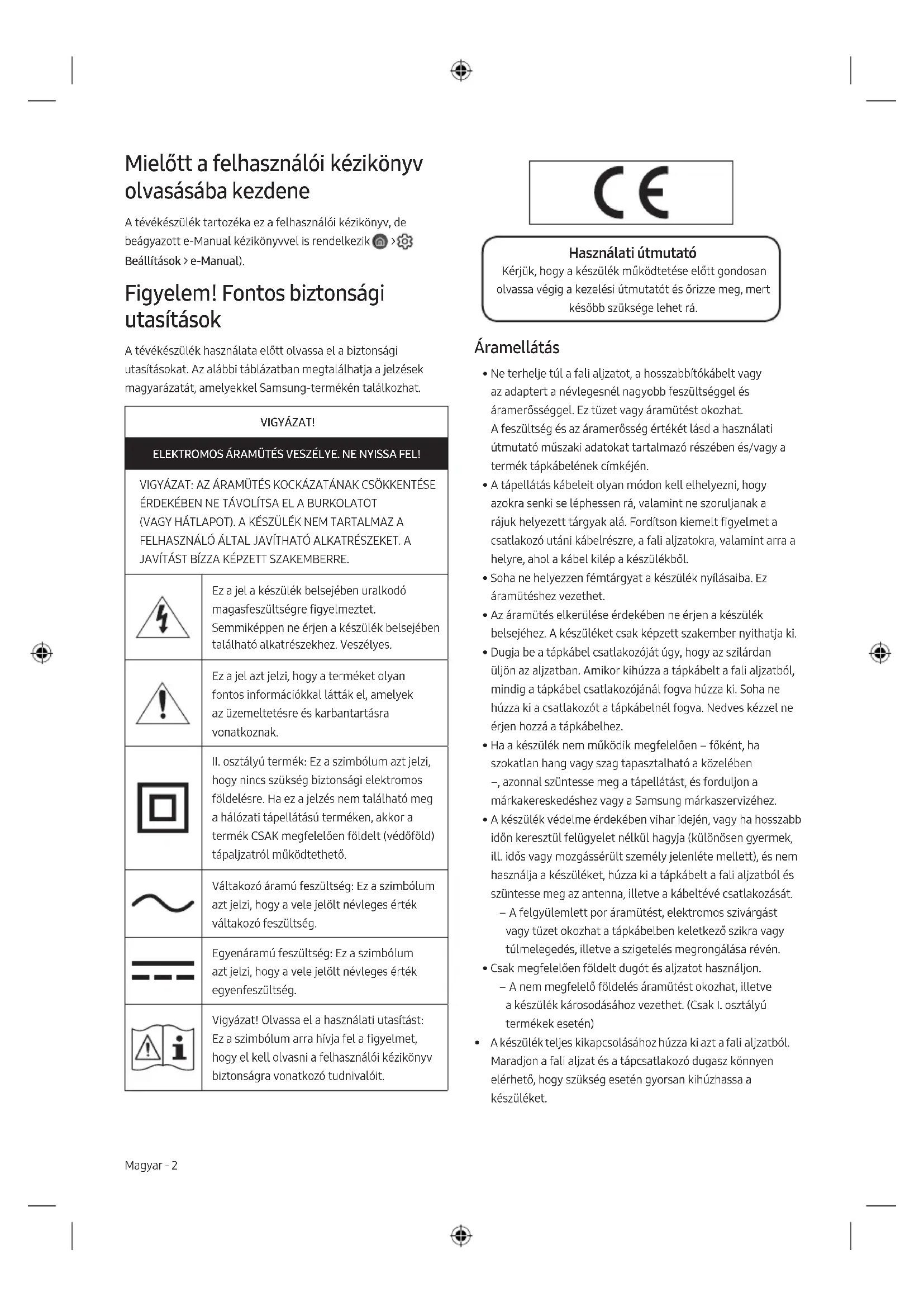 Beállítások > e-Manual). Figyelem! Fontos biztonsági utasítások A tévékészülék használata előtt olvassa el a biztonsági utasításokat. Az alábbi táblázatban megtalálhatja a jelzések magyarázatát, amelyekkel Samsung-termékén találkozhat. VIGYÁZAT! ELEKTROMOS ÁRAMÜTÉS VESZÉLYE. NE NYISSA FEL! VIGYÁZAT: AZ ÁRAMÜTÉS KOCKÁZATÁNAK CSÖKKENTÉSE ÉRDEKÉBEN NE TÁVOLÍTSA EL A BURKOLATOT (VAGY HÁTLAPOT). A KÉSZÜLÉK NEM TARTALMAZ A FELHASZNÁLÓ ÁLTAL JAVÍTHATÓ ALKATRÉSZEKET. A JAVÍTÁST BÍZZA KÉPZETT SZAKEMBERRE. Ez a jel a készülék belsejében uralkodó magasfeszültségre figyelmeztet. Semmiképpen ne érjen a készülék belsejében található alkatrészekhez. Veszélyes. Ez a jel azt jelzi, hogy a terméket olyan fontos információkkal látták el, amelyek az üzemeltetésre és karbantartásra vonatkoznak.