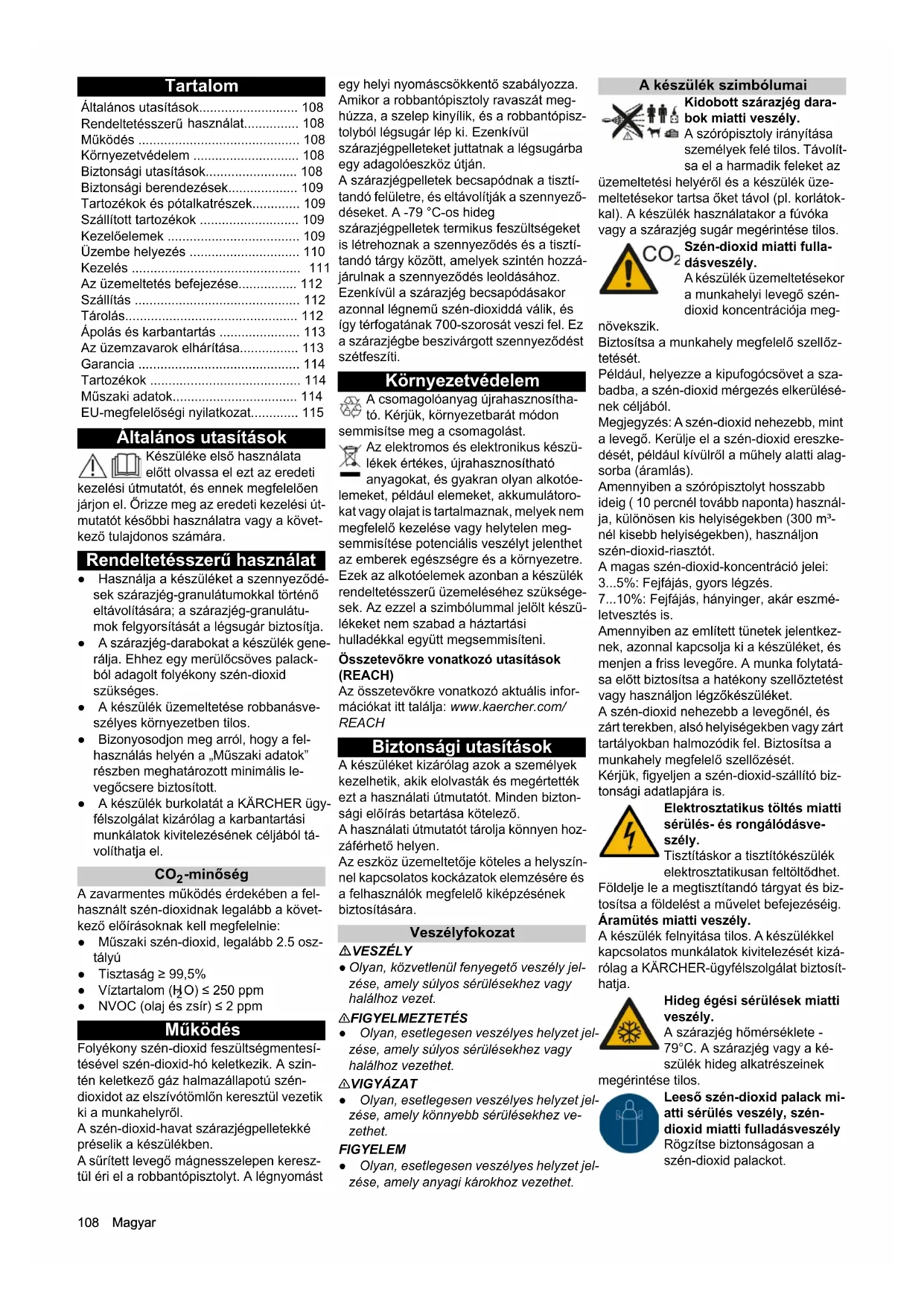 LWA Погрешность KWA dB(A) 115 IB 10/ 8 L2P108 Magyar Tartalom Általános utasítások Készüléke első használata előtt olvassa el ezt az eredeti kezelési útmutatót, és ennek megfelelően járjon el. Őrizze meg az eredeti kezelési út- mutatót későbbi használatra vagy a követ- kező tulajdonos számára. Rendeltetésszerű használat ● Használja a készüléket a szennyeződé- sek szárazjég-granulátumokkal történő eltávolítására; a szárazjég-granulátu- mok felgyorsítását a légsugár biztosítja. ● A szárazjég-darabokat a készülék gene- rálja. Ehhez egy merülőcsöves palack- ból adagolt folyékony szén-dioxid szükséges. ● A készülék üzemeltetése robbanásve- szélyes környezetben tilos. ● Bizonyosodjon meg arról, hogy a fel- használás helyén a „Műszaki adatok” részben meghatározott minimális le- vegőcsere biztosított. ● A készülék burkolatát a KÄRCHER ügy- félszolgálat kizárólag a karbantartási munkálatok kivitelezésének céljából tá- volíthatja el.