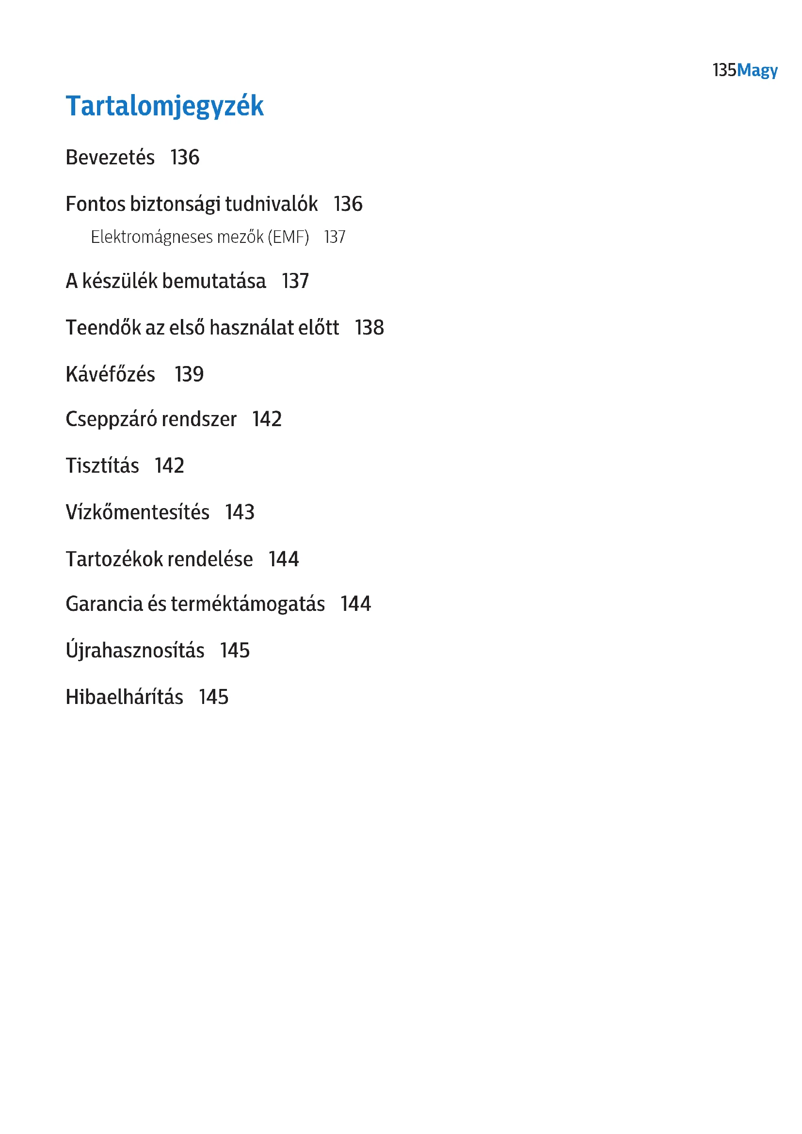 - Ako vrč uklonite iz uređaja na dulje od 20 sekundi tijekom kuhanja, ltar će se početi prelijevati. 134 HrvatskiTartalomjegyzék Bevezetés 136 Fontos biztonsági tudnivalók 136 Elektromágneses mezők (EMF) 137 A készülék bemutatása 137 Teendők az első használat előtt 138 Kávéfőzés 139 Cseppzáró rendszer 142 Tisztítás 142 Vízkőmentesítés 143 Tartozékok rendelése 144 Garancia és terméktámogatás 144 Újrahasznosítás 145 Hibaelhárítás 145 135MagyarBevezetés Köszönjük, hogy Philips terméket vásárolt, és üdvözöljük a Philips világában! A Philips által biztosított támogatás teljes körű igénybevételéhez regisztrálja a terméket a www.philips.com/welcome oldalon. Fontos biztonsági tudnivalók A készülék használata előtt gyelmesen olvassa el a fontos tudnivalókat, és őrizze meg későbbi használatra. Veszély! - Ne merítse a készüléket vízbe vagy más folyadékba. Vigyázat! - A készülék csatlakoztatása előtt ellenőrizze, hogy a rajta feltüntetett feszültség egyezik-e a helyi hálózatéval. - A készüléket földelt fali csatlakozóaljzathoz kell csatlakoztatni. - Ne használja a készüléket, ha sérült a hálózati csatlakozódugó, a kábel vagy a készülék. - Ha sérült a hálózati kábel, a kockázatok elkerülése érdekében Philips-szakszervizben vagy hivatalos szakszervizben cseréltesse ki. - A készüléket 8 éven felüli gyermekek, csökkent zikai, érzékelési vagy szellemi képességekkel rendelkező, illetve a készülék működtetésében járatlan személyek is használhatják, amennyiben ezt felügyelet mellett teszik, illetve ismerik a készülék biztonságos működtetésének módját és a működtetés kockázatait. A tisztítást és a felhasználó által is végezhető karbantartást ne végezze 8 éven aluli gyermek; 8 éven felüli gyermek is csak felügyelet mellett végezheti el ezeket. Tartsa a készüléket és annak vezetékét 8 éven aluli gyermekek elől elzárva. - Ne engedje, hogy gyermekek játsszanak a készülékkel. - Ügyeljen arra, hogy a hálózati kábel ne lógjon le az asztalról vagy a munkalapról, amelyiken a készülék áll. - A készüléket az esetleges sérülések és egyéb veszélyek elkerülése érdekében kizárólag a rendeltetésének megfelelő célra használja. Figyelem! - A készüléket az első használat előtt tiszta vízzel öblítse át. - Ne helyezze a kávéfőzőt forró felületre, és ügyeljen arra, hogy a hálózati kábel se érintkezzen forró felülettel. - Használatkor a készüléket ne tegye szekrénybe! - Tisztítás előtt, vagy ha a kávéfőzés közben problémák adódnának, húzza ki a készülék hálózati csatlakozóját a fali csatlakozóaljzatból. - A kávéfőzés ideje alatt, és amíg ki nem kapcsolja a készüléket, a ltertartó, a készülék alsó része, a melegen tartó lap és a kávéval teli kanna forró. - A kávé újramelegítéséhez ne tegye a kannát tűzhelyre vagy mikrosütőbe. - A készüléket háztartásban és más helyeken, például gazdasági épületekben, panziókban, üzletekben, irodákban, illetve más munkahelyeken való alkalmazásra, valamint szállodai vendégek, motelekben és más szálláshelyeken lakók általi használatra tervezték. - A készüléket kizárólag Philips hivatalos szakszervizbe vigye ellenőrzésre és javításra. Ne nyissa fel a készülék burkolatát, és ne kísérelje meg önállóan megjavítani a készüléket. 136 MagyarElektromágneses mezők (EMF) Ez a Philips készülék az elektromágneses terekre vonatkozó összes szabványnak és előírásnak megfelel. A készülék bemutatása 1 Szűrő 2 Szűrőház 3 Kanna fedele 4 Üvegkanna 5 Melegen tartó lap 6 Bekapcsológomb 7 Víztartály 8 Szűrő fedele 9 Víztartály fedele