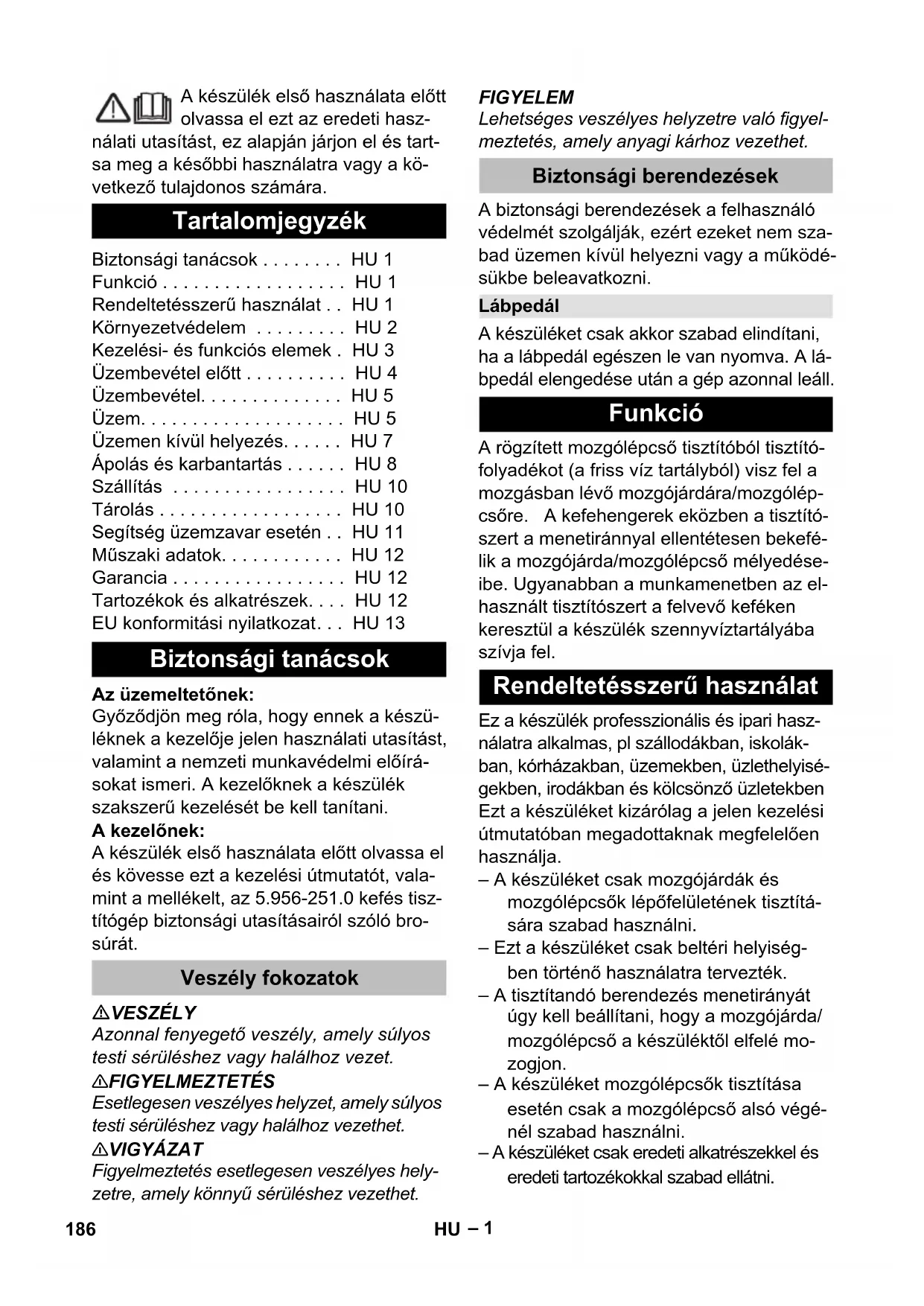 Chairman of the Board of Management Director Regulatory Affairs & Certification 185RU– 1 A készülék első használata előtt olvassa el ezt az eredeti hasz- nálati utasítást, ez alapján járjon el és tart- sa meg a későbbi használatra vagy a kö- vetkező tulajdonos számára. Az üzemeltetőnek: Győződjön meg róla, hogy ennek a készü- léknek a kezelője jelen használati utasítást, valamint a nemzeti munkavédelmi előírá- sokat ismeri. A kezelőknek a készülék szakszerű kezelését be kell tanítani. A kezelőnek: A készülék első használata előtt olvassa el és kövesse ezt a kezelési útmutatót, vala- mint a mellékelt, az 5.956-251.0 kefés tisz- títógép biztonsági utasításairól szóló bro- súrát. VESZÉLY Azonnal fenyegető veszély, amely súlyos testi sérüléshez vagy halálhoz vezet. 몇 FIGYELMEZTETÉS Esetlegesen veszélyes helyzet, amely súlyos testi sérüléshez vagy halálhoz vezethet. 몇 VIGYÁZAT Figyelmeztetés esetlegesen veszélyes hely- zetre, amely könnyű sérüléshez vezethet. FIGYELEM Lehetséges veszélyes helyzetre való figyel- meztetés, amely anyagi kárhoz vezethet. A biztonsági berendezések a felhasználó védelmét szolgálják, ezért ezeket nem sza- bad üzemen kívül helyezni vagy a működé- sükbe beleavatkozni. A készüléket csak akkor szabad elindítani, ha a lábpedál egészen le van nyomva. A lá- bpedál elengedése után a gép azonnal leáll. A rögzített mozgólépcső tisztítóból tisztító- folyadékot (a friss víz tartályból) visz fel a mozgásban lévő mozgójárdára/mozgólép- csőre. A kefehengerek eközben a tisztító- szert a menetiránnyal ellentétesen bekefé- lik a mozgójárda/mozgólépcső mélyedése- ibe. Ugyanabban a munkamenetben az el- használt tisztítószert a felvevő keféken keresztül a készülék szennyvíztartályába szívja fel. Ez a készülék professzionális és ipari hasz- nálatra alkalmas, pl szállodákban, iskolák- ban, kórházakban, üzemekben, üzlethelyisé- gekben, irodákban és kölcsönző üzletekben Ezt a készüléket kizárólag a jelen kezelési útmutatóban megadottaknak megfelelően használja. – A készüléket csak mozgójárdák és mozgólépcsők lépőfelületének tisztítá- sára szabad használni. – Ezt a készüléket csak beltéri helyiség- ben történő használatra tervezték. – A tisztítandó berendezés menetirányát úgy kell beállítani, hogy a mozgójárda/ mozgólépcső a készüléktől elfelé mo- zogjon. – A készüléket mozgólépcsők tisztítása esetén csak a mozgólépcső alsó végé- nél szabad használni. – A készüléket csak eredeti alkatrészekkel és eredeti tartozékokkal szabad ellátni. Tartalomjegyzék Biztonsági tanácsok . . . . . . . . HU 1 Funkció . . . . . . . . . . . . . . . . . . HU 1 Rendeltetésszerű használat . . HU 1 Környezetvédelem . . . . . . . . . HU 2 Kezelési- és funkciós elemek . HU 3 Üzembevétel előtt . . . . . . . . . . HU 4 Üzembevétel. . . . . . . . . . . . . . HU 5 Üzem. . . . . . . . . . . . . . . . . . . . HU 5 Üzemen kívül helyezés. . . . . . HU 7 Ápolás és karbantartás . . . . . . HU 8 Szállítás . . . . . . . . . . . . . . . . . HU 10 Tárolás . . . . . . . . . . . . . . . . . . HU 10 Segítség üzemzavar esetén . . HU 11 Műszaki adatok. . . . . . . . . . . . HU 12 Garancia . . . . . . . . . . . . . . . . . HU 12 Tartozékok és alkatrészek. . . . HU 12 EU konformitási nyilatkozat. . . HU 13 Biztonsági tanácsok Veszély fokozatok Biztonsági berendezések Lábpedál Funkció Rendeltetésszerű használat 186 HU– 2 Megjegyzések a tartalmazott anyagok- kal kapcsolatban (REACH) Aktuális információkat a tartalmazott anya- gokkal kapcsolatosan a következő címen talál: www.kaercher.com/REACH Környezetvédelem A csomagolási anyagok újra- hasznosíthatók. Kérjük, ne dob- ja a csomagolást a házi szemét- be, hanem vigye el egy újra- hasznosító helyre. A használt készülékek értékes újrahasznosítható anyagokat tartalmaznak, amelyeket újra- hasznosító helyen kell elhelyez- ni. Az elemeknek, olajnak és ha- sonló anyagoknak nem szabad a környezetbe kerülni. Ezért kér- jük, a használt készülékeket megfelelő gyűjtőrendszeren ke- resztül távolítsa el. 187HU– 3 1 Tolókengyel 2 Friss víz leeresztő tömlő 3 Szennyvíz leeresztő tömlő 4 Hálózati dugó 5 Feszülésmentesítő kampó 6 Lábpedál 7 Hátsó kerekek rögzítő karral 8 Szennyvíztartály fedele 9 Első kerekek 10 Szennyvíz tartály 11 Tisztavíz tartály betöltő nyílása 12 Pedál a kefefej leengedéséhez/feleme- léséhez 13 Kar a kefefej rögzítéséhez 1 Üzemóra számláló 2 Szivattyúnyomás kijelzése 3 Készülékkapcsoló 4 Kontroll lámpa „Szennyvíz tartály tele“ 5 Kontroll lámpa „kefemotor túlterhelés“ Kezelési- és funkciós elemek Kezelőpult 188 HU– 4 A csomagolást a fa palettáig eltávolíta- ni. Helyezze be a tolókengyelt a mélyedé- sekbe a készüléken. Rögzítse a tolókengyelt a mellékelt 4 csavarral. Rögzítése a fedősapkákat. Akassza be a feszülésmentesítő kam- pót a tolókengyelen. Húzza meg a hátsó kerekeket, távolítsa el a hátsó kerekek rögzítéséhez hasz- nált fa támasztékokat. A paletta négy megjelölt padlódeszkája csavarral van rögzítve. Csavarja le eze- ket a deszkákat. Fektesse a deszkákat a paletta pere- mére. Állítsa be úgy a deszkákat, hogy ezek a készülék kerekei előtt legyenek. Rögzítse a deszkákat a csavarokkal. A készüléket lassan tolja le a rámpáról. Megjegyzés: A gyártás során a készüléket fagyálló folya- dékkal öblítették ki. Az első üzembe helye- zés előtt a fagyálló folyadékot el kell távolí- tani. Töltsön 10 liter friss vizet a tisztavíz tar- tályba. Lépjen rá a lábpedálra. A készülékkapcsolót állítsa alap tisztí- tásra. A készüléket add