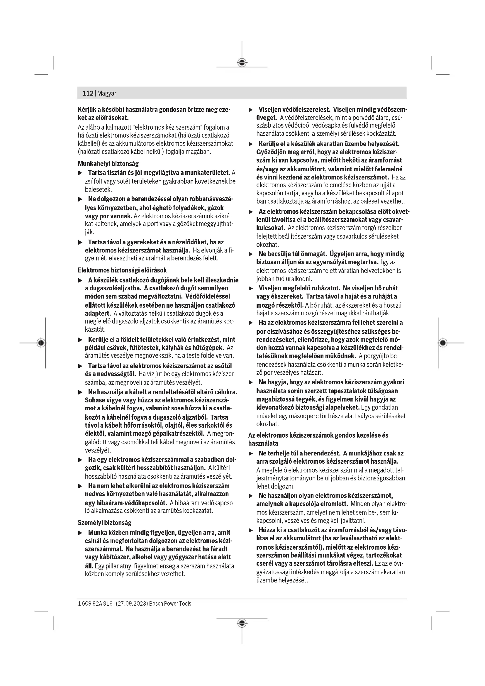 Nastavte nastavovacie koliesko predvoľby krútiaceho momentu(3) na požadovaný krútiaci moment. Pre maximálny krútiaci moment nastavte nastavovacie koliesko pred- voľby prevádzkového režimu(4) na symbol „vŕ- tanie/skrutkovanie MAX“. Skrutkovanie avŕtanie Pri skrutkovaní veľkých skrutiek apri vŕtaní na- stavte nastavovacie koliesko predvoľby pre- vádzkového režimu(4) na symbol „vŕtanie/ skrutkovanie MAX“. Vŕtanie spríklepom Na vŕtanie spríklepom do muriva nastavte na- stavovacie koliesko predvoľby prevádzkového režimu(4) na symbol „vŕtanie spríklepom“. 1 609 92A 916 | (27.09.2023) Bosch Power ToolsMagyar | 111 Plnoautomatická aretácia vretena (Auto-Lock) Pri nestlačenom vypínači (10) sa vŕtacie vreteno, atým aj upínanie nástroja (1) zaaretuje. To umožňuje zaskrutkovávanie skrutiek aj vtedy, keď je aku- mulátor (7) vybitý, alebo používanie tohto elektrického nára- dia ako klasického skrutkovača. Tepelne závislá poistka proti preťaženiu Pri používaní vsúlade surčením nemôže dôjsť kpreťaženiu náradia. Pri príliš veľkom zaťažení alebo prekročení prípust- nej teploty akumulátora elektronika vypne elektrické nára- die, kým nebude opäť vrozmedzí optimálnej prevádzkovej teploty. Upozornenia týkajúce sa práce u Na skrutku/maticu prikladajte ručné elektrické nára- die iba vo vypnutom stave. Otáčajúce sa pracovné ná- stroje by sa mohli zošmyknúť. Po dlhšej práci snízkymi otáčkami by ste mali elektrické náradie kvôli ochladeniu nechať cca 3minúty bežať napráz- dno smaximálnymi otáčkami. Údržba aservis Údržba ačistenie u Pred všetkými prácami na elektrickom náradí (naprí- klad údržba, výmena nástroja apodobne), ako aj pri jeho preprave auskladnení vyberte akumulátor zelektrického náradia. Vprípade neúmyselného aktivo- vania vypínača hrozí nebezpečenstvo poranenia. u Elektrické náradie ajeho vetracie štrbiny udržiavajte vždy včistote, aby ste mohli pracovať dobre abezpeč- ne. Zákaznícka služba aporadenstvo ohľadom použitia Servisné stredisko Vám odpovie na otázky týkajúce sa opravy aúdržby Vášho produktu ako aj náhradných dielov. Rozkladové výkresy ainformácie onáhradných dieloch náj- dete tiež na: www.bosch-pt.com Vprípade otázok týkajúcich sa našich výrobkov apríslušen- stva Vám ochotne pomôže poradenský tím Bosch. Vprípade akýchkoľvek otázok aobjednávok náhradných dielov uvádzajte bezpodmienečne 10‑miestne vecné číslo uvedené na typovom štítku výrobku. Slovakia Na www.bosch-pt.sk si môžete objednať opravu vášho stroja alebo náhradné diely online. Tel.: +421 2 48 703 800 Fax: +421 2 48 703 801 E-Mail: servis.naradia@sk.bosch.com www.bosch-pt.sk Ďalšie adresy servisov nájdete na: www.bosch-pt.com/serviceaddresses Transport Odporúčané lítiovo-iónové akumulátory podliehajú požiadavkám na transport nebezpečného nákladu. Tieto aku- mulátory smie používateľ náradia prepravovať po cestách bez ďalších opatrení. Pri zasielaní tretími osobami (napr.: leteckou dopravou alebo prostredníctvom špedície) treba rešpektovať osobitné požiadavky na obaly aoznačenie. Vtakomto prípade treba pri príprave zásielky bezpodmienečne konzultovať sodborní- kom na prepravu nebezpečného tovaru. Akumulátory zasielajte iba vtedy, ak nemajú poškodený obal. Otvorené kontakty prelepte aakumulátor zabaľte tak, aby sa vobale nemohol posúvať. Rešpektujte aj prípadné doplňujú- ce národné predpisy. Likvidácia Ručné elektrické náradie, príslušenstvo aobal treba dať na recykláciu zodpovedajúcu ochrane životného prostredia. Neodhadzujte ručné elektrické náradie ani aku- mulátory/batérie do komunálneho odpadu! Len pre krajinyEÚ: Podľa európskej smernice 2012/19/EÚ oodpade zelektrických aelektronických zariadení apodľa jej trans- pozície vnárodnom práve sa musí už nepoužiteľné elektrické náradie a, podľa európskej smernice 2006/66/ES, po- škodené alebo vybité akumulátory/batérie zbierať separova- ne aodovzdať na recykláciu vsúlade sochranou životného prostredia. Pri nesprávnej likvidácii môžu mať staré elektrické aelektro- nické zariadenia kvôli možnej prítomnosti nebezpečných látok škodlivý vplyv na životné prostredie aľudské zdravie. Akumulátory/batérie: Li-Ion: Dodržujte pokyny uvedené včasti Transport (pozri „Trans- port“, Stránka111). Magyar Biztonsági tájékoztató Általános biztonsági előírások az elektromos kéziszerszámok számára FIGYELMEZ- TETÉS Olvassa el valamennyi biztonsági tájékoztatót, előírást, illusztrációt és adatot, amelyet az elektromos kéziszerszámmal együtt megkapott. Az alábbiakban felso- rolt előírások betartásának elmulasztása áramütéshez, tűz- höz és/vagy súlyos testi sérülésekhez vezethet. Bosch Power Tools 1 609 92A 916 | (27.09.2023)112 | Magyar Kérjük a későbbi használatra gondosan őrizze meg eze- ket az előírásokat. Az alább alkalmazott "elektromos kéziszerszám" fogalom a hálózati elektromos kéziszerszámokat (hálózati csatlakozó kábellel) és az akkumulátoros elektromos kéziszerszámokat (hálózati csatlakozó kábel nélkül) foglalja magában. Munkahelyi biztonság u Tartsa tisztán és jól megvilágítva a munkaterületet. A zsúfolt vagy sötét területeken gyakrabban következnek be balesetek. u Ne dolgozzon a berendezéssel olyan robbanásveszé- lyes környezetben, ahol éghető folyadékok, gázok vagy por vannak. Az elektromos kéziszerszámok szikrá- kat keltenek, amelyek a port vagy a gőzöket meggyújthat- ják. u Tartsa távol a gyerekeket és a nézelődőket, ha az elektromos kéziszerszámot használja. Haelvonják a fi- gyelmét, elvesztheti az uralmát a berendezés felett. Elektromos biztonsági előírások u A készülék csatlakozó dugójának bele kell illeszkedni