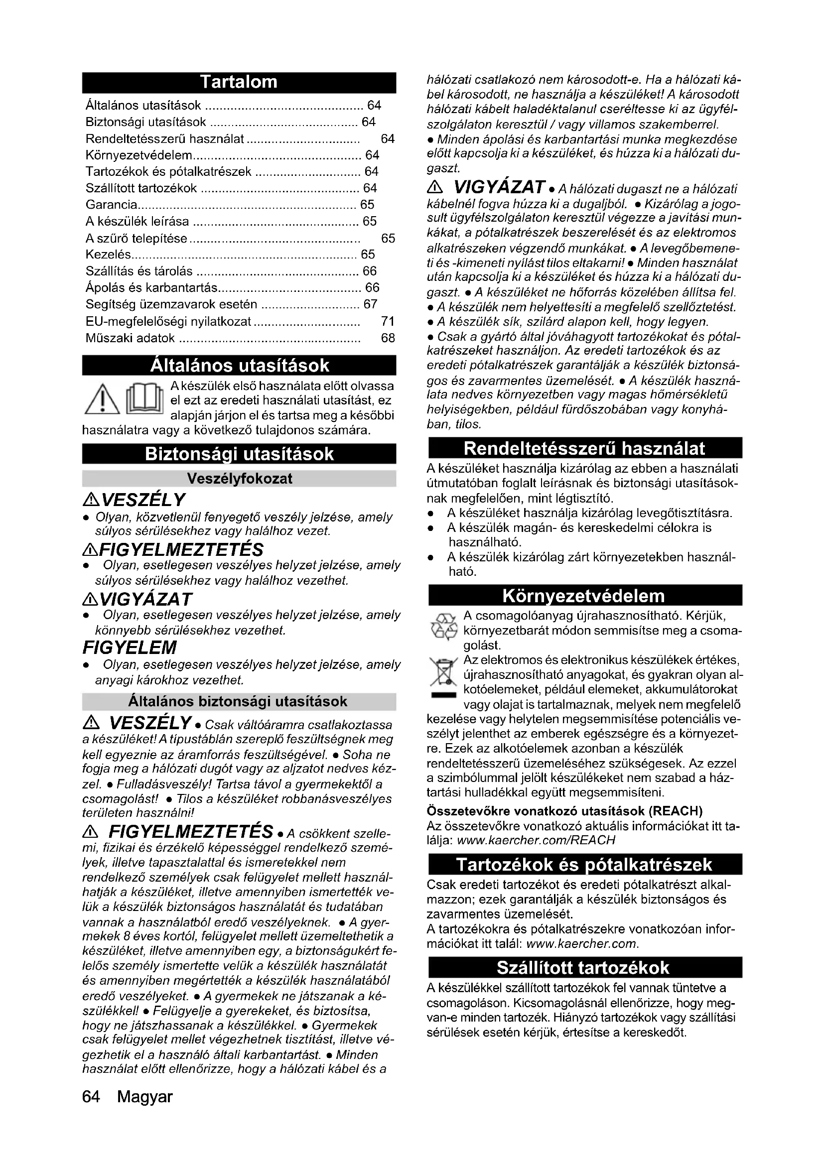- Biztonsági utasítások p. 64