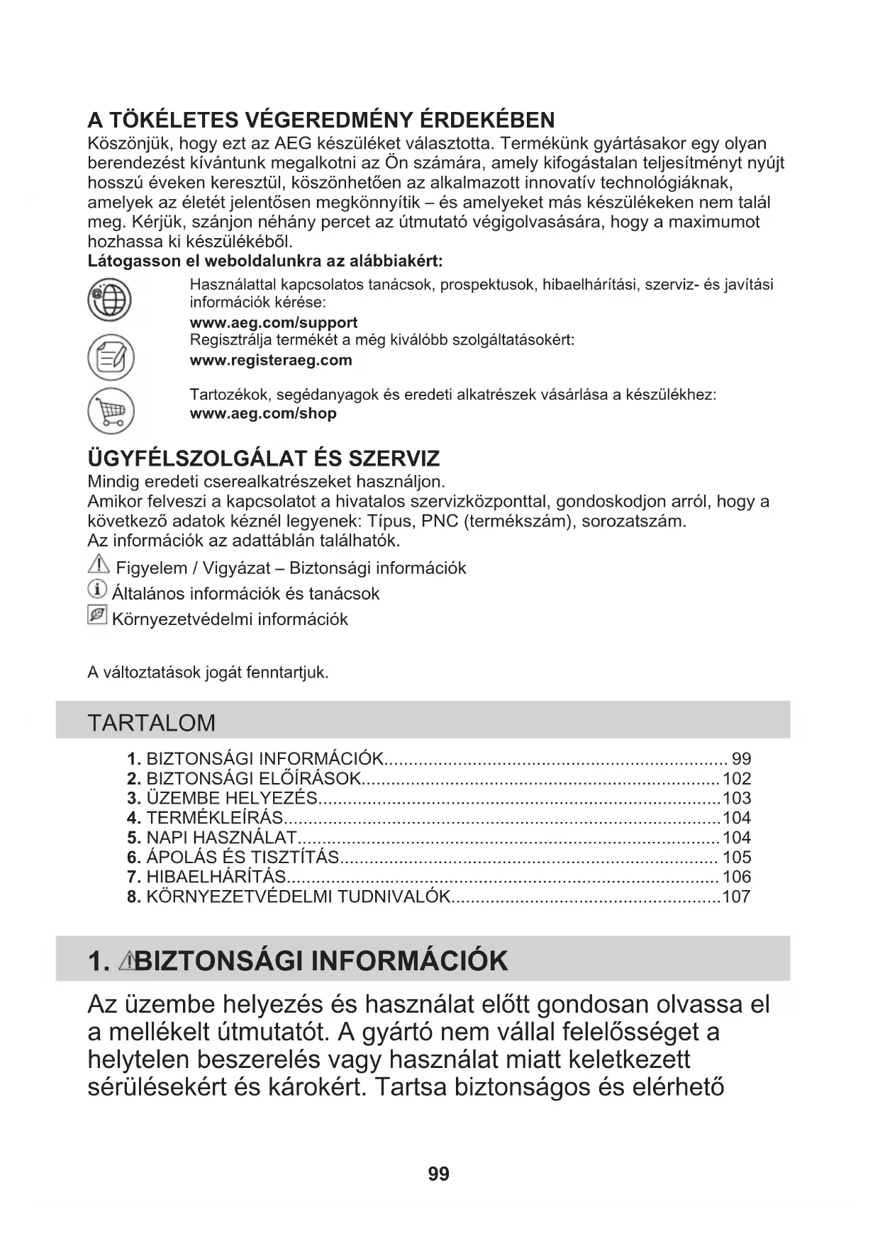 Mindig eredeti cserealkatrészeket használjon.Amikor felveszi a kapcsolatot a hivatalos szervizközponttal, gondoskodjon arról, hogy akövetkező adatok kéznél legyenek: Típus, PNC (termékszám), sorozatszám.Az információk az adattáblán találhatók. Figyelem / Vigyázat – Biztonsági információk Általános információk és tanácsok Környezetvédelmi információkA változtatások jogát fenntartjuk. TARTALOM