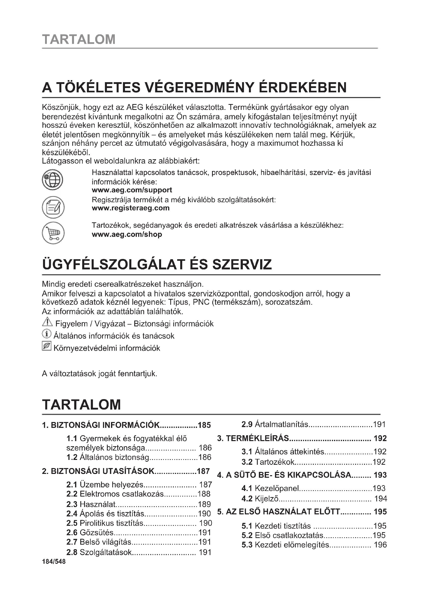 L'ENVIRONNEMENT Recyclez les matériaux portant le symbole . Déposez les emballages dans les conteneurs prévus à cet effet. Contribuez à la protection de l'environnement et à votre sécurité, recyclez vos produits électriques et électroniques. Ne jetez pas les appareils portant le symbole avec les ordures ménagères. Emmenez un tel produit dans votre centre local de recyclage ou contactez vos services municipaux. 183/548 PRENEZ UN RACCOURCI !A TÖKÉLETES VÉGEREDMÉNY ÉRDEKÉBEN Köszönjük, hogy ezt az AEG készüléket választotta. Termékünk gyártásakor egy olyan berendezést kívántunk megalkotni az Ön számára, amely kifogástalan teljesítményt nyújt hosszú éveken keresztül, köszönhetően az alkalmazott innovatív technológiáknak, amelyek az életét jelentősen megkönnyítik – és amelyeket más készülékeken nem talál meg. Kérjük, szánjon néhány percet az útmutató végigolvasására, hogy a maximumot hozhassa ki készülékéből. Látogasson el weboldalunkra az alábbiakért: Használattal kapcsolatos tanácsok, prospektusok, hibaelhárítási, szerviz- és javítási információk kérése: www.aeg.com/support Regisztrálja termékét a még kiválóbb szolgáltatásokért: www.registeraeg.com Tartozékok, segédanyagok és eredeti alkatrészek vásárlása a készülékhez: www.aeg.com/shop