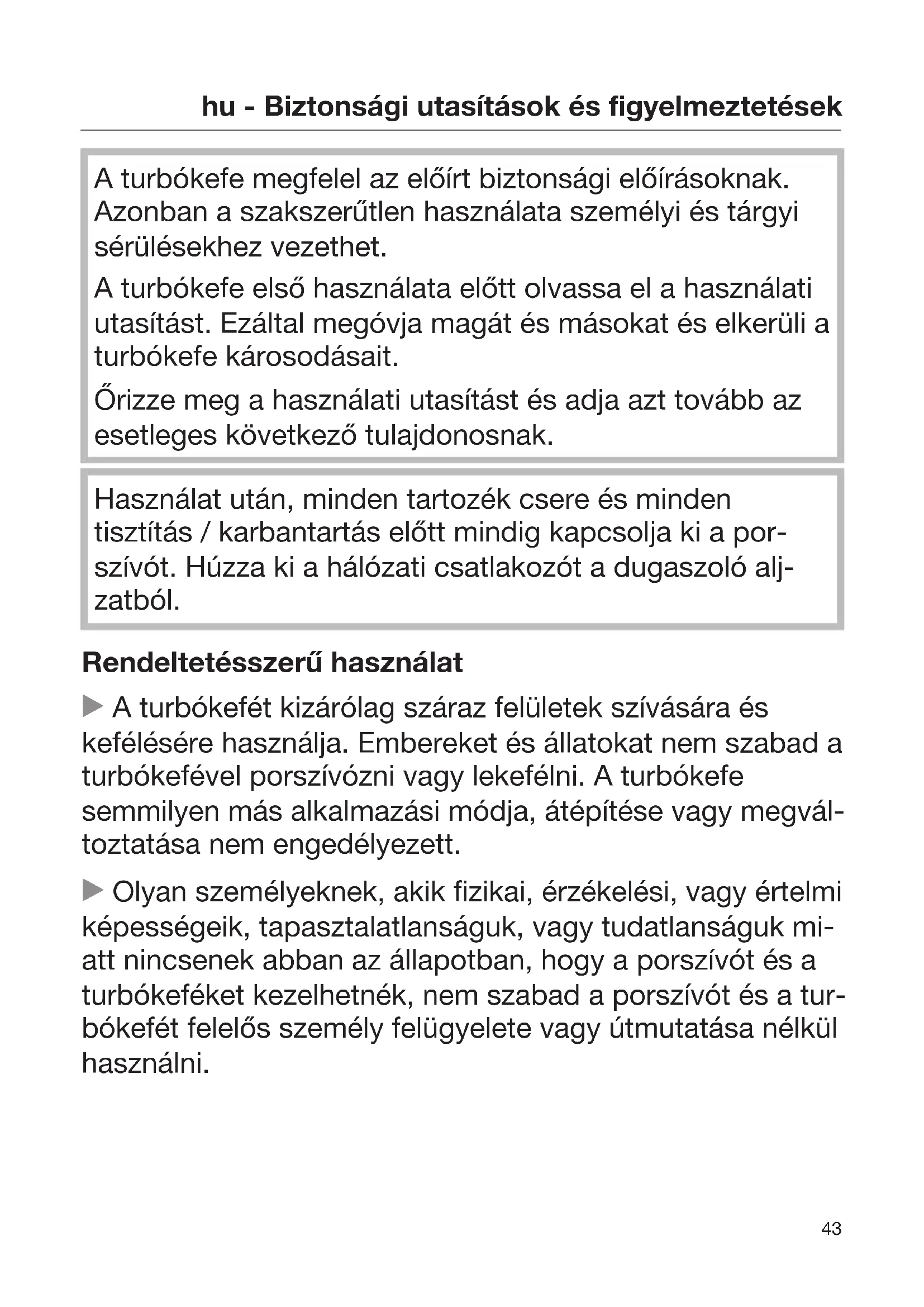 A turbókefe megfelel az előírt biztonsági előírásoknak. Azonban a szakszerűtlen használata személyi és tárgyi sérülésekhez vezethet. A turbókefe első használata előtt olvassa el a használati utasítást. Ezáltal megóvja magát és másokat és elkerüli a turbókefe károsodásait. Őrizze meg a használati utasítást és adja azt tovább az esetleges következő tulajdonosnak. Használat után, minden tartozék csere és minden tisztítás / karbantartás előtt mindig kapcsolja ki a por- szívót. Húzza ki a hálózati csatlakozót a dugaszoló alj- zatból. Rendeltetésszerű használat A turbókefét kizárólag száraz felületek szívására és kefélésére használja. Embereket és állatokat nem szabad a turbókefével porszívózni vagy lekefélni. A turbókefe semmilyen más alkalmazási módja, átépítése vagy megvál- toztatása nem engedélyezett. Olyan személyeknek, akik fizikai, érzékelési, vagy értelmi képességeik, tapasztalatlanságuk, vagy tudatlanságuk mi- att nincsenek abban az állapotban, hogy a porszívót és a turbókeféket kezelhetnék, nem szabad a porszívót és a tur- bókefét felelős személy felügyelete vagy útmutatása nélkül használni.hu - Biztonsági utasítások és figyelmeztetések