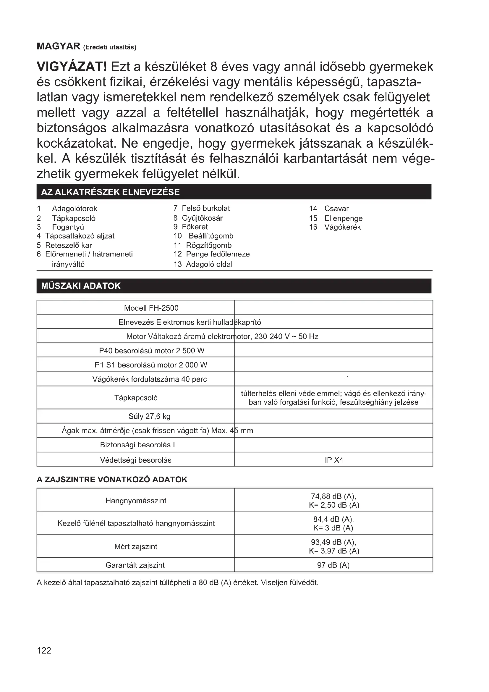 Modell FH-2500 Elnevezés Elektromos kerti hulladékaprító Motor Váltakozó áramú elektromotor, 230-240 V ~ 50 Hz P40 besorolású motor 2 500 W P1 S1 besorolású motor 2 000 W Vágókerék fordulatszáma 40 perc