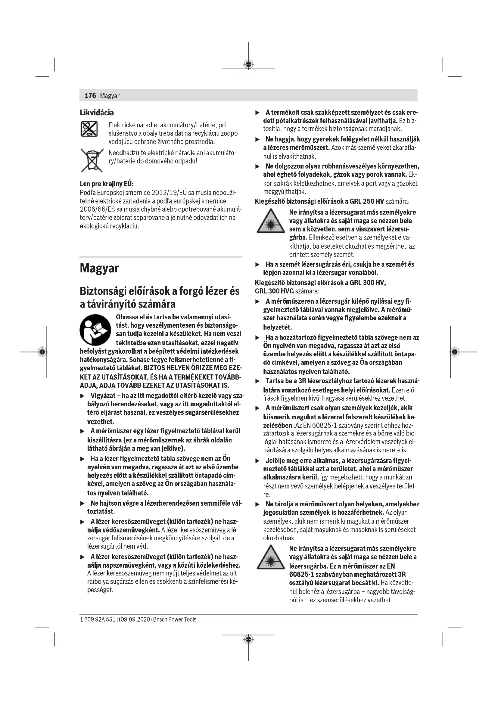 Prekročený rozsah samonivelácie 2×/s ○ ● Aktivovaná výstraha pred otrasmi ● Spustená výstraha pred otrasom 2×/s ○ 2×/s Napätie batérie/akumulátora na ≤2h pre- vádzky 2×/s Batérie/akumulátory vybité ○ ○ ● ●:trvalá prevádzka 2×/s: frekvencia blikania (napr. dvakrát za sekundu) ○:funkcia zastavená Údržba aservis Údržba a čistenie Merací prístroj, nabíjačku adiaľkové ovládanie udržiavajte vždy čisté. Neponárajte merací prístroj, nabíjačku adiaľkové ovládanie do vody ani do iných kvapalín. Znečistenia utrite vlhkou mäkkou handričkou. Nepoužívajte žiadne čistiace prostriedky či rozpúšťadlá. Čistite na meracom prístroji pravidelne predovšetkým plochy na výstupnom otvore lasera adávajte pozor, aby ste pritom odstránili zachytené vlákna tkaniny. Zákaznícka služba aporadenstvo ohľadom použitia Servisné stredisko Vám odpovie na otázky týkajúce sa opravy aúdržby Vášho produktu ako aj náhradných dielov. Rozkladové výkresy ainformácie onáhradných dieloch náj- dete tiež na: www.bosch-pt.com Vprípade otázok týkajúcich sa našich výrobkov apríslušen- stva Vám ochotne pomôže poradenský tím Bosch. Vprípade akýchkoľvek otázok aobjednávok náhradných dielov uvádzajte bezpodmienečne 10‑miestne vecné číslo uvedené na typovom štítku výrobku. Slovakia Na www.bosch-pt.sk si môžete objednať opravu vášho stroja alebo náhradné diely online. Tel.: +421 2 48 703 800 Fax: +421 2 48 703 801 E-Mail: servis.naradia@sk.bosch.com www.bosch-pt.sk Ďalšie adresy servisov nájdete na: www.bosch-pt.com/serviceaddresses Bosch Power Tools 1 609 92A 5S1 | (09.09.2020)176 | Magyar Likvidácia Elektrické náradie, akumulátory/batérie, prí- slušenstvo aobaly treba dať na recykláciu zodpo- vedajúcu ochrane životného prostredia. Neodhadzujte elektrické náradie ani akumuláto- ry/batérie do domového odpadu! Len pre krajinyEÚ: Podľa Európskej smernice 2012/19/EÚ sa musia nepouži- teľné elektrické zariadenia apodľa európskej smernice 2006/66/ES sa musia chybné alebo opotrebované akumulá- tory/batérie zbierať separovane aje nutné odovzdať ich na ekologickú recykláciu. Magyar Biztonsági előírások a forgó lézer és a távirányító számára Olvassa el és tartsa be valamennyi utasí- tást, hogy veszélymentesen és biztonságo- san tudja kezelni a készüléket. Ha nem veszi tekintetbe ezen utasításokat, ezzel negatív befolyást gyakorolhat a beépített védelmi intézkedések hatékonyságára. Sohase tegye felismerhetetlenné a fi- gyelmeztető táblákat. BIZTOS HELYEN ŐRIZZE MEG EZE- KET AZ UTASÍTÁSOKAT, ÉS HA A TERMÉKEKET TOVÁBB- ADJA, ADJA TOVÁBB EZEKET AZ UTASÍTÁSOKAT IS. u Vigyázat – ha az itt megadottól eltérő kezelő vagy sza- bályozó berendezéseket, vagy az itt megadottaktól el- térő eljárást használ, ez veszélyes sugársérülésekhez vezethet. u A mérőműszer egy lézer figyelmeztető táblával kerül kiszállításra (ez a mérőműszernek az ábrák oldalán látható ábráján a meg van jelölve). u Ha a lézer figyelmeztető tábla szövege nem az Ön nyelvén van megadva, ragassza át azt az első üzembe helyezés előtt a készülékkel szállított öntapadó cím- kével, amelyen a szöveg az Ön országában használa- tos nyelven található. u Ne hajtson végre a lézerberendezésen semmiféle vál- toztatást. u A lézer keresőszemüveget (külön tartozék) ne hasz- nálja védőszemüvegként. A lézer keresőszemüveg a lé- zersugár felismerésének megkönnyítésére szolgál, de a lézersugártól nem véd. u A lézer keresőszemüveget (külön tartozék) ne hasz- nálja napszemüvegként, vagy a közúti közlekedéshez. A lézer keresőszemüveg nem nyújt teljes védelmet az ult- raibolya sugárzás ellen és csökkenti a színfelismerési ké- pességet. u A termékeit csak szakképzett személyzet és csak ere- deti pótalkatrészek felhasználásával javíthatja. Ez biz- tosítja, hogy a termékek biztonságosak maradjanak. u Ne hagyja, hogy gyerekek felügyelet nélkül használják a lézeres mérőműszert. Azok más személyeket akaratla- nul is elvakíthatnak. u Ne dolgozzon olyan robbanásveszélyes környezetben, ahol éghető folyadékok, gázok vagy porok vannak. Ek- kor szikrák keletkezhetnek, amelyek a port vagy a gőzöket meggyújthatják. Kiegészítő biztonsági előírások a GRL250HV számára: Ne irányítsa a lézersugarat más személyekre vagy állatokra és saját maga se nézzen bele sem a közvetlen, sem a visszavert lézersu- gárba. Ellenkező esetben a személyeket elva- kíthatja, baleseteket okozhat és megsértheti az érintett személy szemét. u Ha a szemét lézersugárzás éri, csukja be a szemét és lépjen azonnal ki a lézersugár vonalából. Kiegészítő biztonsági előírások a GRL300HV, GRL300HVG számára: u A mérőműszeren a lézersugár kilépő nyílásai egy fi- gyelmeztető táblával vannak megjelölve. A mérőmű- szer használata során vegye figyelembe ezeknek a helyzetét. u Ha a hozzátartozó figyelmeztető tábla szövege nem az Ön nyelvén van megadva, ragassza át azt az első üzembe helyezés előtt a készülékkel szállított öntapa- dó címkével, amelyen a szöveg az Ön országában használatos nyelven található. u Tartsa be a 3R lézerosztályhoz tartozó lézerek haszná- latára vonatkozó esetleges helyi előírásokat. Ezen elő- írások figyelmen kívül hagyása sérülésekhez vezethet. u A mérőműszert csak olyan személyek kezeljék, akik kiismerik magukat a lézerrel felszerelt készülékek ke- zelésében .Az EN 60825-1 szabvány szerint ehhez hoz- zátartozik a lézersugárnak a szemekre és a bőrre való bio- lógiai hatásának ismerete és a lézervédelem veszélyek el- hárítására szolgáló helyes alkalmazásának ismerete is. u Jelölje meg erre alkalmas, a lézersugárz