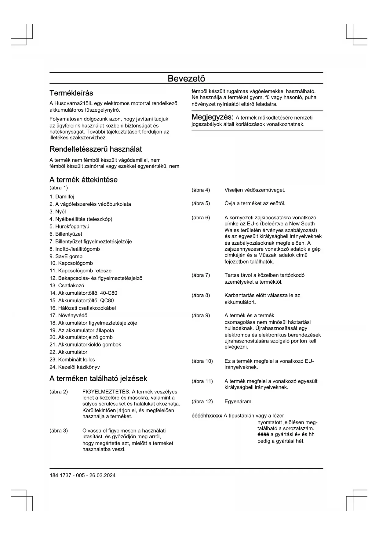 - Huskvarna, 2024-02-01 Claes Losdal, Menadžer odjela za istraživanje i razvoj, Husqvarna AB Osoba odgovorna za tehničku dokumentaciju TARTALOMJEGYZÉK Bevezető p. 184