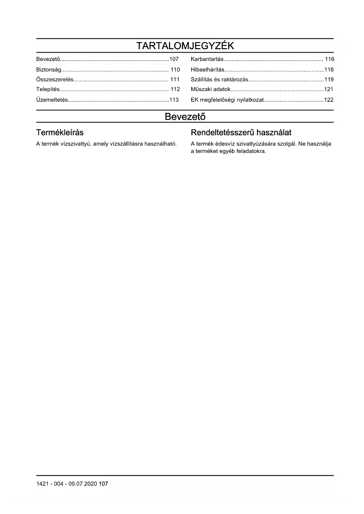- EK megfelelőségi nyilatkozat Bevezető Termékleírás A termék vízszivattyú, amely vízszállításra használható. Rendeltetésszerű használat A termék édesvíz szivattyúzására szolgál. Ne használja a terméket egyéb feladatokra. 1421 - 004 - 09.07.2020 107A termék áttekintése p. 122