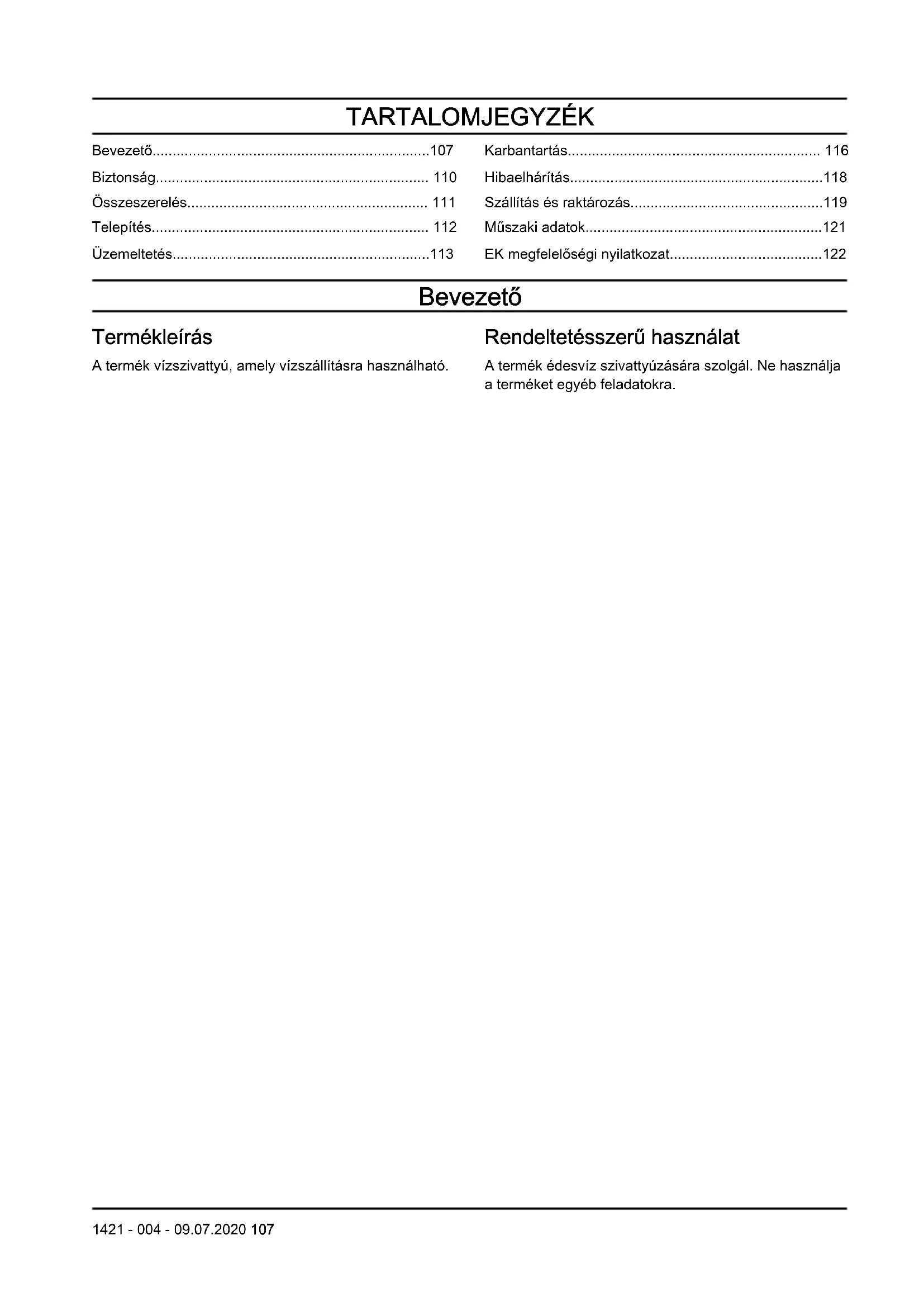 - EK megfelelőségi nyilatkozat Bevezető Termékleírás A termék vízszivattyú, amely vízszállításra használható. Rendeltetésszerű használat A termék édesvíz szivattyúzására szolgál. Ne használja a terméket egyéb feladatokra. 1421 - 004 - 09.07.2020 107A termék áttekintése p. 122