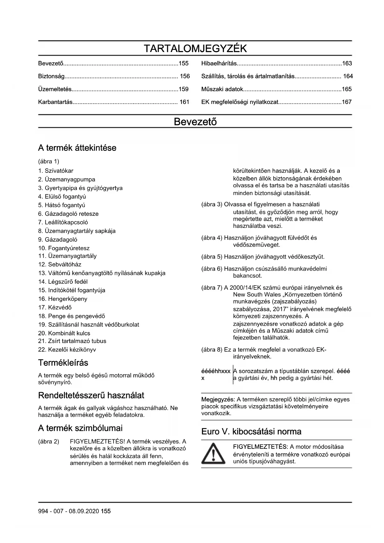 A sorozatszám a típustáblán szerepel. éééé a gyártási év, hh pedig a gyártási hét. Megjegyzés: A terméken szereplő többi jel/címke egyes piacok specifikus vizsgáztatási követelményeire vonatkozik. Euro V. kibocsátási norma FIGYELMEZTETÉS: A motor módosítása érvényteleníti a termékre vonatkozó európai uniós típusjóváhagyást.