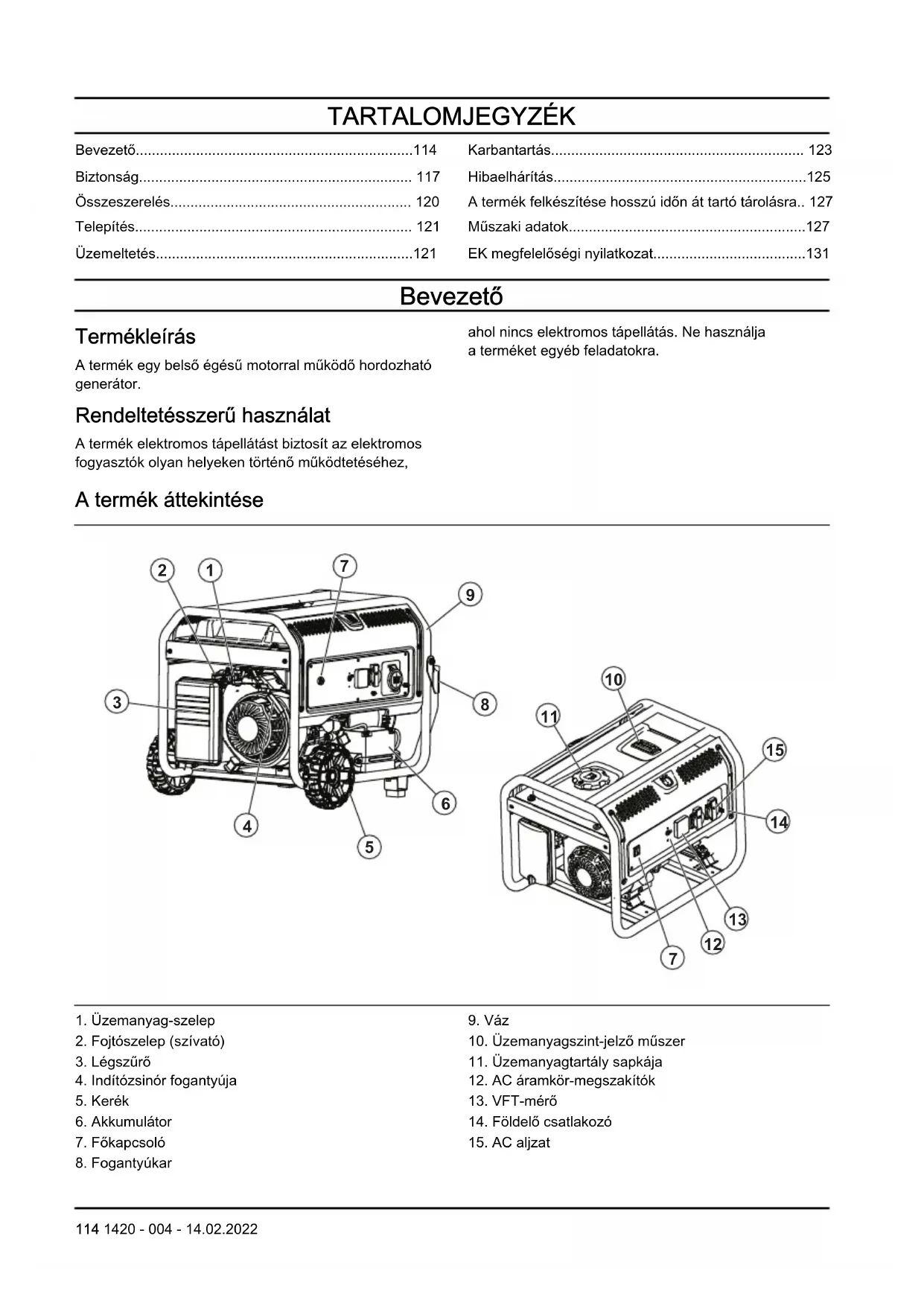 - EK megfelelőségi nyilatkozat Bevezető Termékleírás A termék egy belső égésű motorral működő hordozható generátor. Rendeltetésszerű használat A termék elektromos tápellátást biztosít az elektromos fogyasztók olyan helyeken történő működtetéséhez, ahol nincs elektromos tápellátás. Ne használja a terméket egyéb feladatokra. A termék áttekintése p. 131