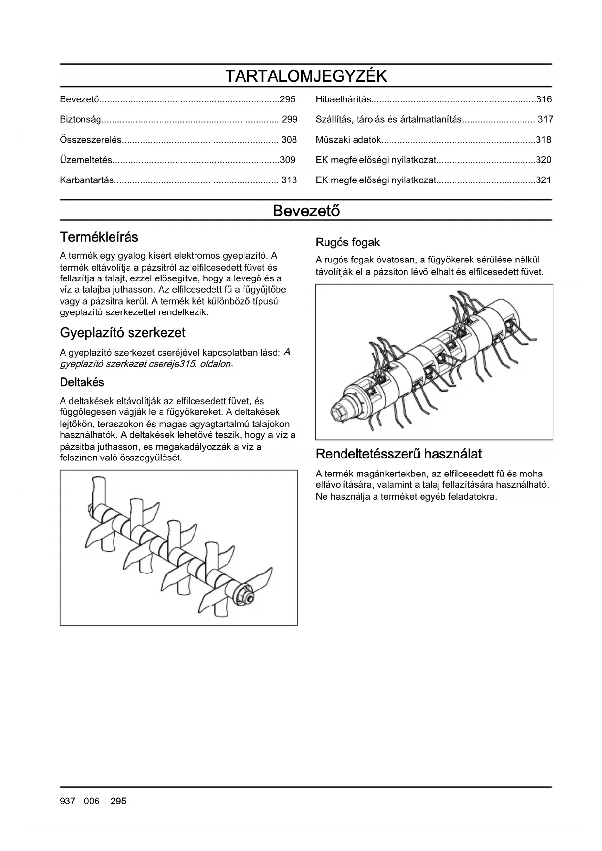 - EK megfelelőségi nyilatkozat Bevezető Termékleírás A termék egy gyalog kísért elektromos gyeplazító. A termék eltávolítja a pázsitról az elfilcesedett füvet és fellazítja a talajt, ezzel elősegítve, hogy a levegő és a víz a talajba juthasson. Az elfilcesedett fű a fűgyűjtőbe vagy a pázsitra kerül. A termék két különböző típusú gyeplazító szerkezettel rendelkezik. Gyeplazító szerkezet A gyeplazító szerkezet cseréjével kapcsolatban lásd: p. 321